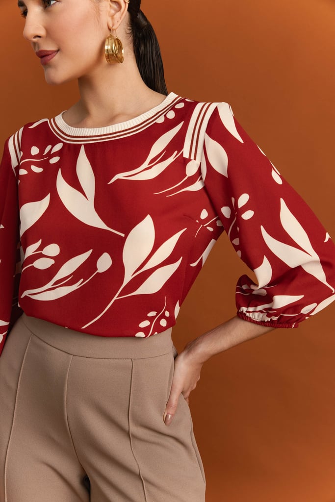 Blusa confeccionada em tecido de crepe estampado. Possui decote redondo e manga 3/4. O charme da peça fica por conta da retilínea no decote e recorte do ombro.