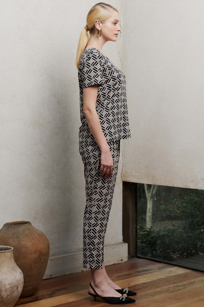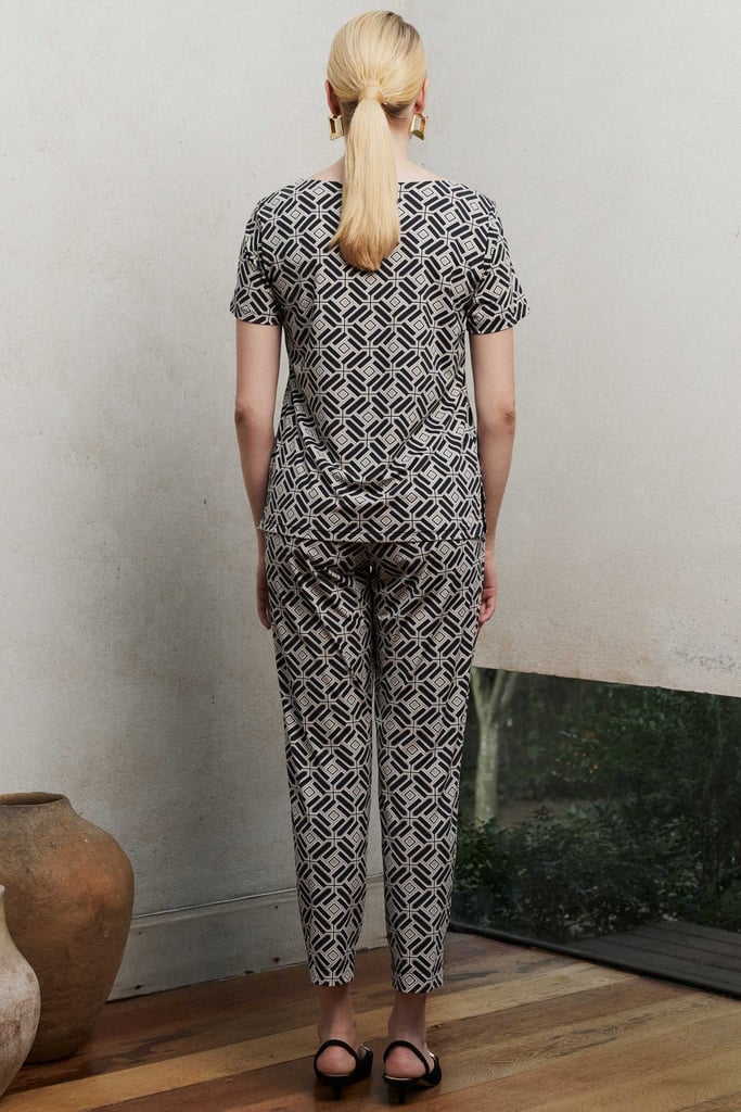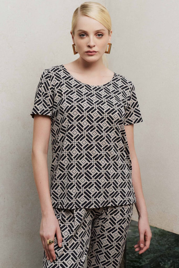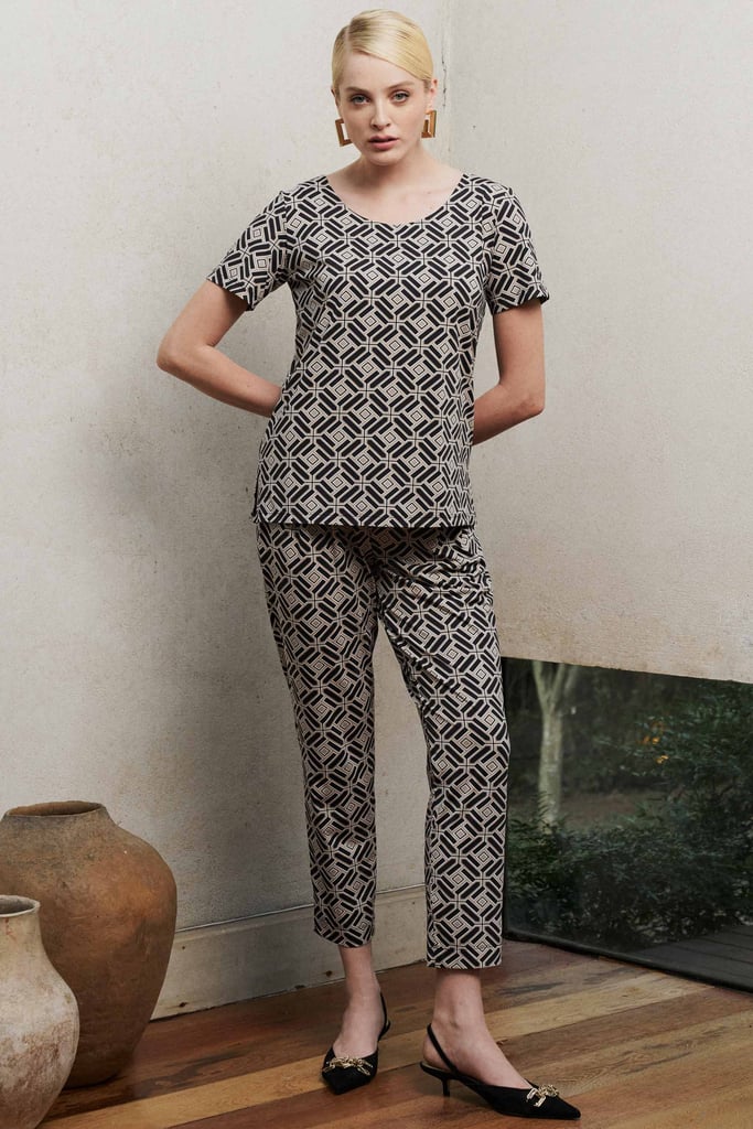 Confeccionado em tecido de malha Fluity, o conjunto é superconfortável, tem o toque geladinho e não amassa. A blusa possui decote redondo e manga curta. A calça traz nossa modelagem clássica reta com pregas frontais, bolsos laterais e cós com elástico embutido nas costas para maior conforto. A estampa é mais uma exclusividade Simple Life.