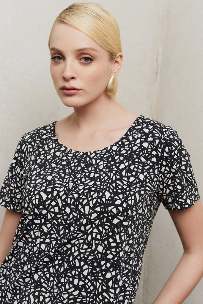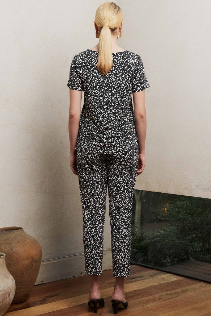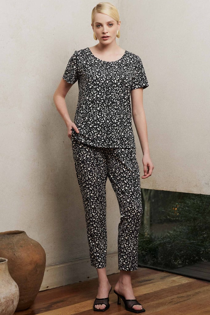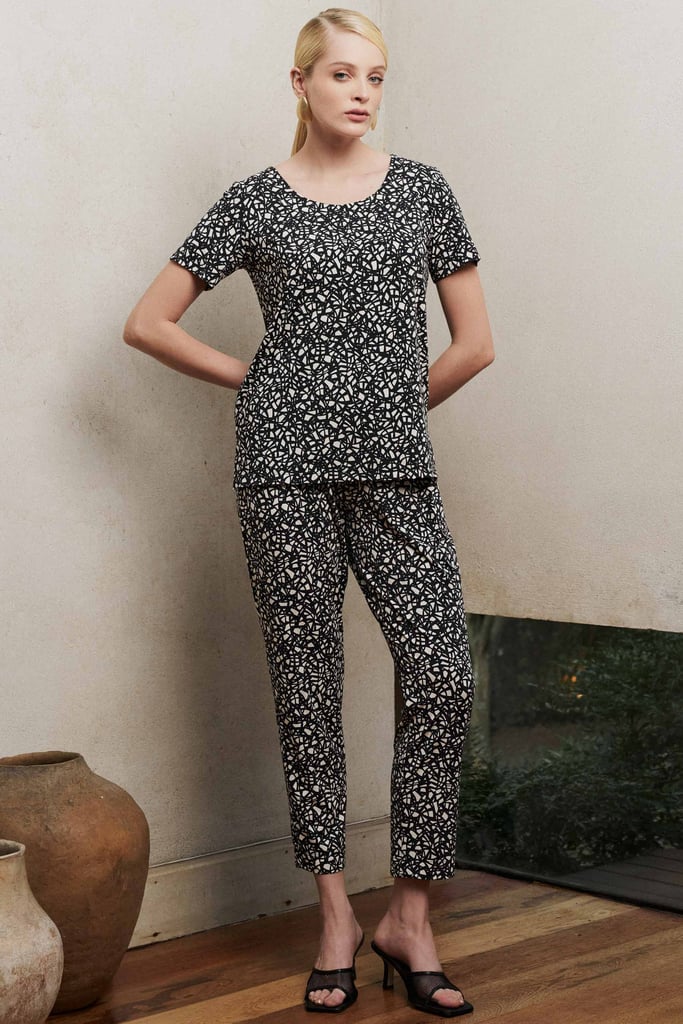 Confeccionado em tecido de malha Fluity, o conjunto é superconfortável, tem o toque geladinho e não amassa. A blusa possui decote redondo e manga curta. A calça traz nossa modelagem clássica reta com pregas frontais, bolsos laterais e cós com elástico embutido nas costas para maior conforto. A estampa é mais uma exclusividade Simple Life.