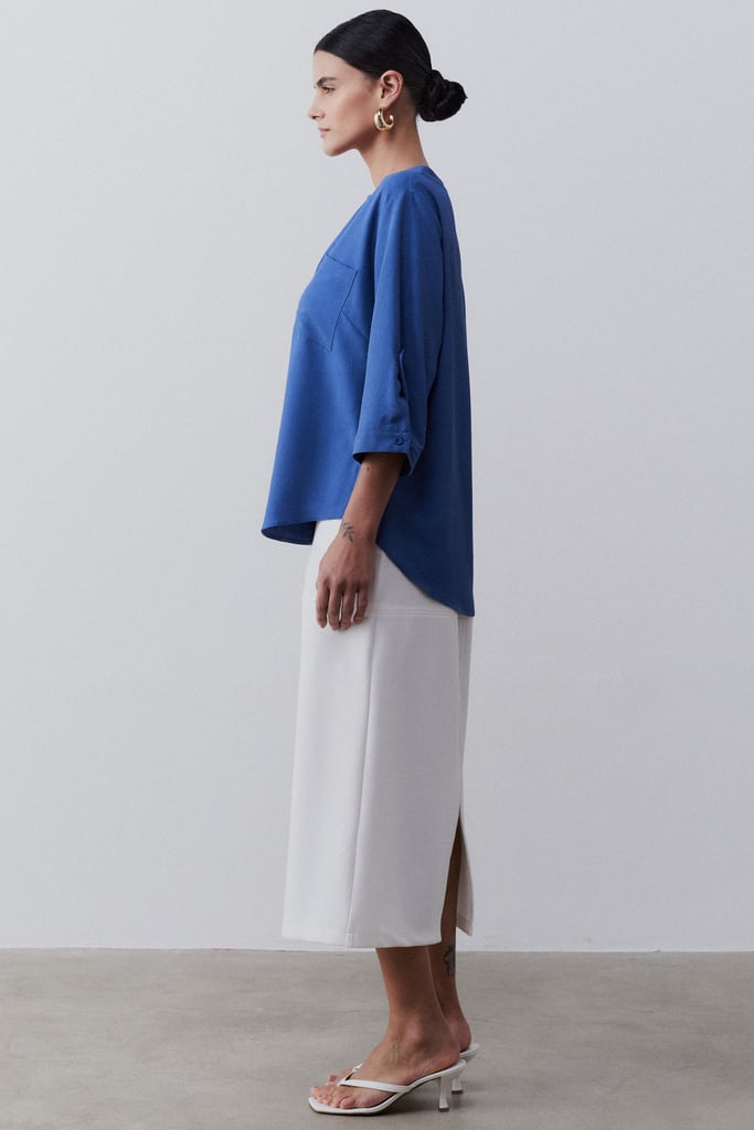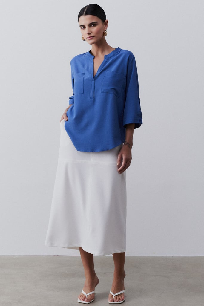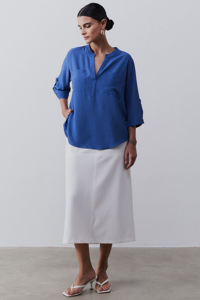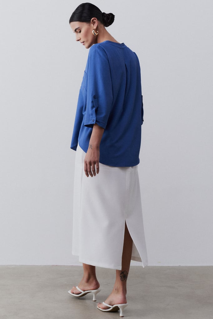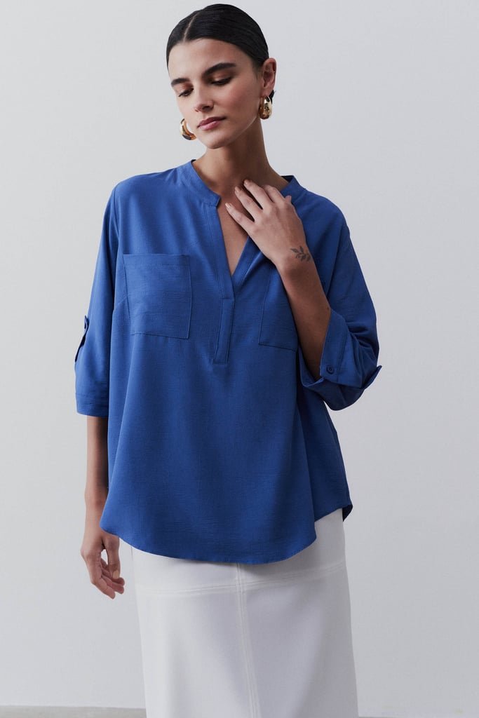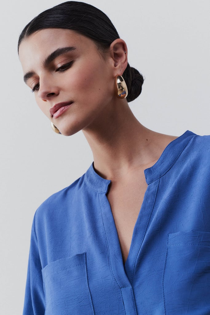 Esta blusa em crepe texturizado é o equilíbrio perfeito entre elegância e funcionalidade. A gola padre oferece um toque de sofisticação discreta, enquanto os bolsos frontais trazem praticidade ao design. As mangas 3/4, com punho e martingale, permitem o ajuste do comprimento, oferecendo versatilidade para se adaptar a diferentes ocasiões e temperaturas. O detalhe de prega nas costas adiciona movimento e estilo à peça, garantindo um caimento fluido e confortável. Ideal para o dia a dia ou para ocasiões mais formais, essa blusa é uma peça chave no guarda-roupa de qualquer mulher moderna.