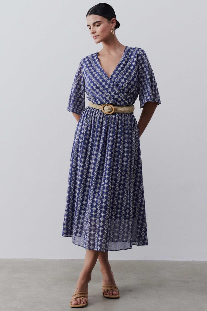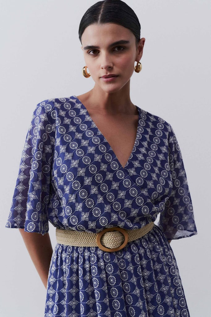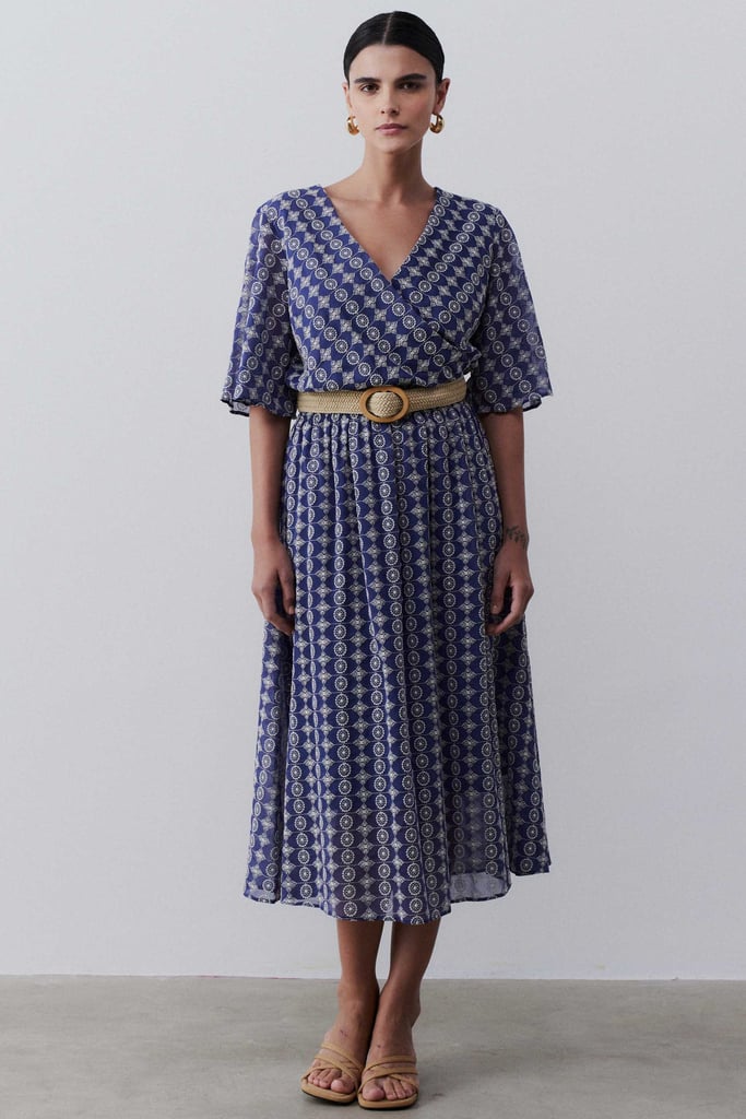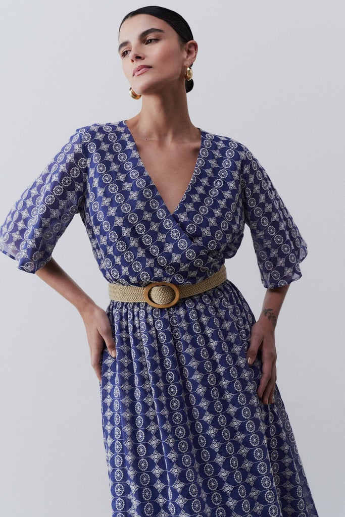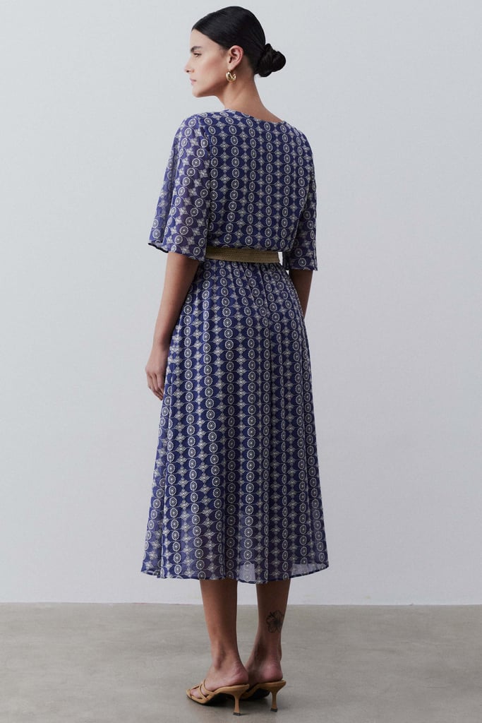 Este vestido midi em chiffon bordado é uma obra-prima de elegância e delicadeza. O decote transpassado cria uma linha suave e feminina, que realça o colo com sutileza. As mangas 3/4 tipo sino conferem um toque de movimento e fluidez, enquanto o detalhe em lastex na cintura garante um ajuste perfeito e confortável, destacando a silhueta de forma natural. A saia evasê, com seu comprimento midi, proporciona um caimento leve e gracioso, ideal para momentos que pedem sofisticação. Totalmente forrado, este vestido oferece o equilíbrio perfeito entre leveza e segurança, permitindo que você se sinta confiante e encantadora em qualquer ocasião.