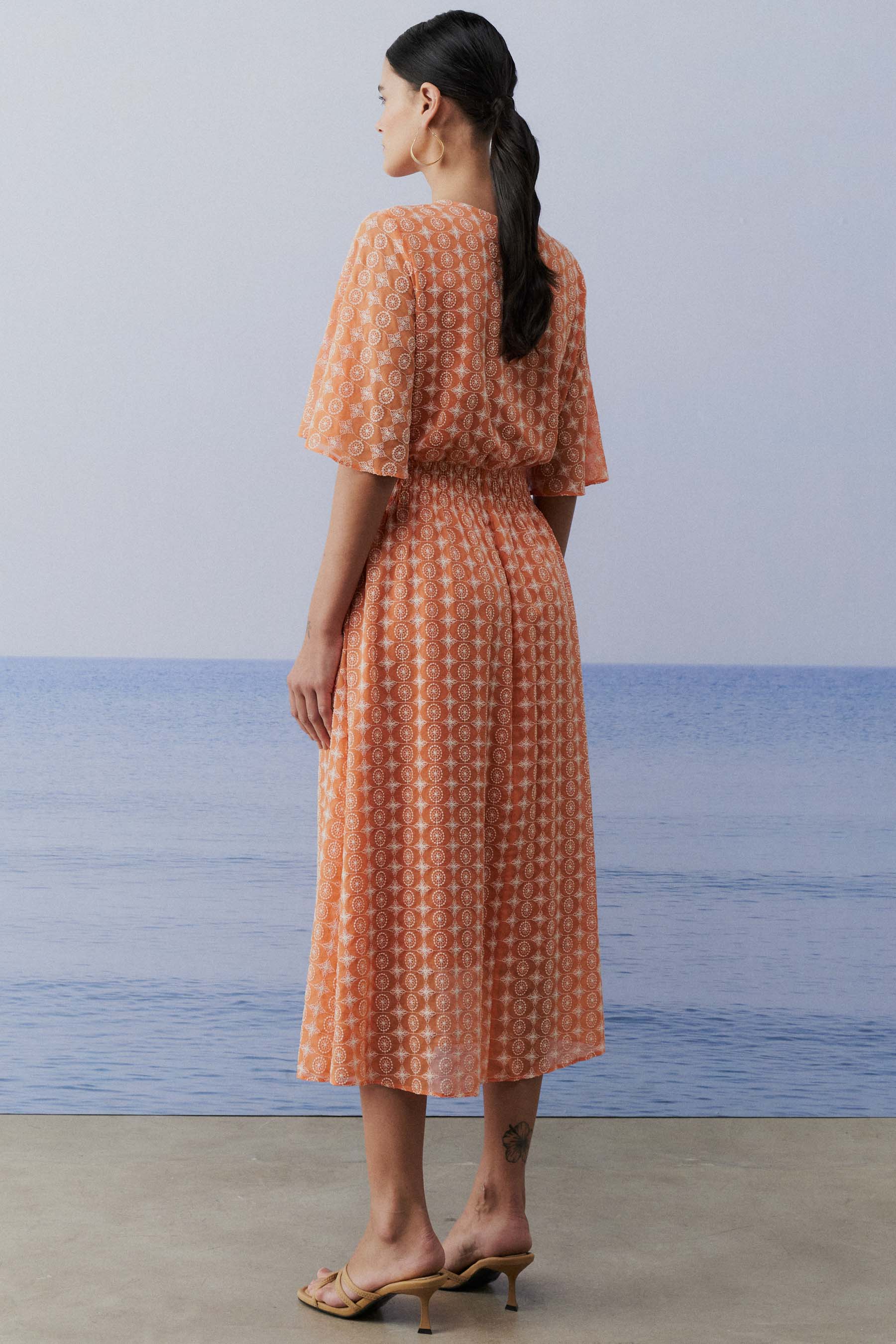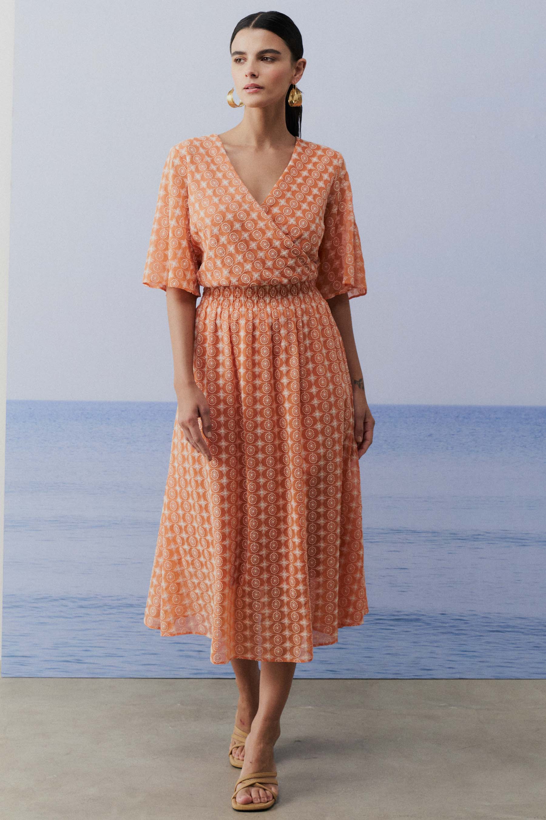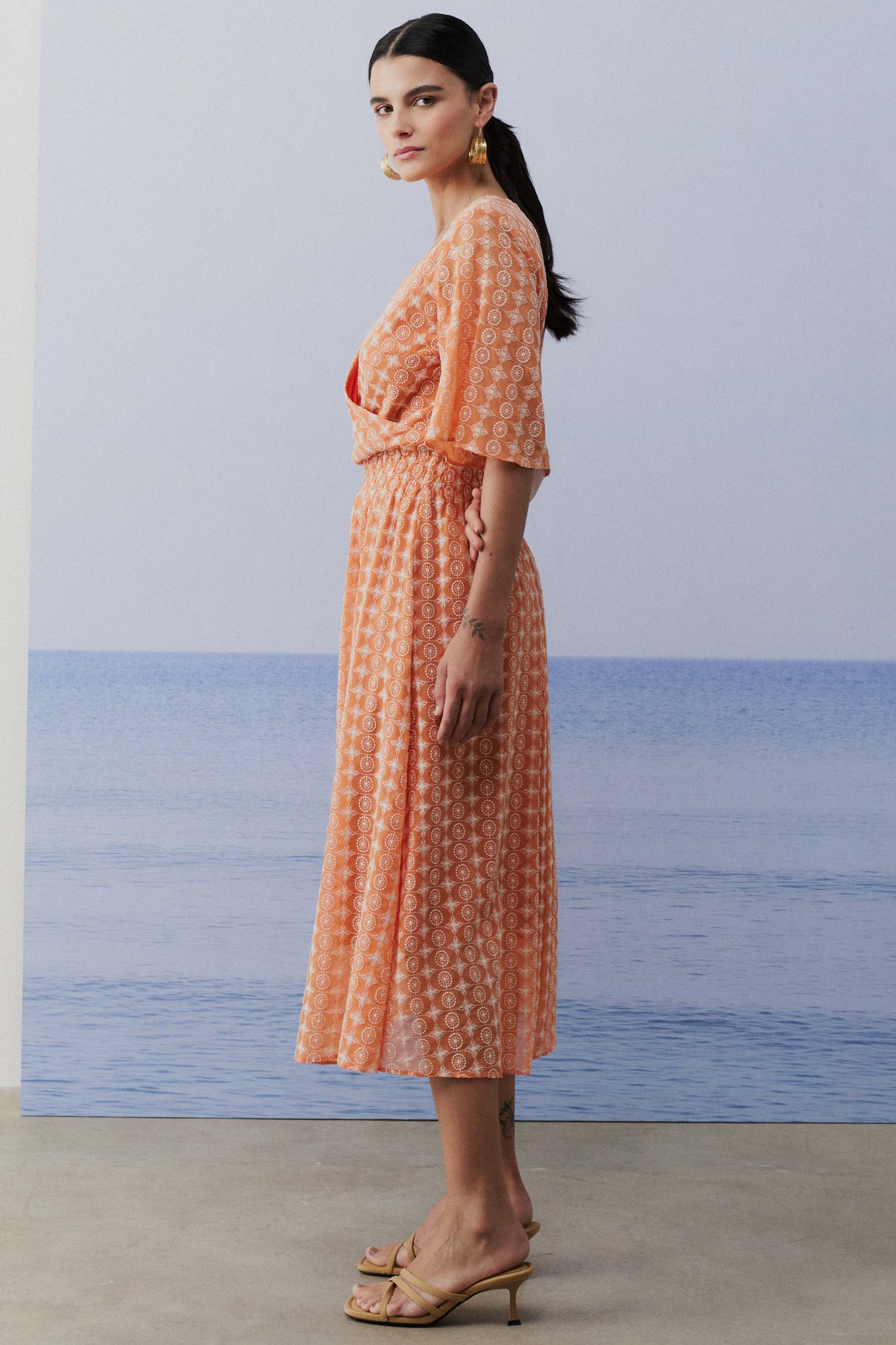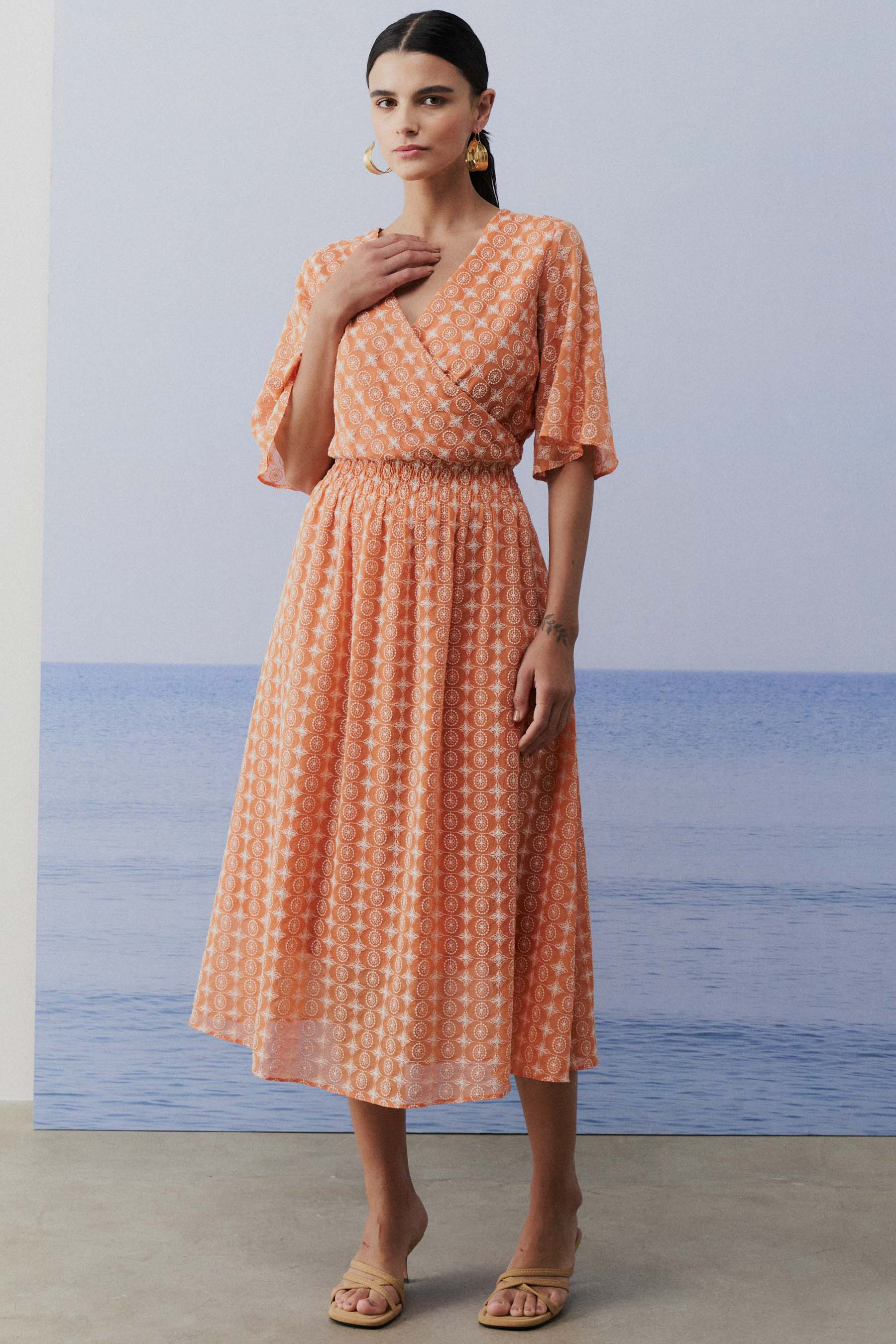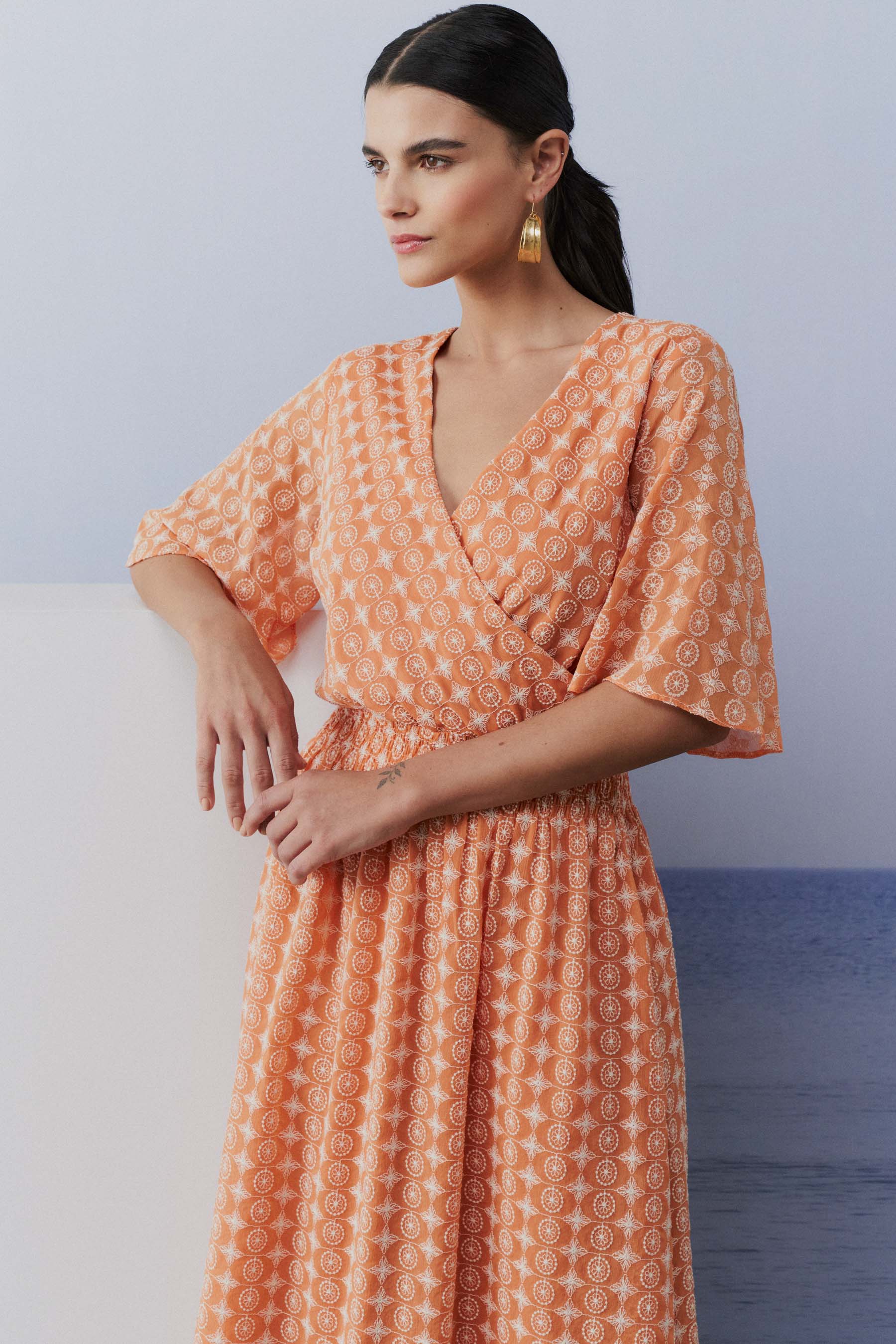 Este vestido midi em chiffon bordado é uma obra-prima de elegância e delicadeza. O decote transpassado cria uma linha suave e feminina, que realça o colo com sutileza. As mangas 3/4 tipo sino conferem um toque de movimento e fluidez, enquanto o detalhe em lastex na cintura garante um ajuste perfeito e confortável, destacando a silhueta de forma natural. A saia evasê, com seu comprimento midi, proporciona um caimento leve e gracioso, ideal para momentos que pedem sofisticação. Totalmente forrado, este vestido oferece o equilíbrio perfeito entre leveza e segurança, permitindo que você se sinta confiante e encantadora em qualquer ocasião.