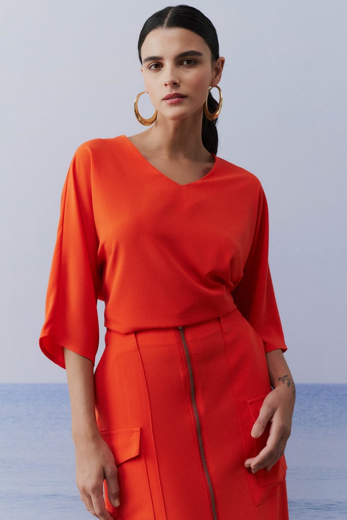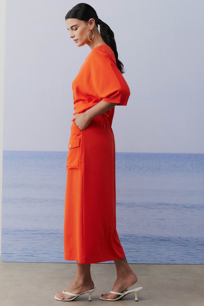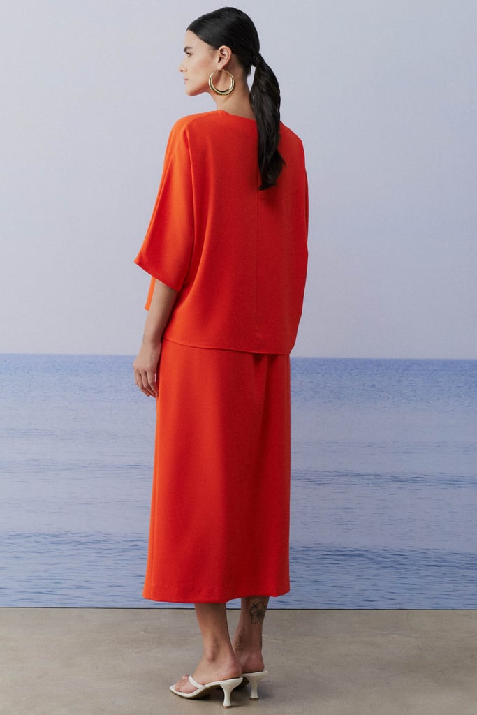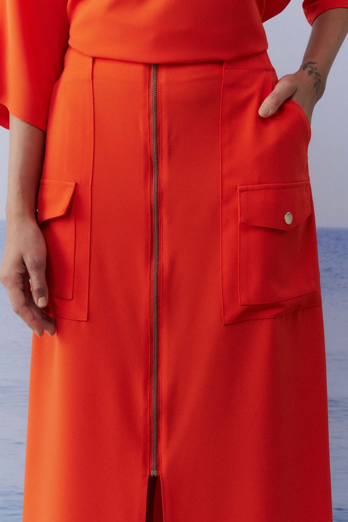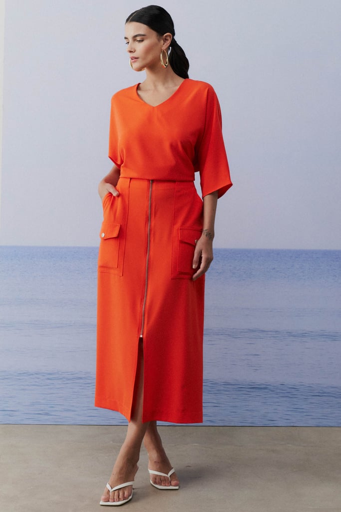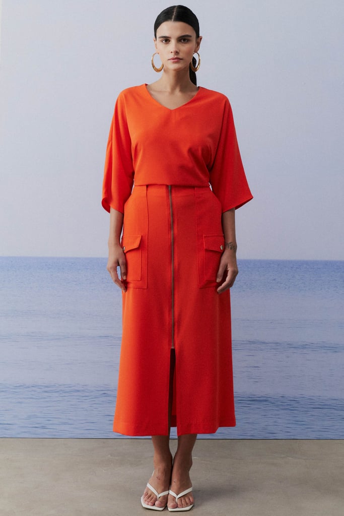 Este conjunto em crepe liso combina elegância e conforto com perfeição. A blusa, com sua modelagem ampla, oferece um caimento fluido e descontraído, destacando um decote V que valoriza o colo de maneira sutil. As mangas 3/4 adicionam um toque sofisticado e versátil, tornando a peça adequada para diferentes ocasiões. A saia, com sua modelagem reta e comprimento midi, proporciona um visual elegante e alongado. O fechamento frontal com zíper de metal e o bolso tipo cargo aplicado trazem um detalhe moderno e funcional. O cós com elástico nas costas garante um ajuste confortável e seguro, ideal para o dia a dia.