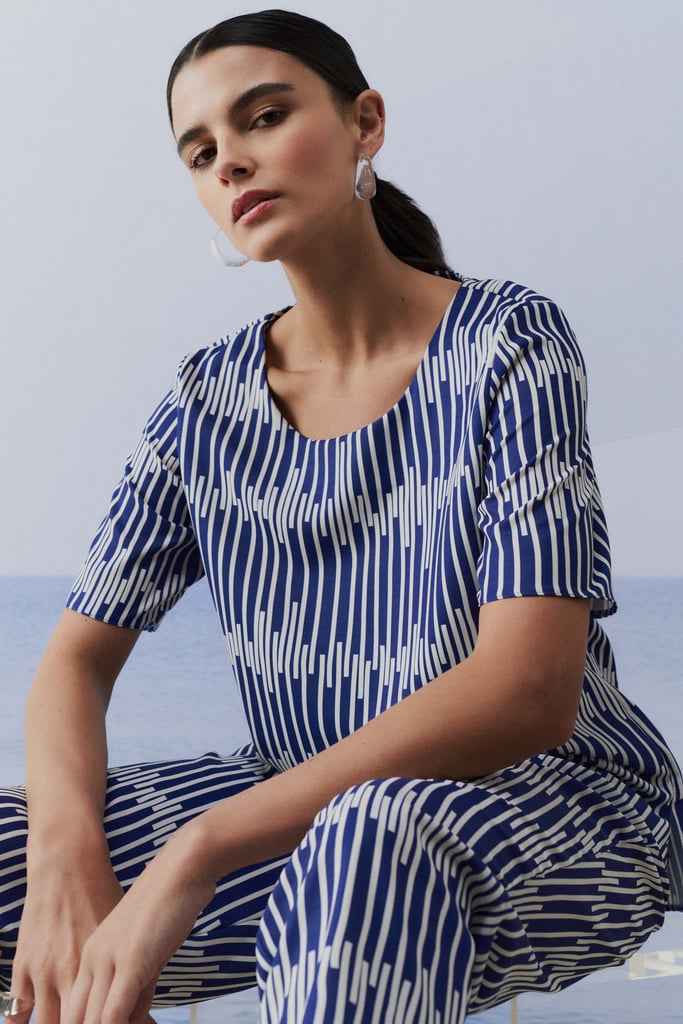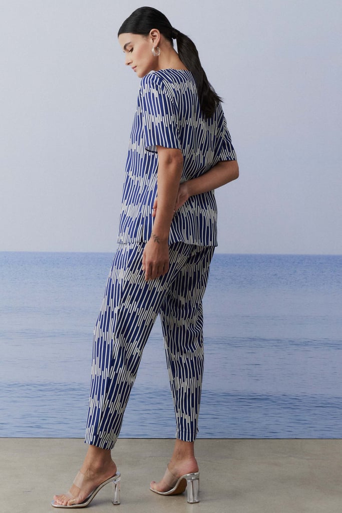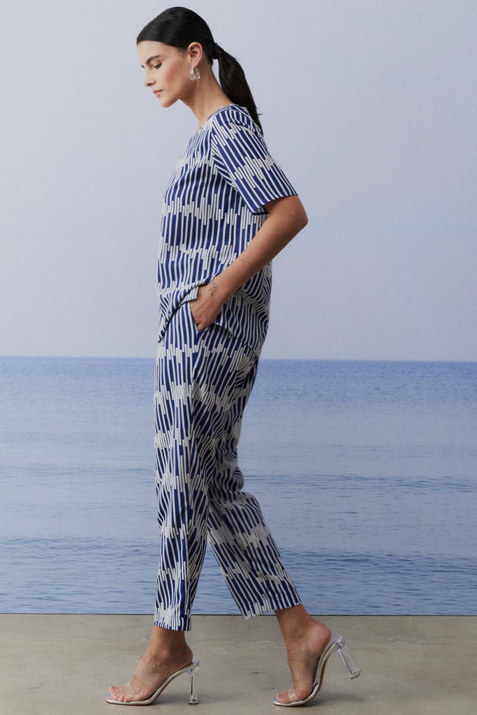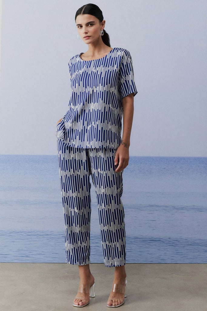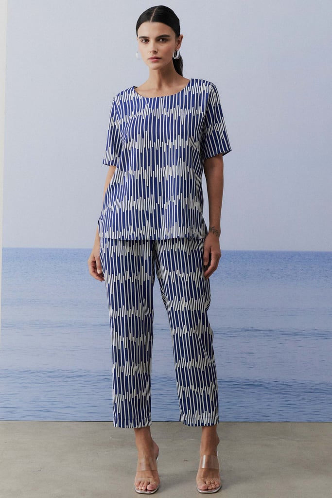 Este conjunto confeccionado em tecido de crepe estampado é a união perfeita entre estilo e conforto, ideal para quem busca uma peça versátil e sofisticada. A blusa possui um decote redondo clássico, que valoriza o colo com sutileza, e mangas curtas que oferecem um toque casual e prático, perfeito para os dias mais quentes. A calça, com nossa modelagem clássica reta, é projetada para proporcionar um caimento elegante e confortável. As pregas frontais adicionam um toque de sofisticação ao design, enquanto os bolsos laterais oferecem praticidade para o dia a dia. O cós com elástico nas costas garante um ajuste flexível, proporcionando ainda mais conforto sem comprometer o estilo. A estampa exclusiva Simple Life destaca a personalidade única do conjunto, trazendo um design único e moderno que reflete o cuidado e a originalidade da marca.