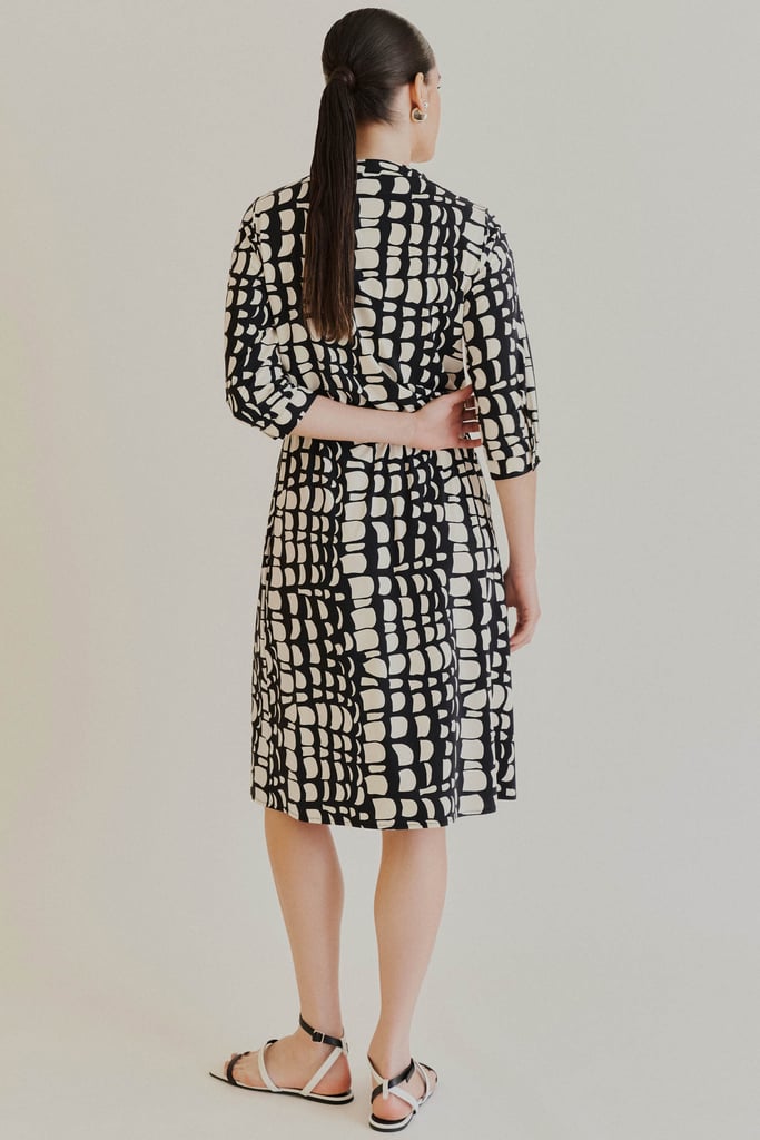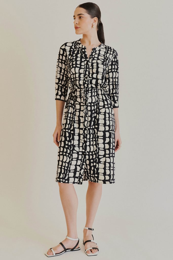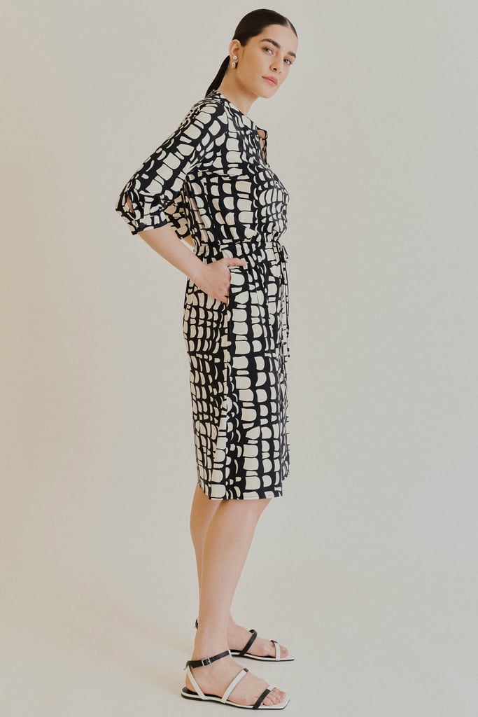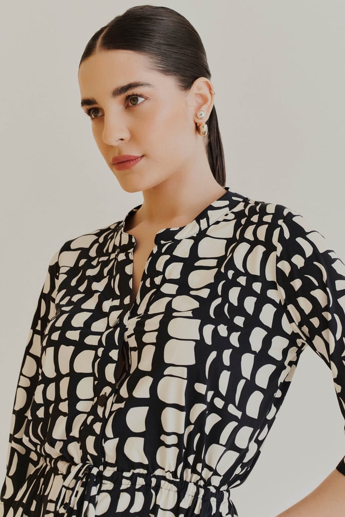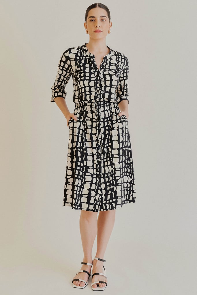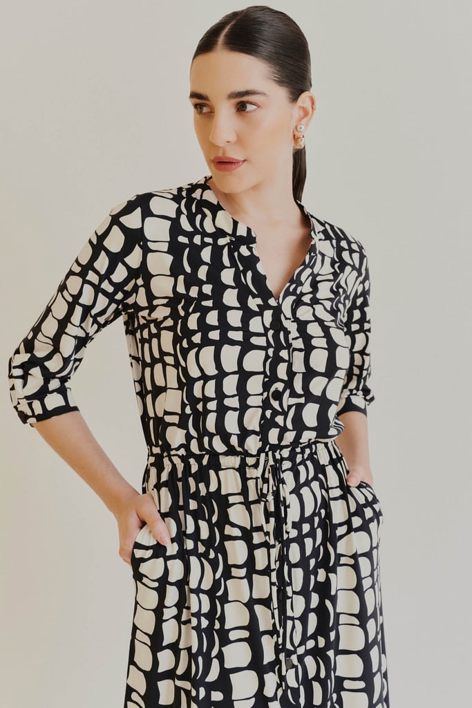 Este vestido chemise é confeccionado em tecido Fluity com uma estampa exclusiva que combina conforto e estilo. O tecido é superconfortável, com um toque geladinho que mantém a peça fresca e sem amassados durante todo o dia. O vestido possui gola padre e uma vista frontal fechada por botões, proporcionando um visual elegante e moderno. As mangas 3/4 vêm com punho e botão, adicionando um detalhe sofisticado. Bolsos laterais são práticos e complementam o design. Um toque especial é o detalhe de túnel e tira na cintura, que permite uma amarração personalizada, ajustando a peça ao seu corpo e acentuando a silhueta. Ideal para diversas ocasiões, este vestido combina facilidade de uso com um toque de sofisticação.