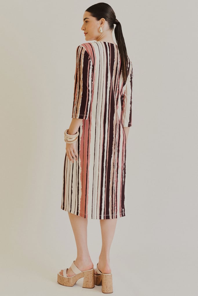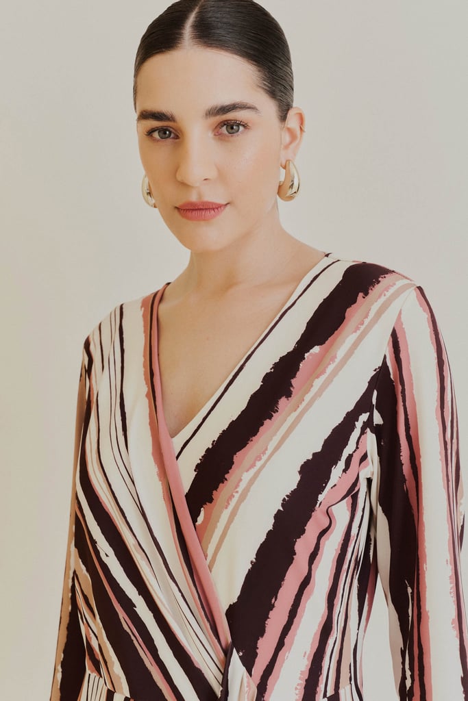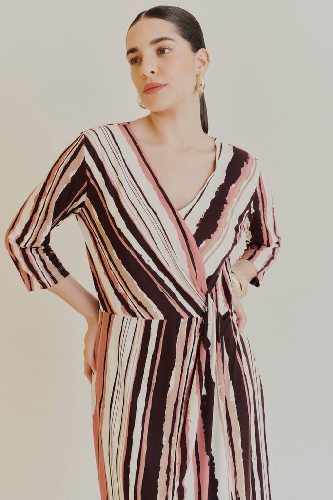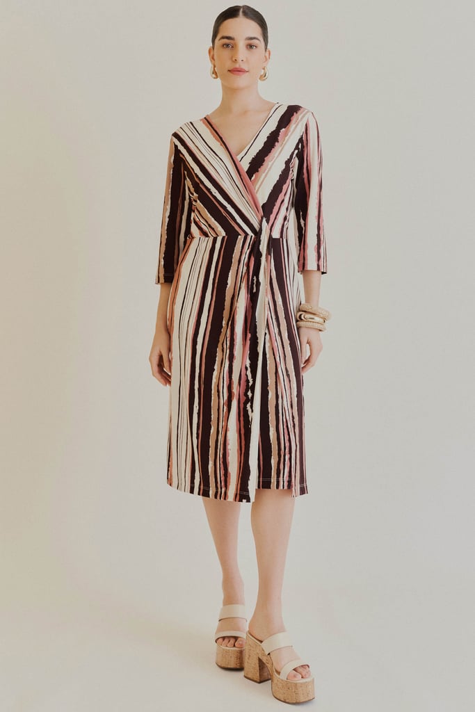 Confeccionado em malha jersey, este vestido traz um caimento leve, suave ao toque e com excelente fluidez. O modelo conta com um decote em V e mangas 3/4, equilibrando elegância e conforto. O comprimento midi oferece sofisticação e versatilidade, ideal para diversas ocasiões. O destaque especial está na cintura, onde uma delicada dobradura cria o efeito de uma fenda que se abre de forma sutil, mas mantém o tecido forrado por baixo, garantindo discrição. Com estampa exclusiva da Simple Life, a peça ganha ainda mais personalidade e originalidade. Totalmente forrado, o vestido oferece um acabamento impecável e maior conforto ao usar.