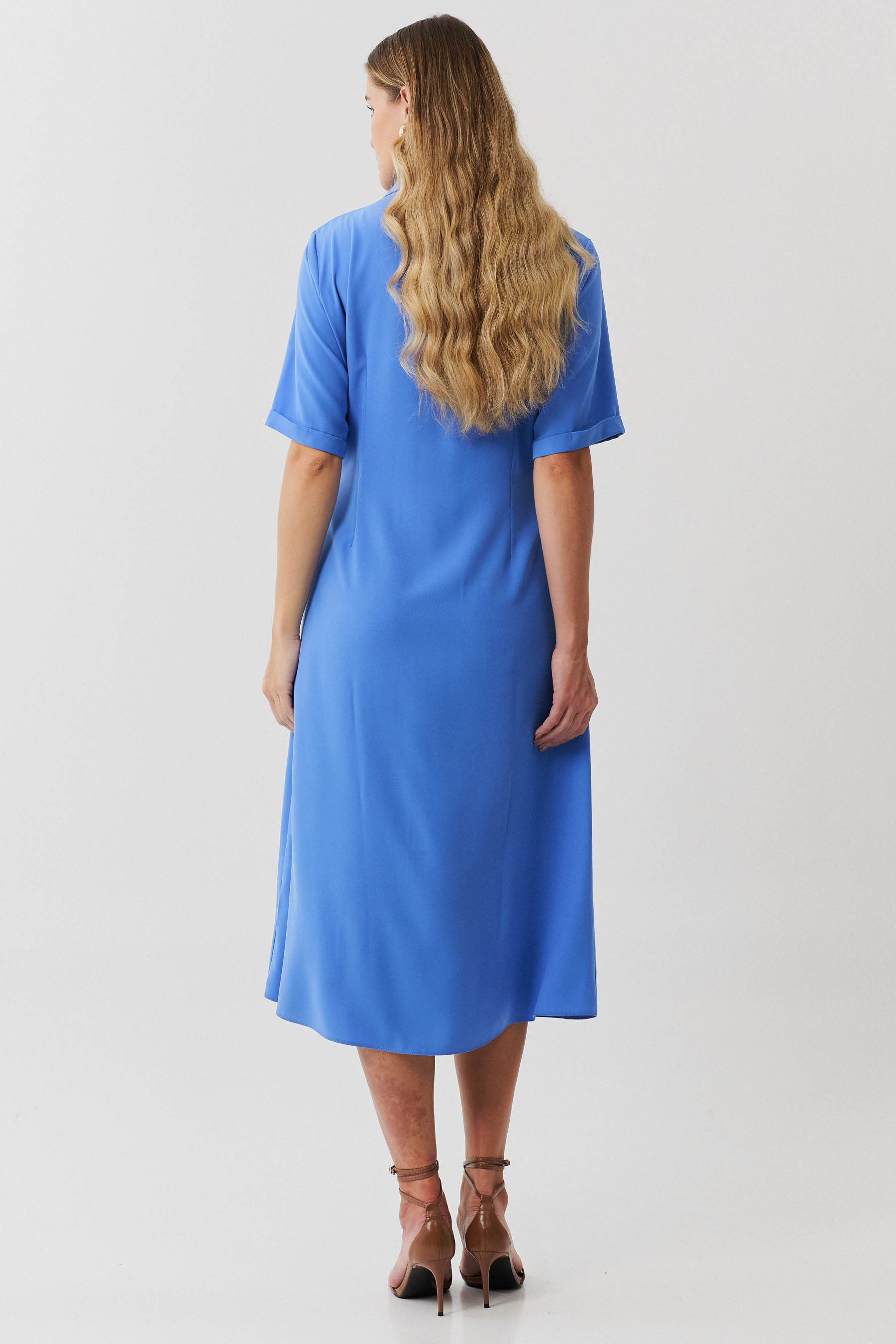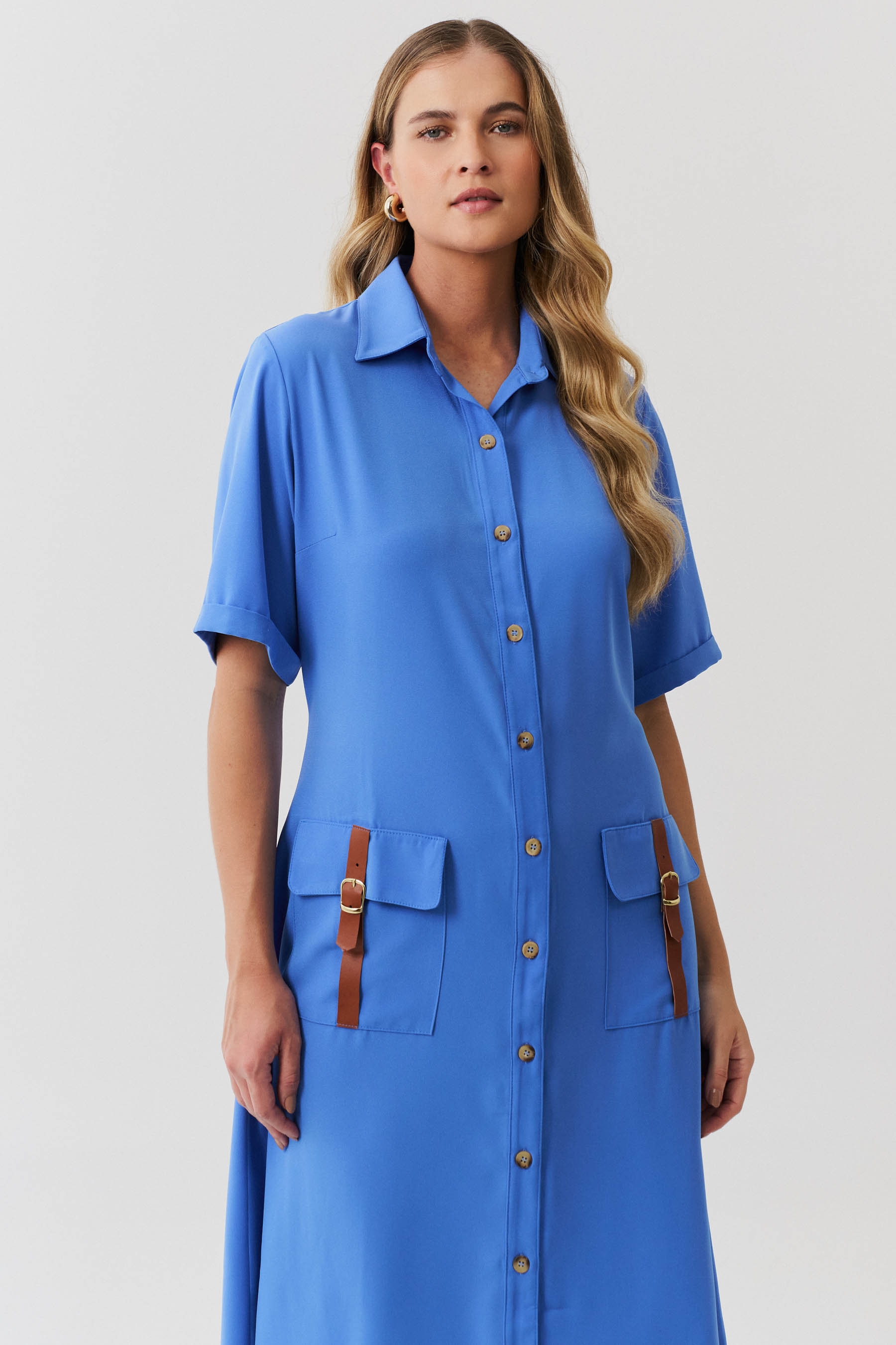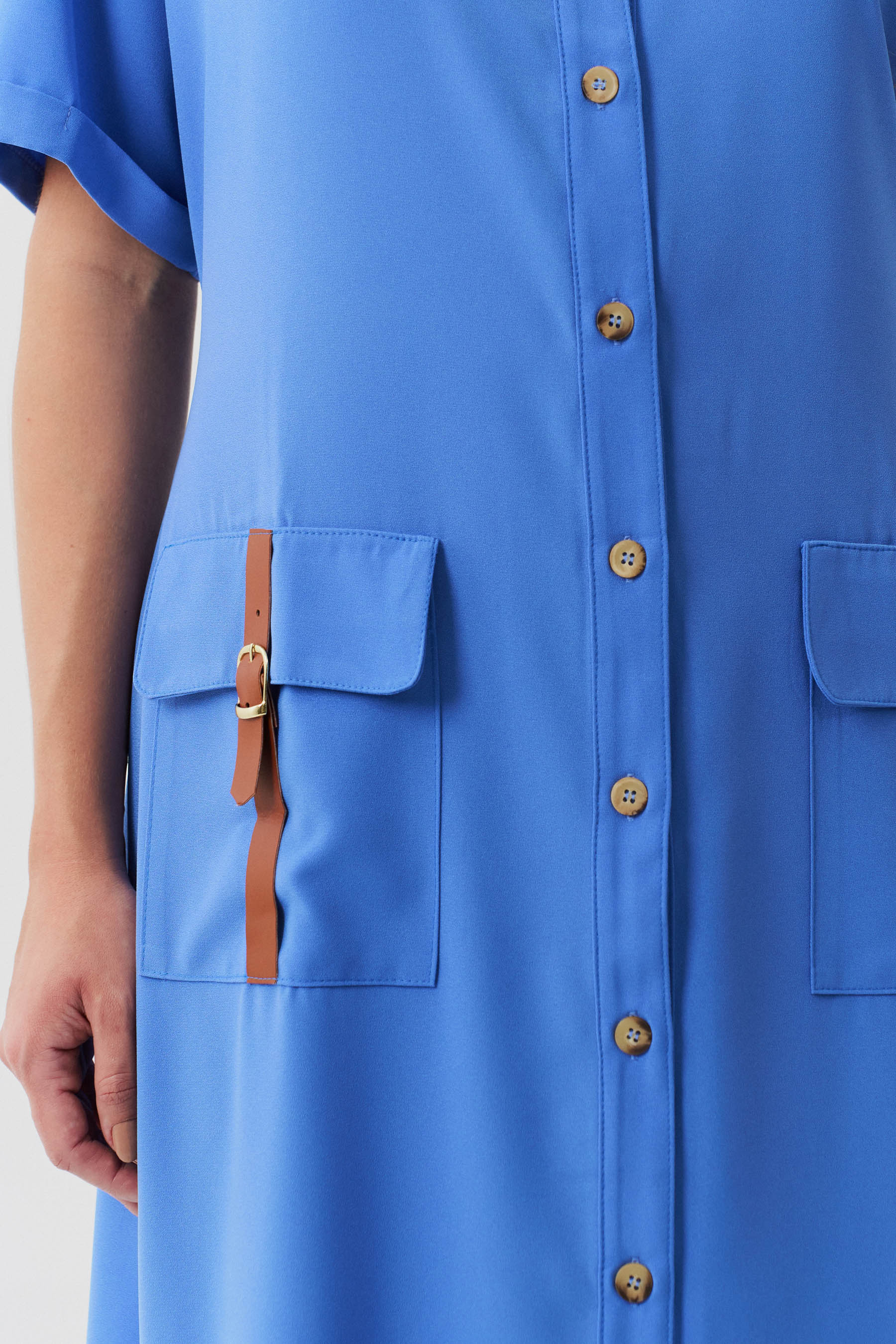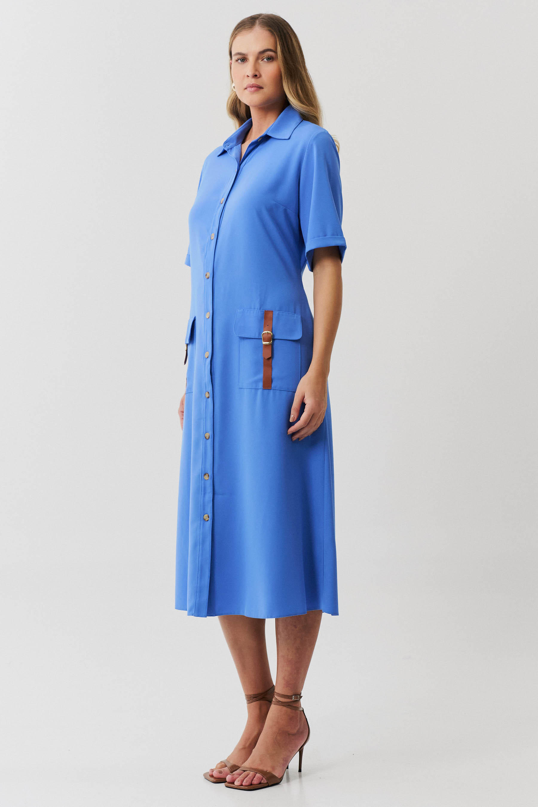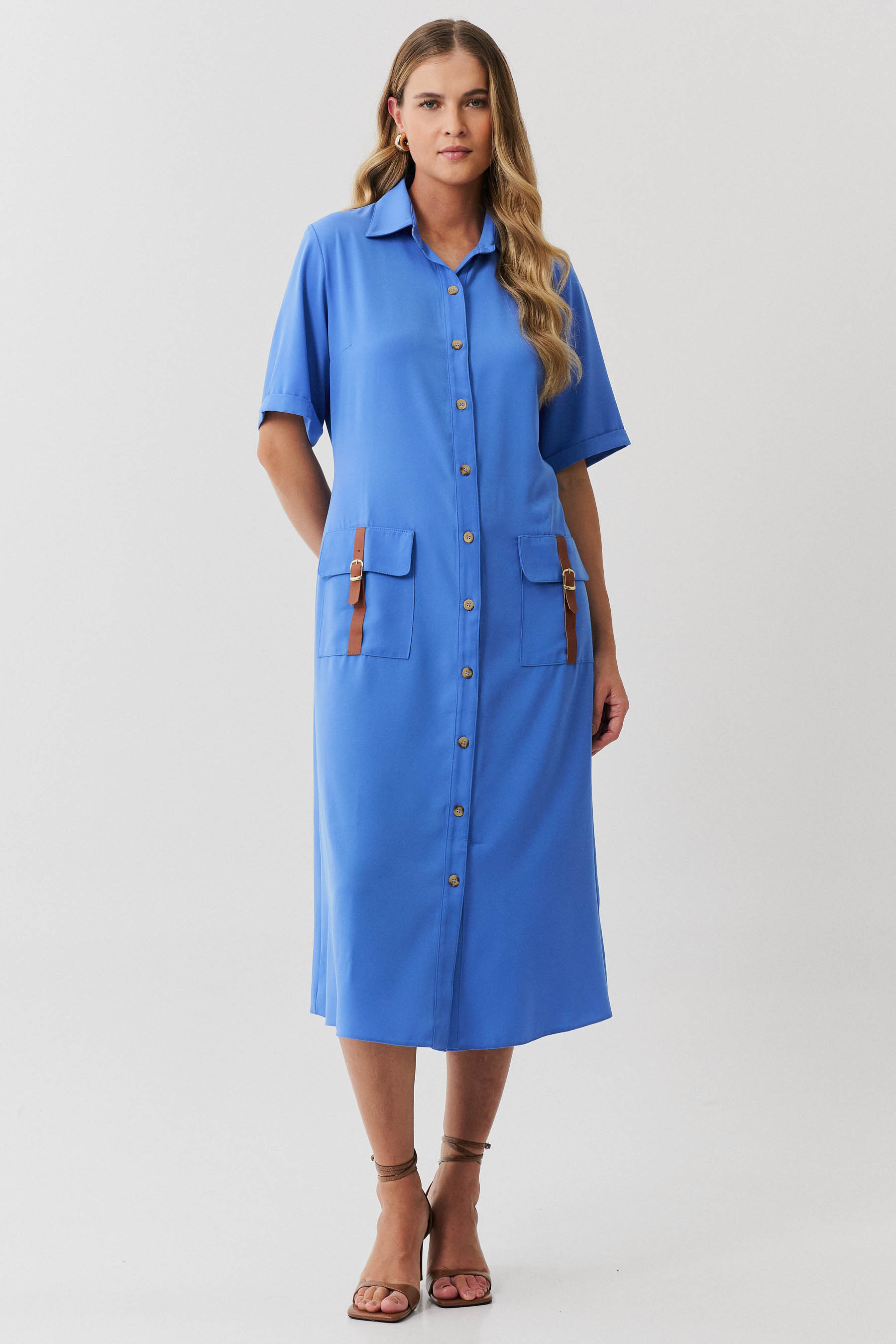 Esta chemise é ideal para compor um visual moderno e utilitário, com um toque de sofisticação. Confeccionada em crepe liso, a peça apresenta uma gola de camisa clássica que se harmoniza com a vista frontal fechada por botões, trazendo praticidade e um toque de formalidade. As mangas curtas com barra italiana adicionam um detalhe refinado, complementando o estilo clean e estruturado da chemise. Os bolsos frontais aplicados no estilo cargo reforçam o apelo utilitário da peça e são enriquecidos com detalhes em couro fake, que conferem um toque contemporâneo e diferenciado ao design. Com comprimento midi, esta chemise mantém uma proposta atemporal e é uma escolha perfeita para ocasiões que pedem um look elegante, mas com uma pegada despojada. Acompanha uma faixa do mesmo tecido para amarração na cintura, permitindo personalizar o ajuste e realçar a silhueta conforme desejado.