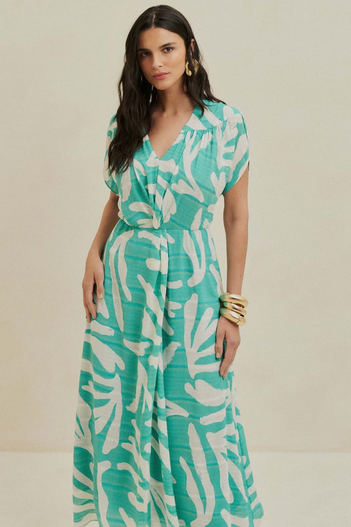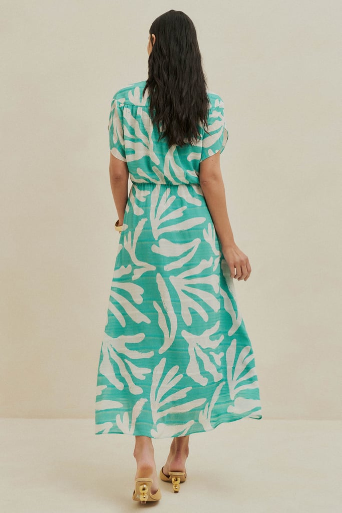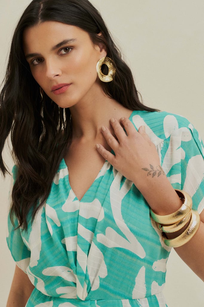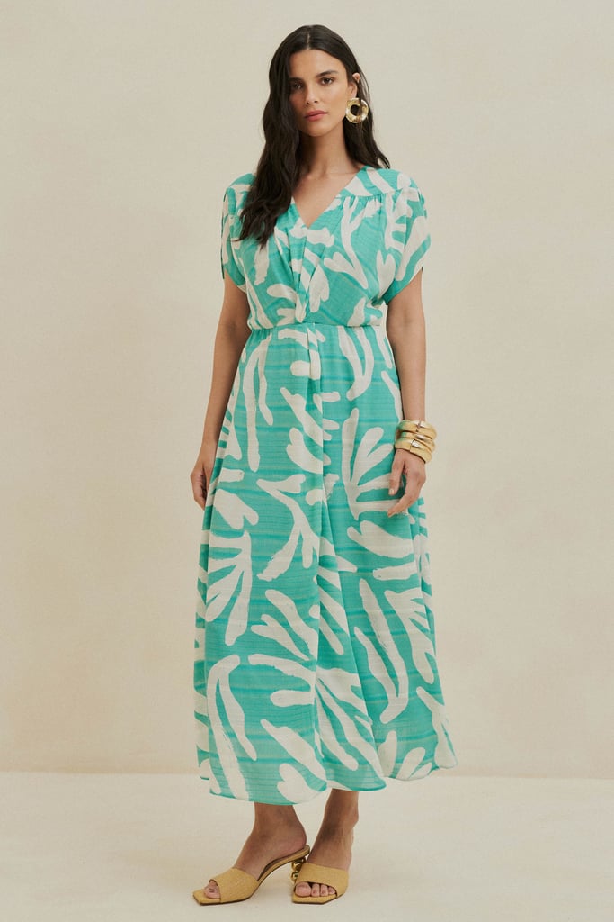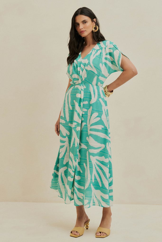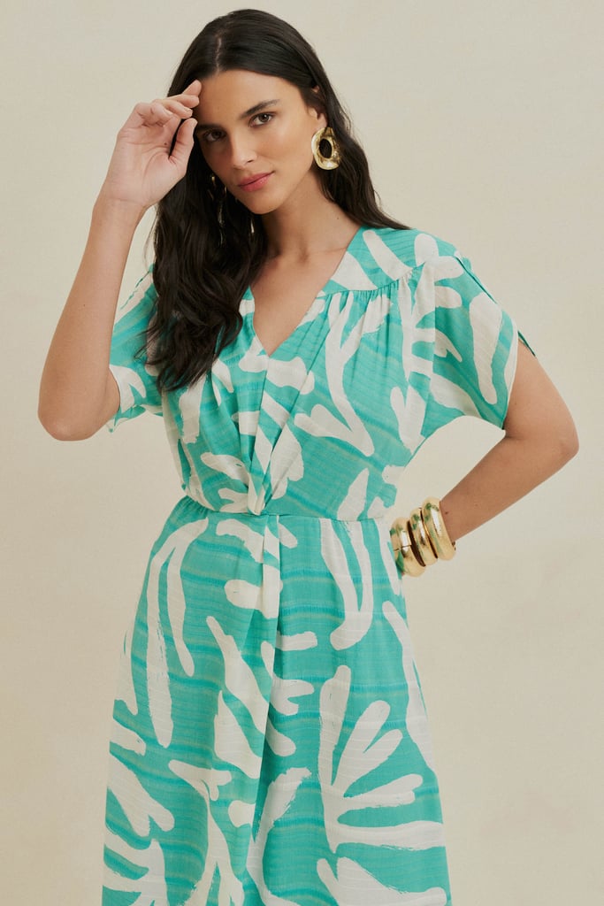Vestido confeccionado em chiffon maquinetado estampado, com um toque moderno e elegante. O decote em V alonga a silhueta, enquanto o recorte franzido nos ombros adiciona um detalhe sofisticado. A cintura possui um charmoso detalhe de torção, além de elástico para garantir o ajuste perfeito e conforto. O comprimento midi e a fluidez do tecido conferem movimento à peça. O vestido é totalmente forrado, proporcionando conforto e excelente caimento.