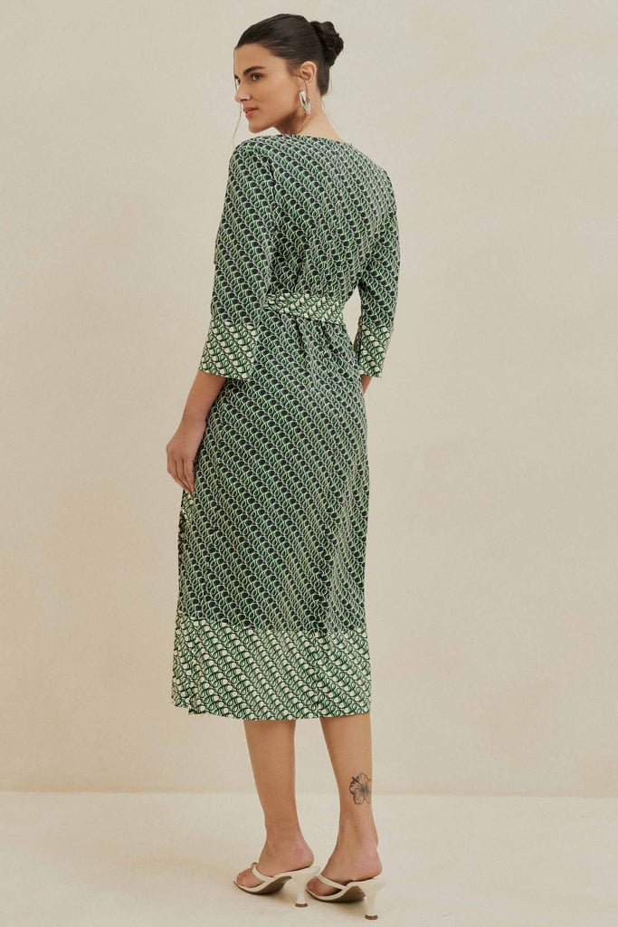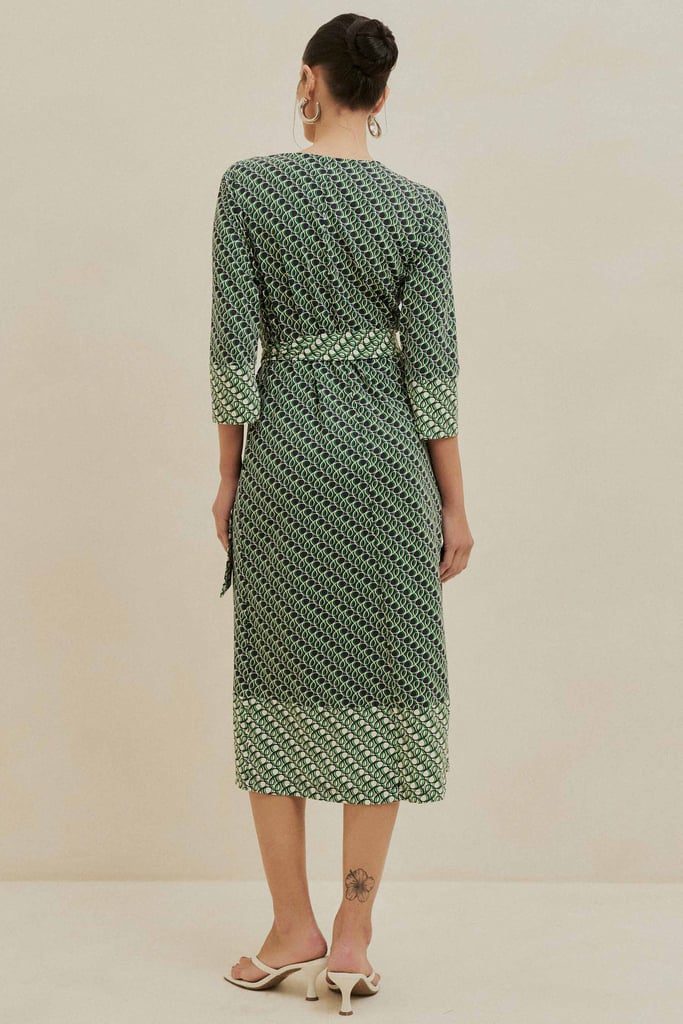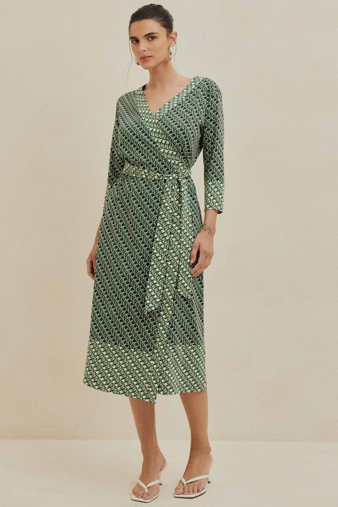 Confeccionado em fluity, tecido que oferece um toque geladinho e que não amassa, este vestido traz uma estampa exclusiva e um design clássico, com a modelagem transpassada que nunca sai de moda. O comprimento midi garante sofisticação e versatilidade, enquanto as mangas 3/4 possuem punhos com abertura, adicionando um toque charmoso. As tiras para amarração destacam a cintura, proporcionando um ajuste perfeito.