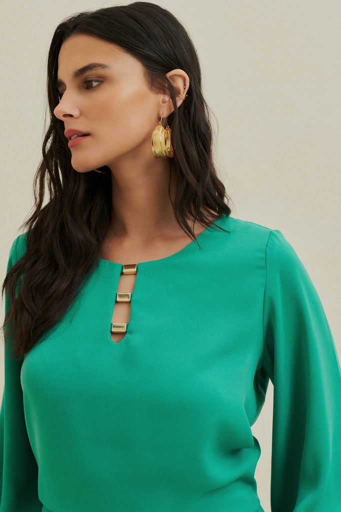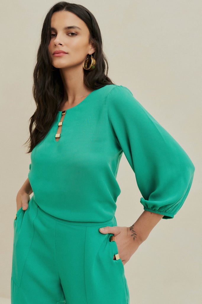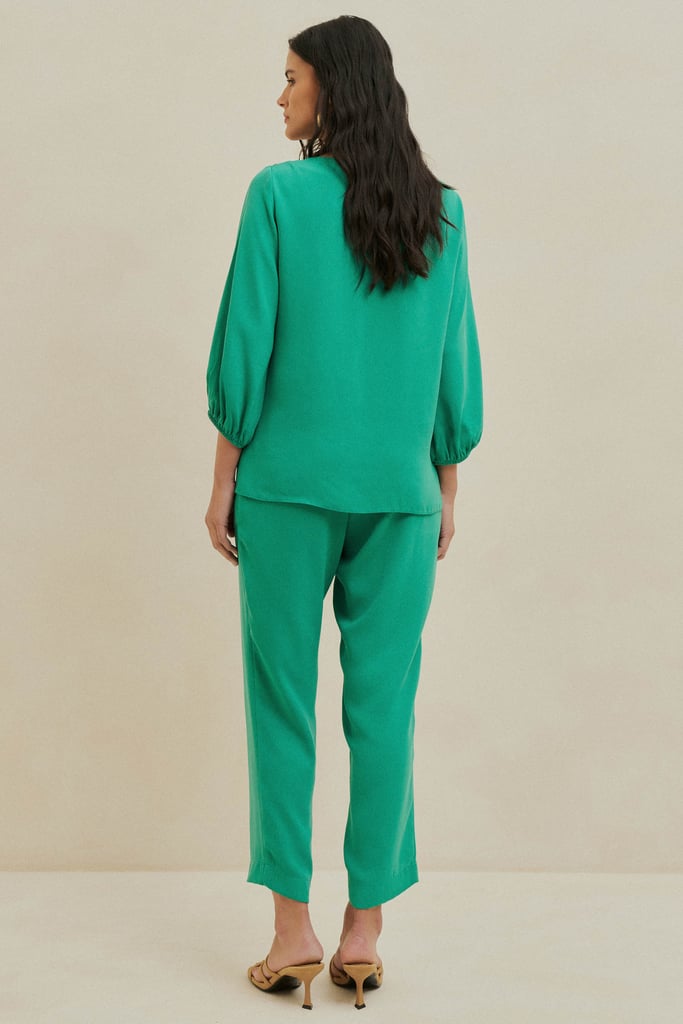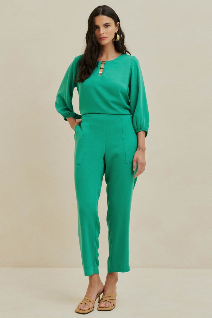Conjunto confeccionado em crepe liso, perfeito para um look elegante e moderno. A blusa possui decote redondo com aplicação de aviamento, que traz um detalhe sofisticado à peça. As mangas 3/4 com elástico nos punhos garantem um caimento confortável e refinado. A calça apresenta modelagem reta e bolsos sobrepostos estilo cargo, também com aplicação de aviamento, além de cós com elástico embutido nas costas, proporcionando praticidade e conforto.