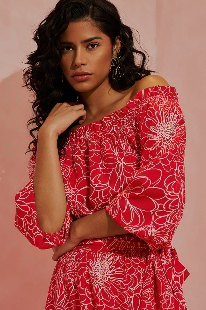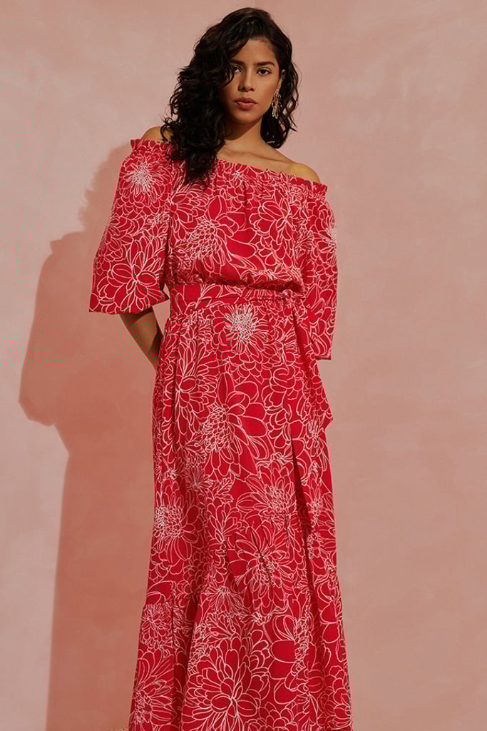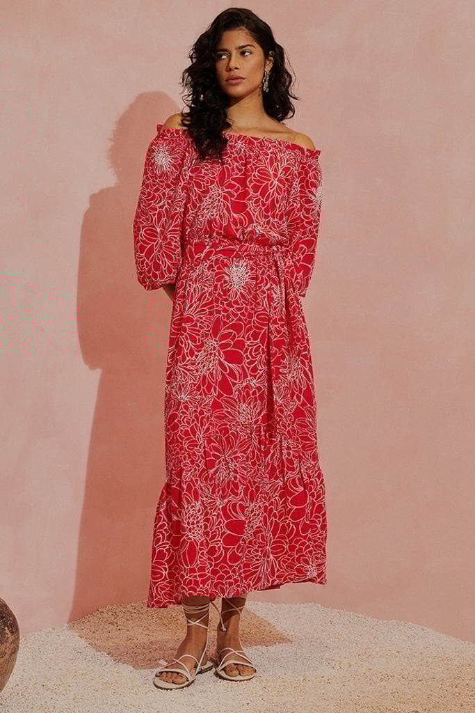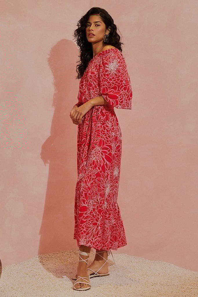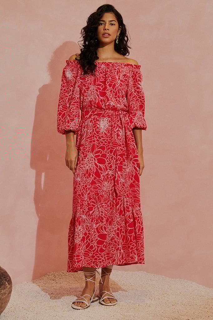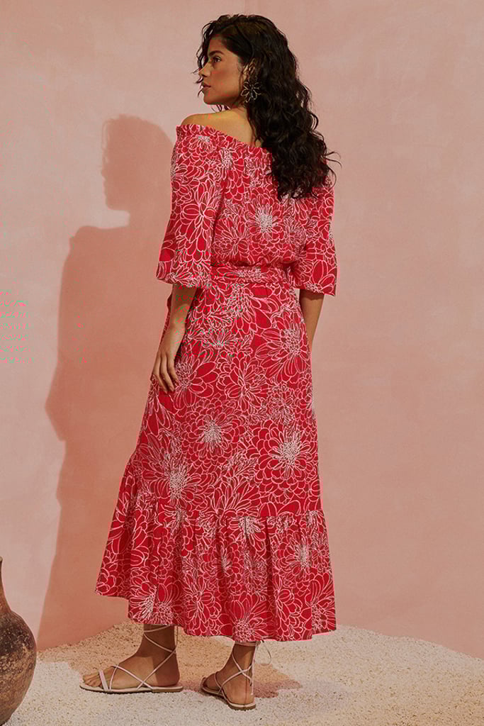 Vestido floral midi confeccionado em crepe. Possui decote ombro a ombro, elástico interno na cintura e saia com babado aplicado. Acompanha faixa do mesmo tecido para amarração.