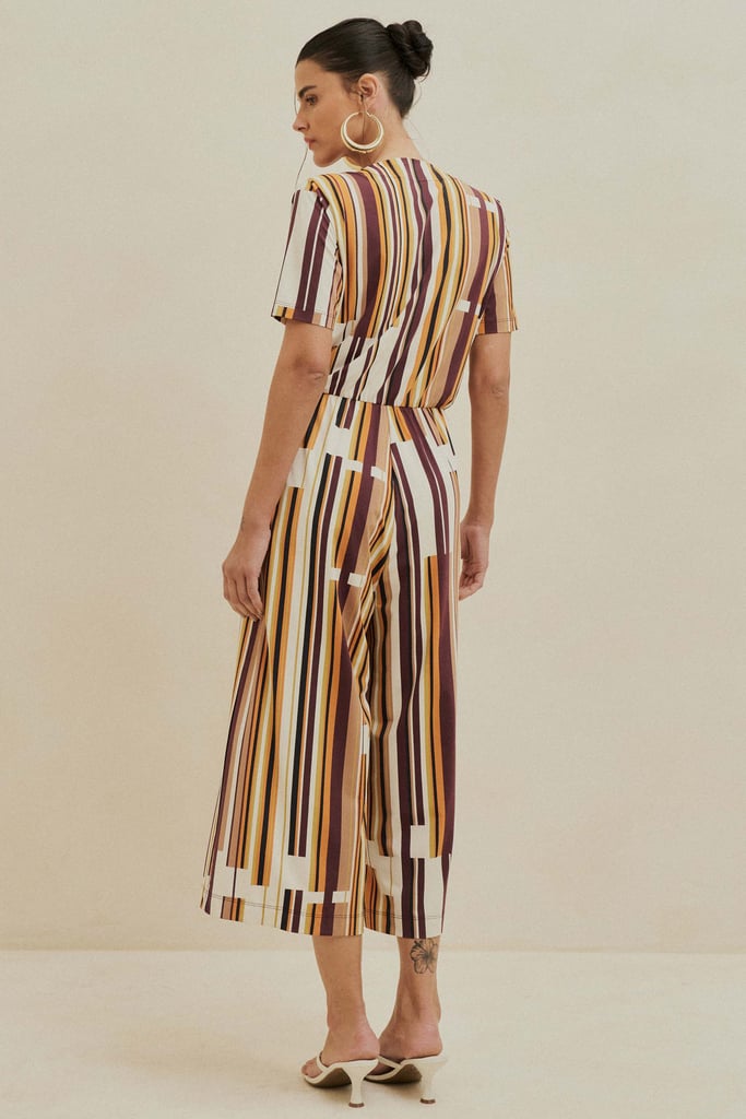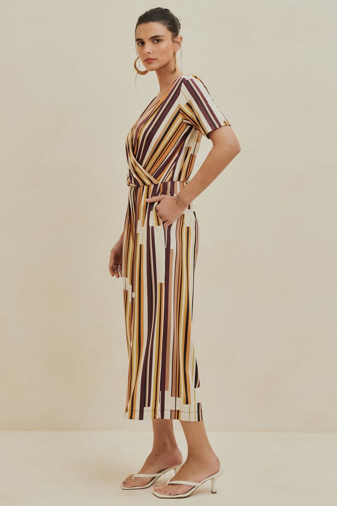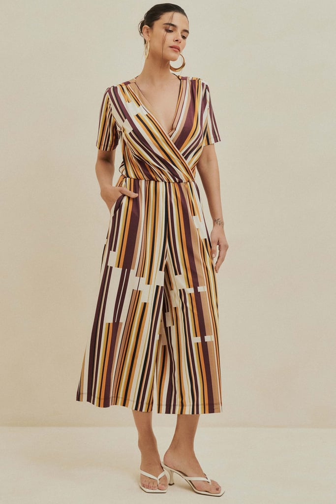 Este macacão, confeccionado em fluity, um tecido leve e que não amassa, é ideal para quem busca praticidade com estilo. A estampa exclusiva adiciona um toque moderno, enquanto o decote transpassado realça a silhueta. A cintura com elástico proporciona ajuste e conforto, complementada pelos bolsos laterais, que são perfeitos para o dia a dia. A calça estilo pantacourt, mais soltinha, garante um caimento fluido, tornando a peça fresca e confortável.