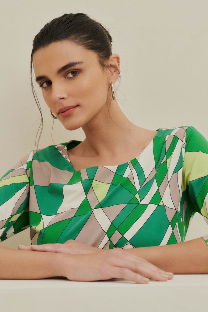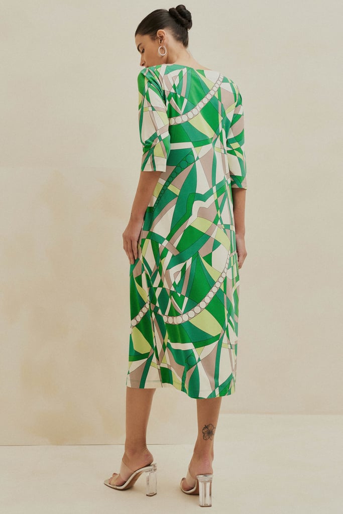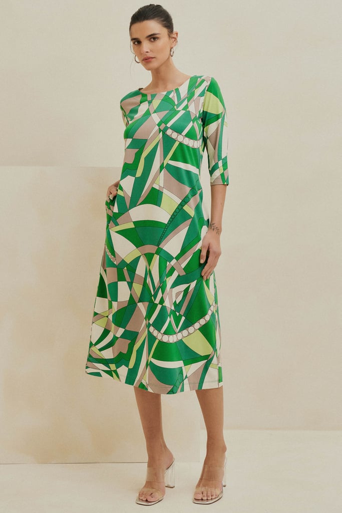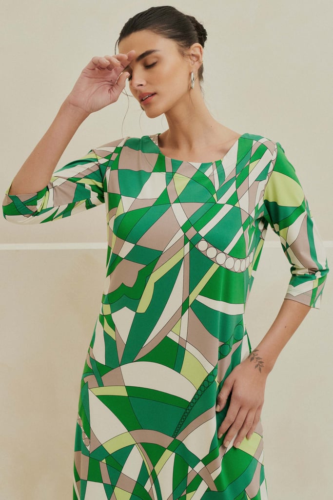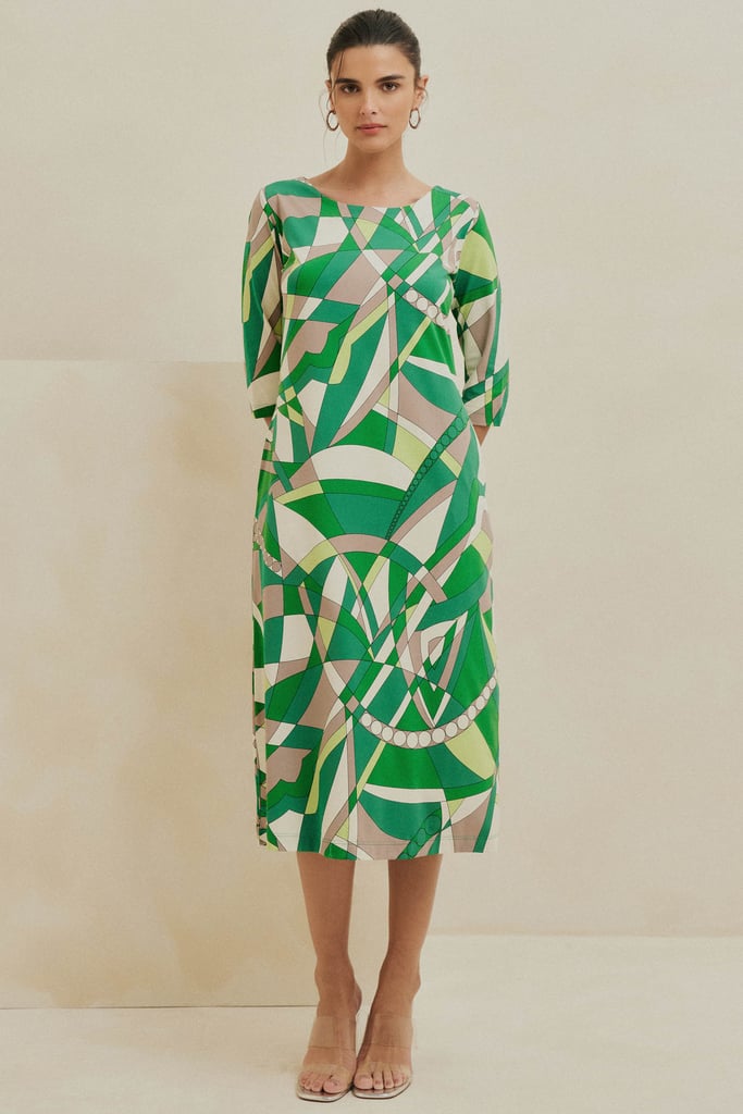 Confeccionado em fluity, tecido leve que não amassa, este vestido tubinho midi traz sofisticação e praticidade para o dia a dia. Sua estampa vibrante e colorida adiciona um toque moderno ao visual. Com mangas 3/4 e decote redondo, a peça oferece conforto e elegância. O corte do vestido desenha e valoriza a silhueta de forma sutil, tornando-o uma escolha versátil para diversas ocasiões.