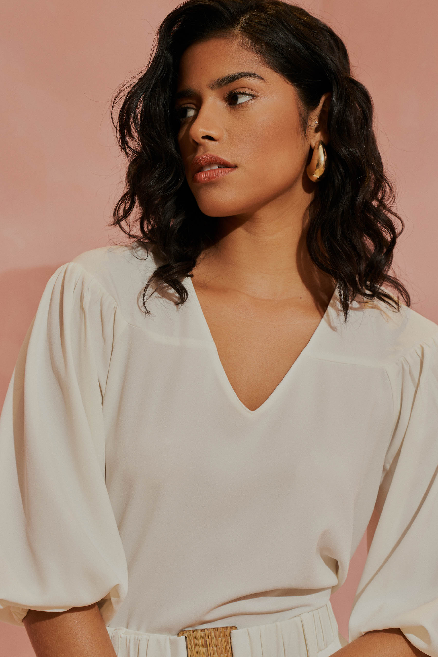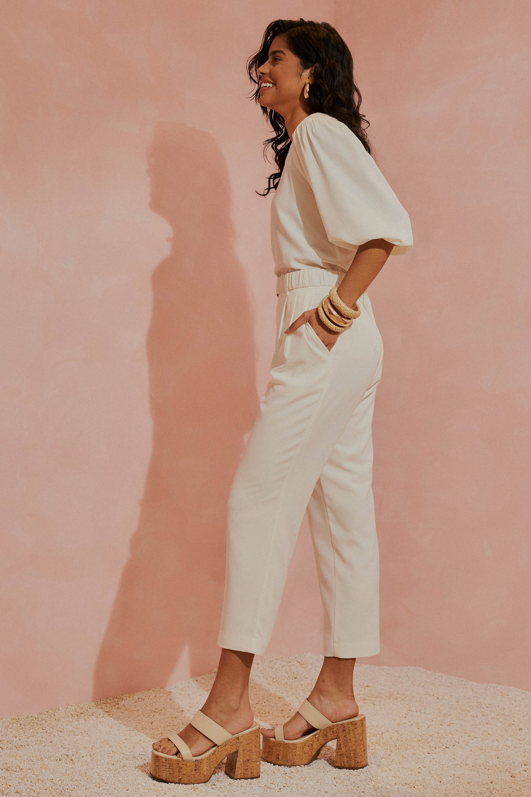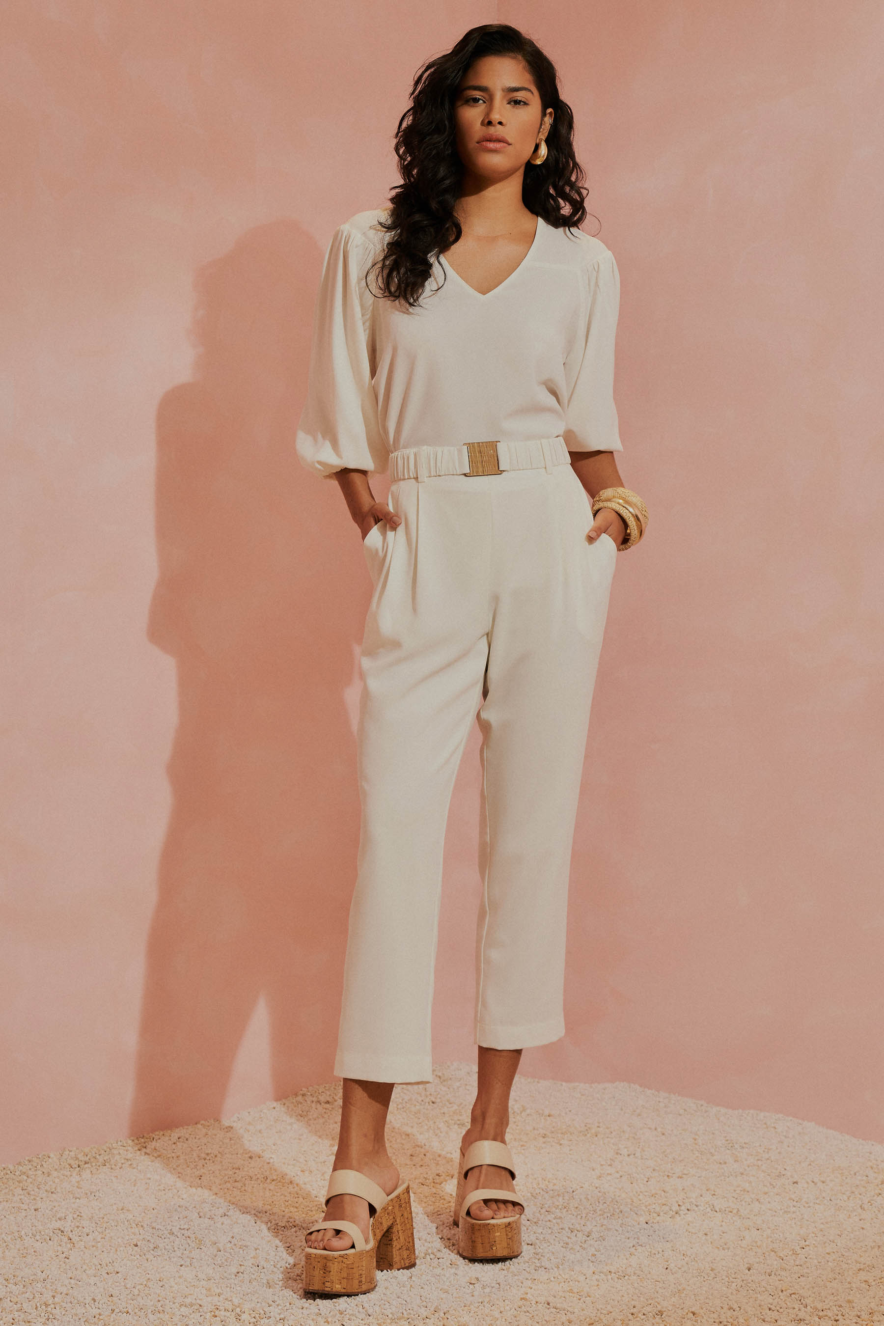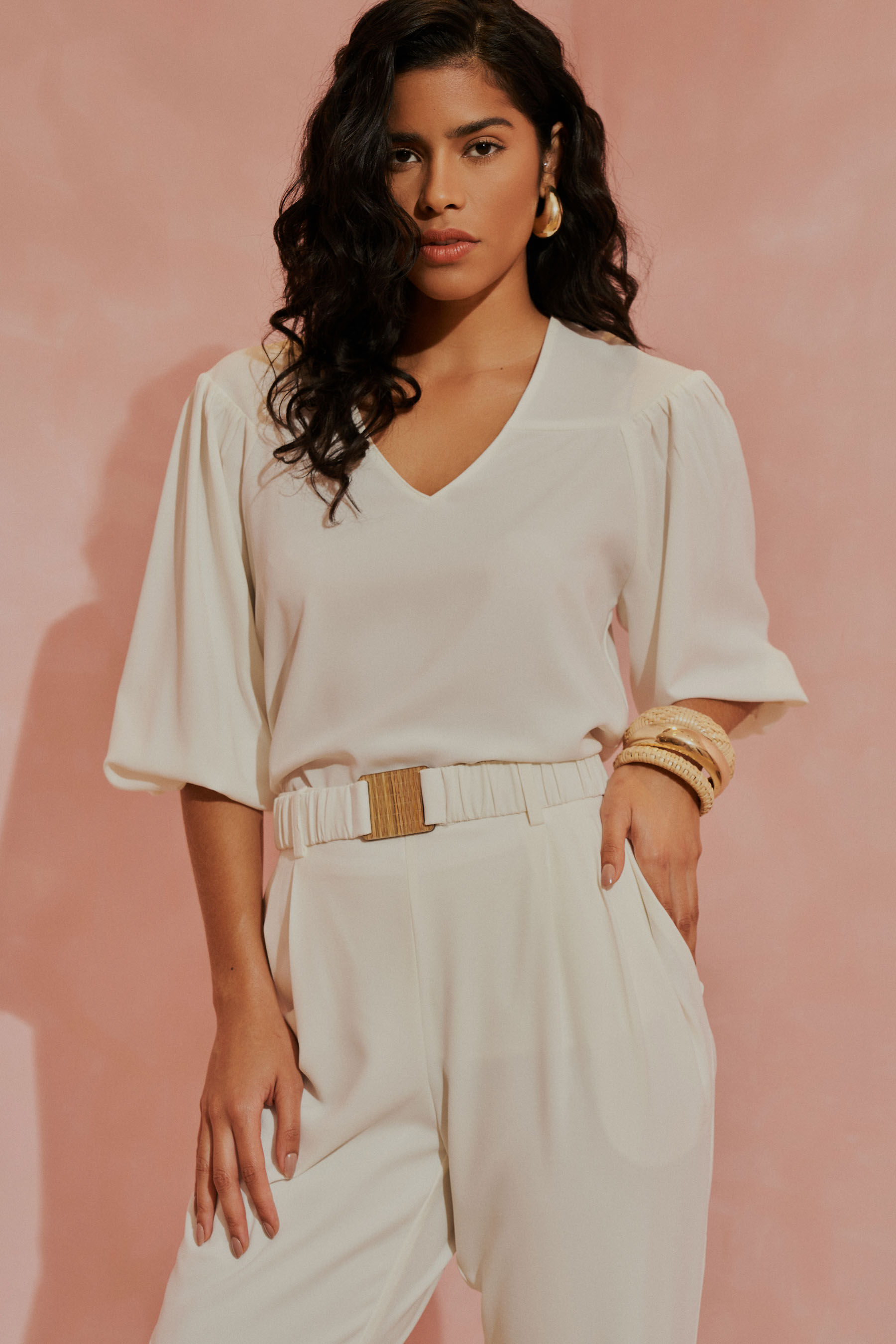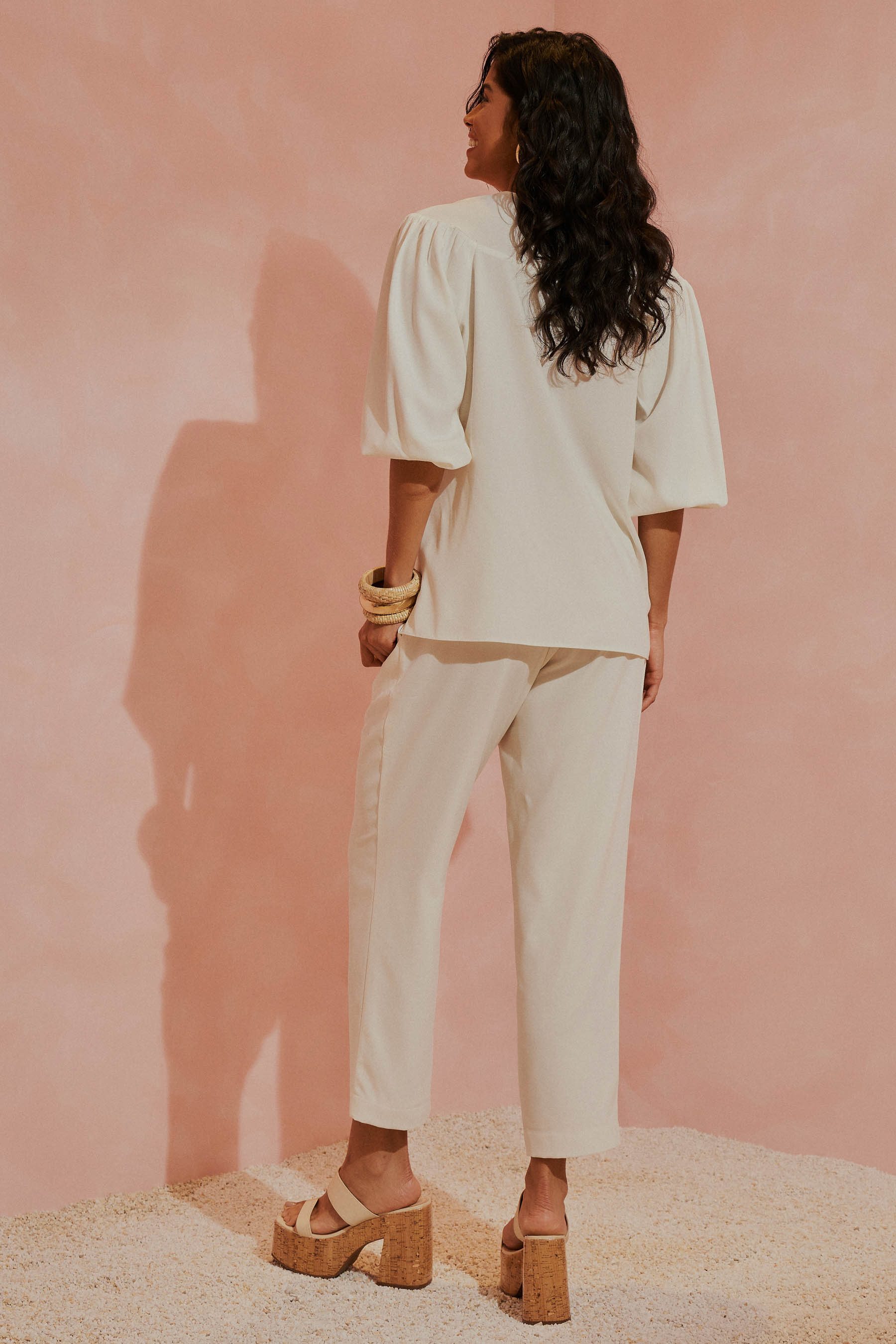 Este conjunto em crepe liso é a escolha perfeita para quem busca unir elegância e conforto em um look atemporal. A blusa apresenta um decote em V com um delicado detalhe de pala arredondada, trazendo um toque feminino e refinado. As mangas ¾ possuem uma terminação em elástico, proporcionando um caimento ajustado e confortável que se adapta ao movimento. A calça de corte reto combina elegância e funcionalidade, com pregas frontais que alongam e valorizam a silhueta de forma sofisticada. Os bolsos laterais são discretos e práticos, acrescentando versatilidade sem comprometer o visual refinado. O cós frontal, com passantes delicados, acompanha um cinto de elástico fixado nas laterais, finalizado por uma fivela resinada com um charmoso trabalho em palha – um detalhe que traz autenticidade e charme artesanal à peça. Nas costas, o cós com acabamento em elástico proporciona um ajuste confortável que se adapta ao corpo com naturalidade. Para maior conforto e um acabamento impecável, a calça é totalmente forrada, garantindo bem-estar em qualquer ocasião. O tecido de alta qualidade foi escolhido para oferecer uma experiência sofisticada e prática: ele é leve, confortável e tem a vantagem de não amassar facilmente, ideal para o ritmo da mulher moderna. Com este conjunto, você estará pronta para celebrar cada momento especial com estilo e confiança, sentindo-se bem em qualquer ocasião.