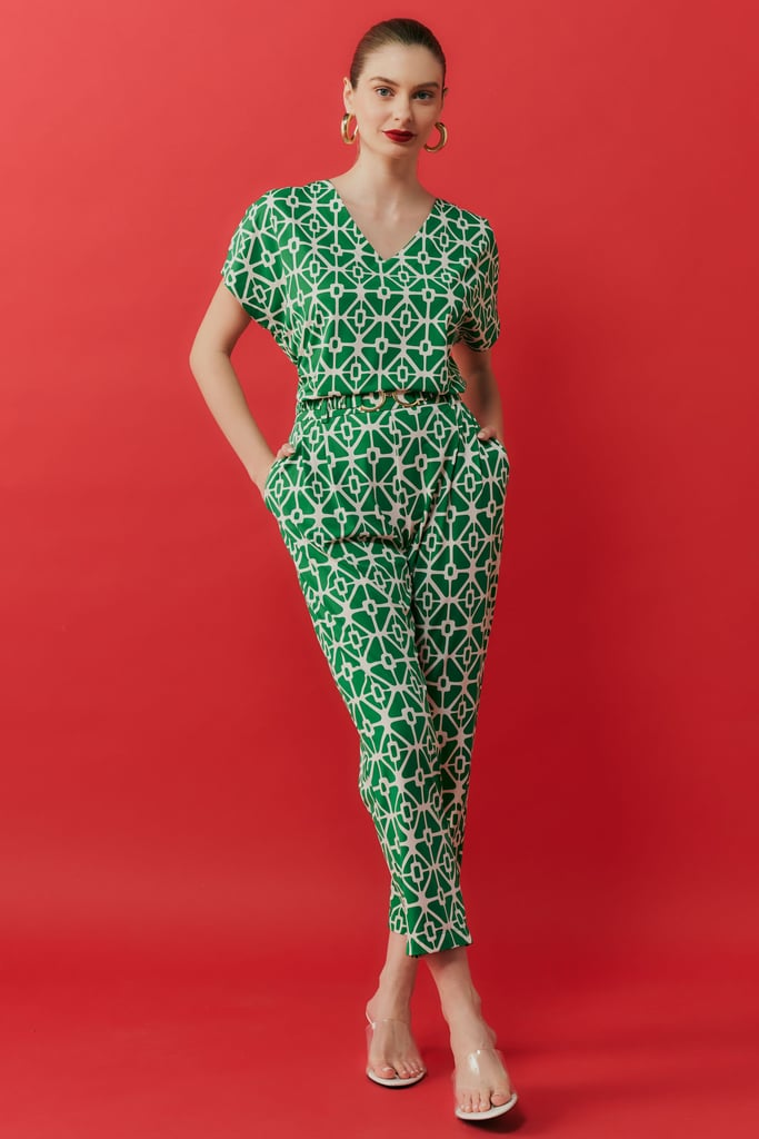 Conjunto elegante composto por blusa e calça em tecido fluity, com estampa exclusiva e geométrica, que traz modernidade e sofisticação ao look. A blusa possui decote em V e mangas curtas, proporcionando um caimento suave e fluido. A calça de cintura alta possui modelagem reta, bolsos laterais, elástico nas costas para um ajuste confortável e acompanha um cinto de elástico fixado nas laterais, fechado com fivela de metal, que adiciona um toque moderno ao look. Ideal para quem busca um visual contemporâneo, sem abrir mão do conforto.