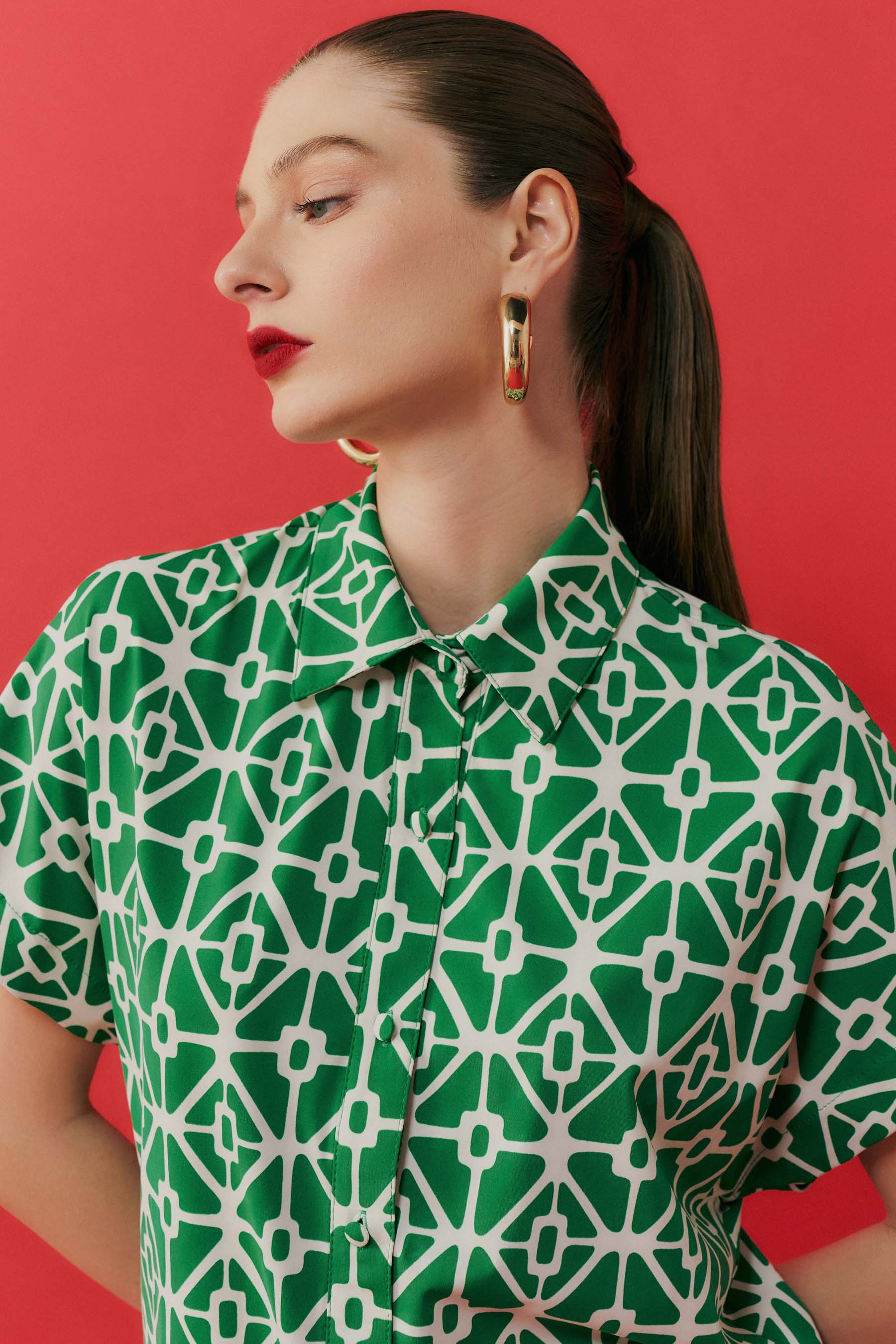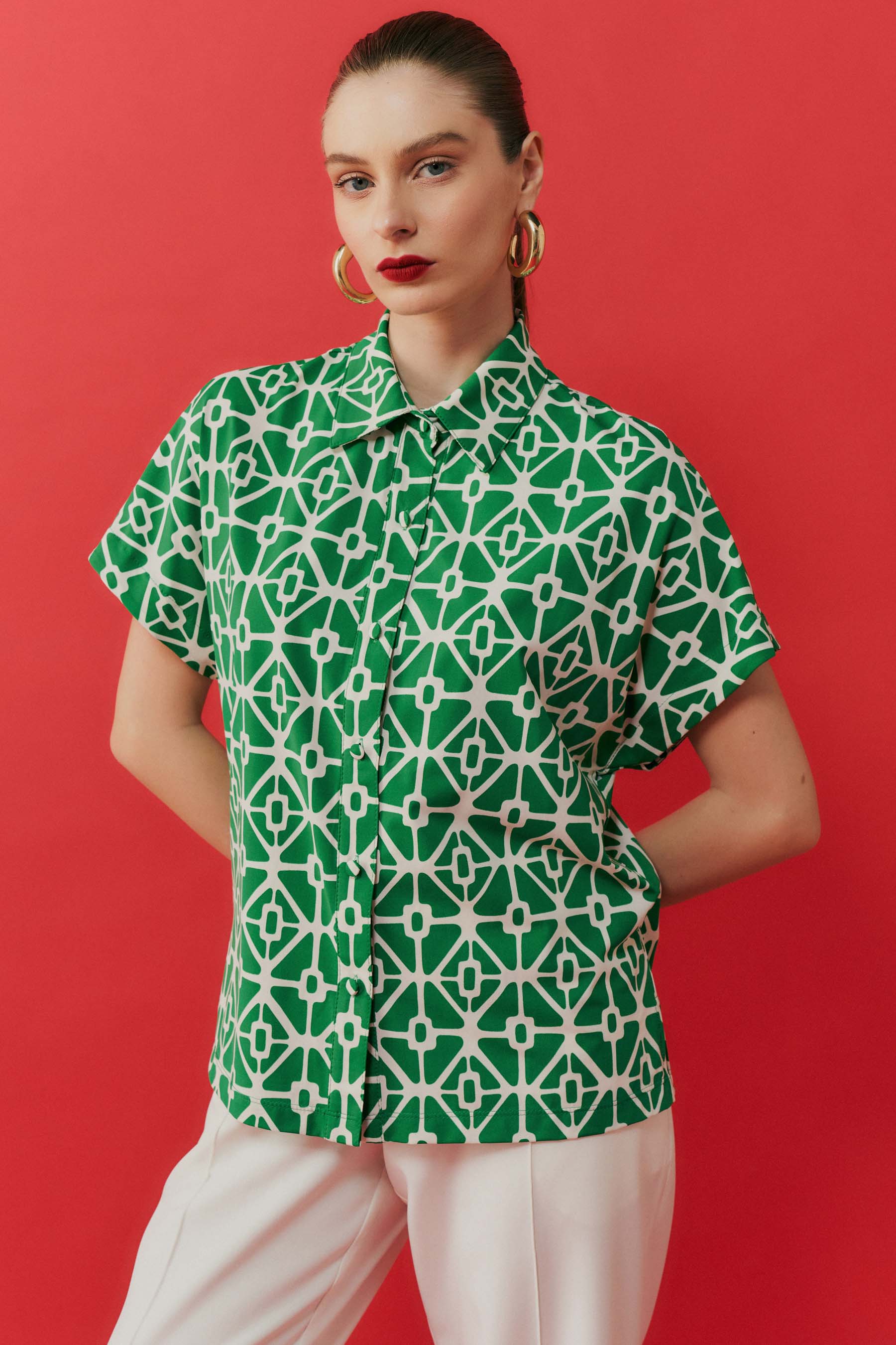 Camisa confeccionada em fluity, um tecido leve e fresco, com estampa geométrica exclusiva que adiciona um toque moderno e sofisticado ao visual. O modelo conta com gola tradicional e fechamento frontal por botões, conferindo um ar clássico à peça. As mangas curtas, com caimento solto, são perfeitas para os dias mais quentes, garantindo conforto e elegância. Ideal para compor looks versáteis e estilosos, essa blusa é perfeita tanto para o dia a dia quanto para ocasiões especiais.