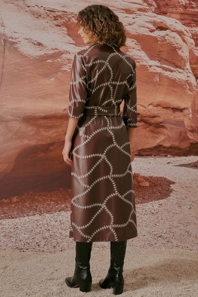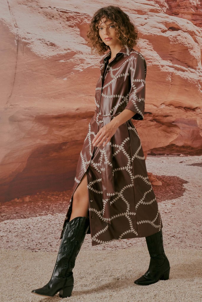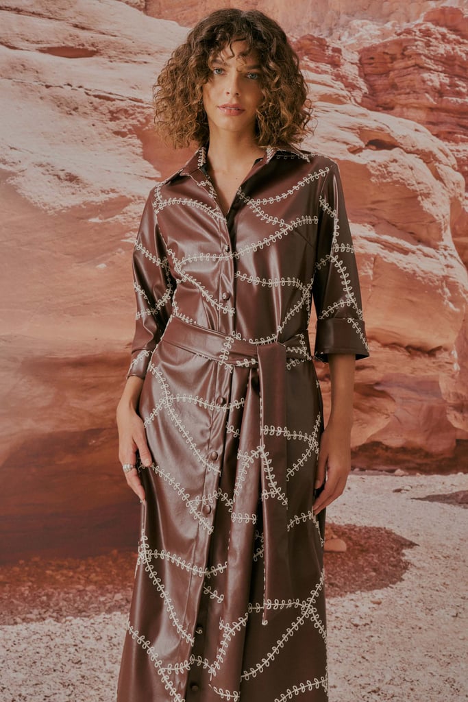 A chemise em couro sintético bordado combina modernidade e atemporalidade. Confeccionada em material de alta qualidade, possui um acabamento refinado com bordados exclusivos, que elevam a sofisticação do design. A modelagem proporciona conforto e elegância, enquanto a gola clássica de camisa e a vista frontal com botões forrados no mesmo tecido garantem um caimento impecável. A manga 7/8 com punho adiciona um toque refinado, tornando a peça ideal para diferentes estações. Os bolsos laterais conferem praticidade sem comprometer a sofisticação, e a faixa opcional permite ajustar a silhueta de acordo com a preferência.