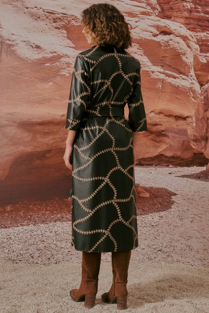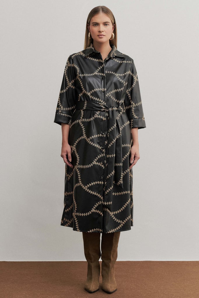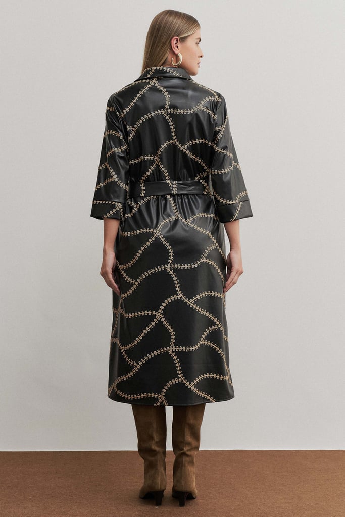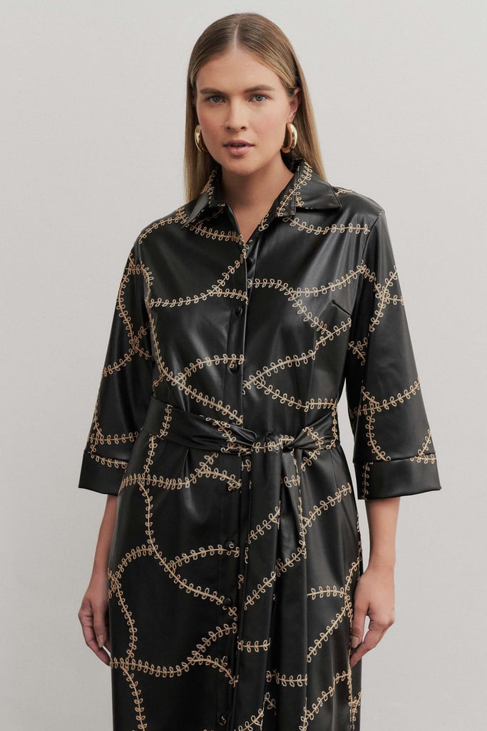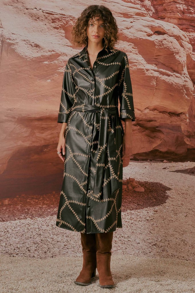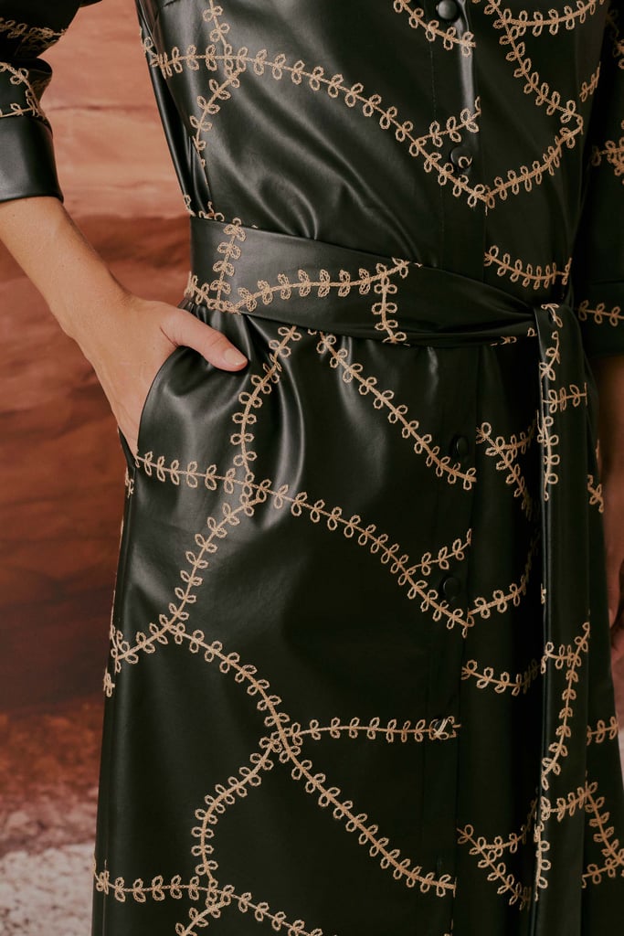 A chemise em couro sintético bordado combina modernidade e atemporalidade. Confeccionada em material de alta qualidade, possui um acabamento refinado com bordados exclusivos, que elevam a sofisticação do design. A modelagem proporciona conforto e elegância, enquanto a gola clássica de camisa e a vista frontal com botões forrados no mesmo tecido garantem um caimento impecável. A manga 7/8 com punho adiciona um toque refinado, tornando a peça ideal para diferentes estações. Os bolsos laterais conferem praticidade sem comprometer a sofisticação, e a faixa opcional permite ajustar a silhueta de acordo com a preferência.