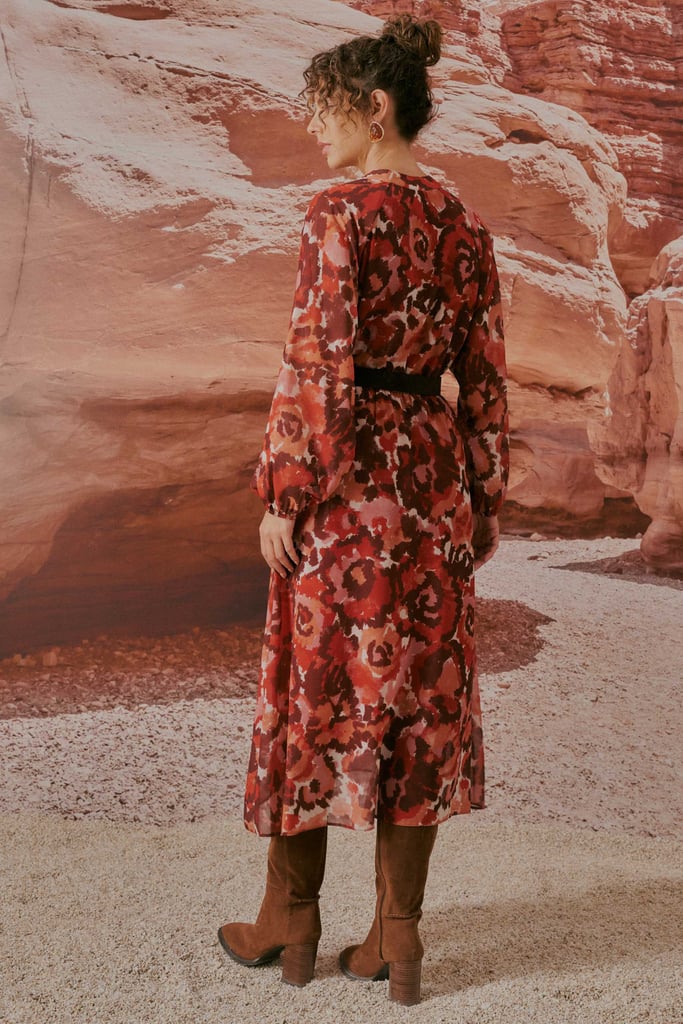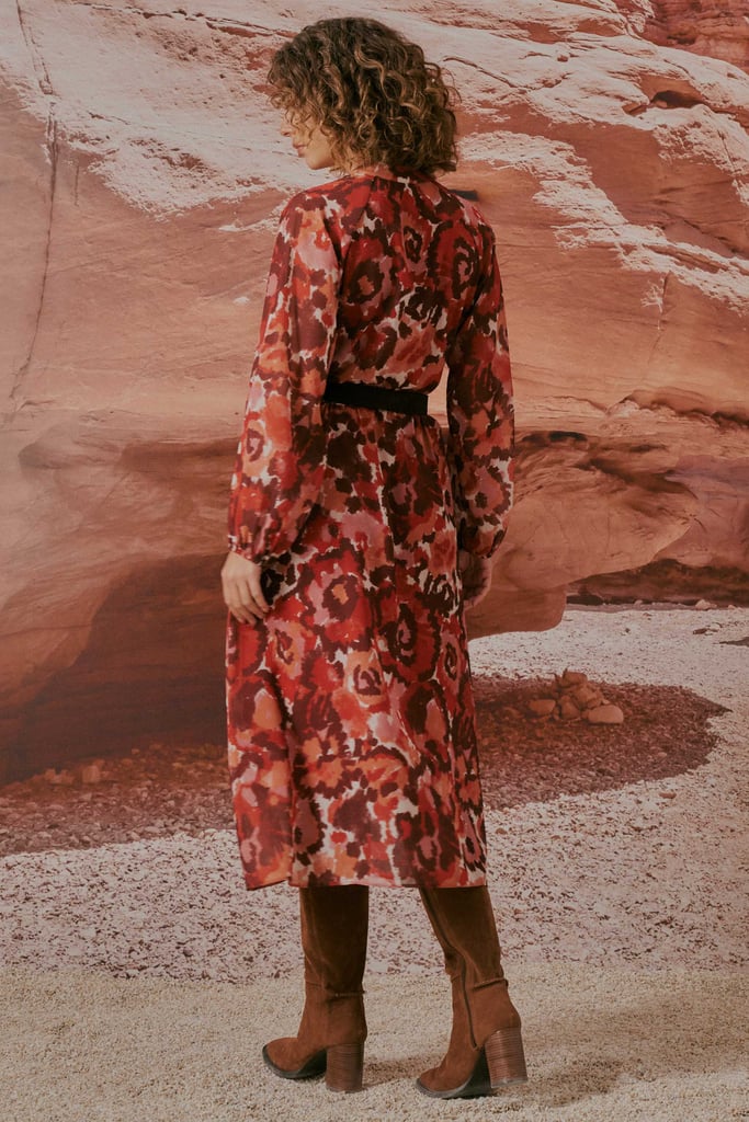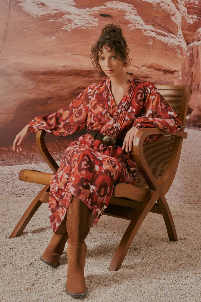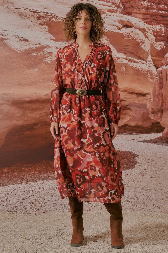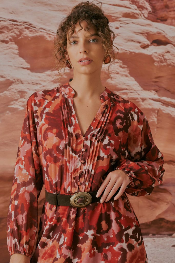 Confeccionado em chiffon leve e fluido, este vestido traduz elegância e movimento, criando um contraste refinado com a estampa exclusiva, que adiciona personalidade e sofisticação à peça. O design clássico apresenta gola padre com delicado trabalho de pregas, um detalhe que valoriza o acabamento e adiciona charme à composição. O abotoamento frontal com botões forrados no mesmo tecido reforça a sofisticação do modelo. As mangas longas com punhos ajustados garantem um caimento impecável, enquanto o elástico interno na cintura proporciona ajuste confortável e elegante. Acompanha faixa opcional no mesmo tecido, permitindo diferentes formas de uso. A peça é forrada para maior conforto e usabilidade. O cinto da foto é apenas para efeito de styling e não acompanha o vestido.