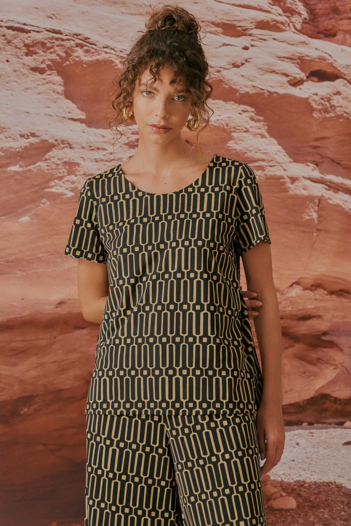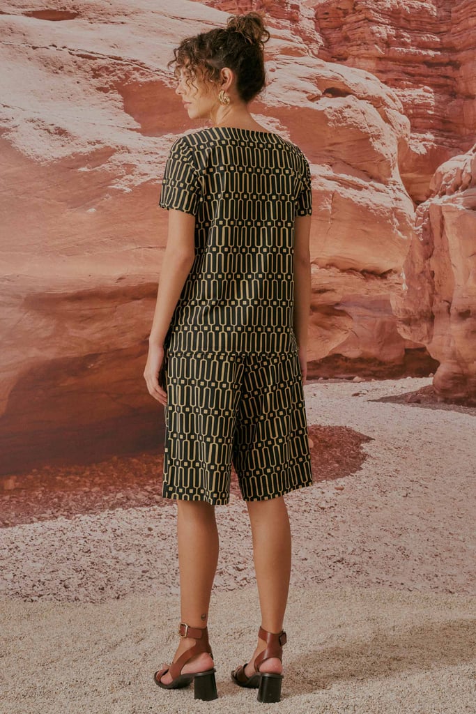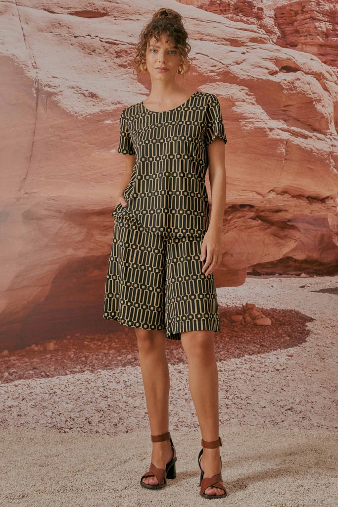 Este conjunto une modernidade e sofisticação em uma modelagem versátil, que transita com facilidade entre o casual e o refinado. A blusa com decote redondo e mangas curtas traz um design atemporal, garantindo elegância sem esforço. A bermuda de modelagem reta possui caimento fluido e confortável, valorizando a silhueta com leveza. As pregas frontais adicionam um toque refinado, enquanto os bolsos faca garantem praticidade. O cós com elástico na parte traseira proporciona ajuste perfeito, mantendo o conforto ao longo do dia. Confeccionado em malha Fluity, um tecido premium conhecido pelo toque macio e geladinho, garantindo sensação fresca ao vestir. Além disso, sua composição oferece praticidade, pois não amassa, tornando-o ideal para diferentes momentos do dia a dia. A estampa exclusiva Simple Life valoriza ainda mais a peça, conferindo identidade e sofisticação ao visual. A malha Fluity é uma tecnologia têxtil sustentável, desenvolvida para aliar conforto, leveza e inovação.