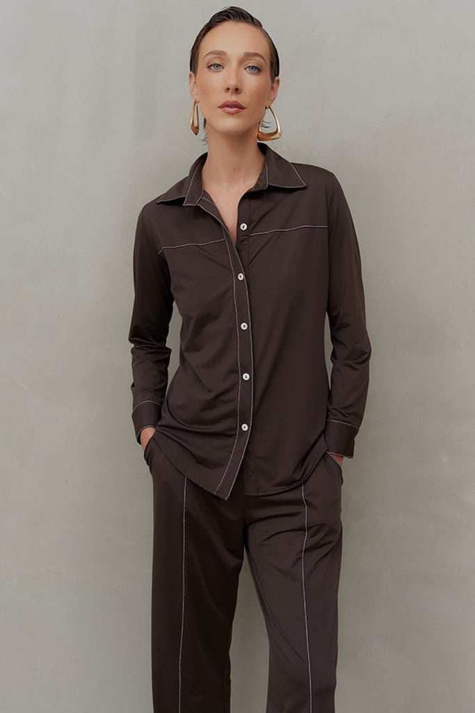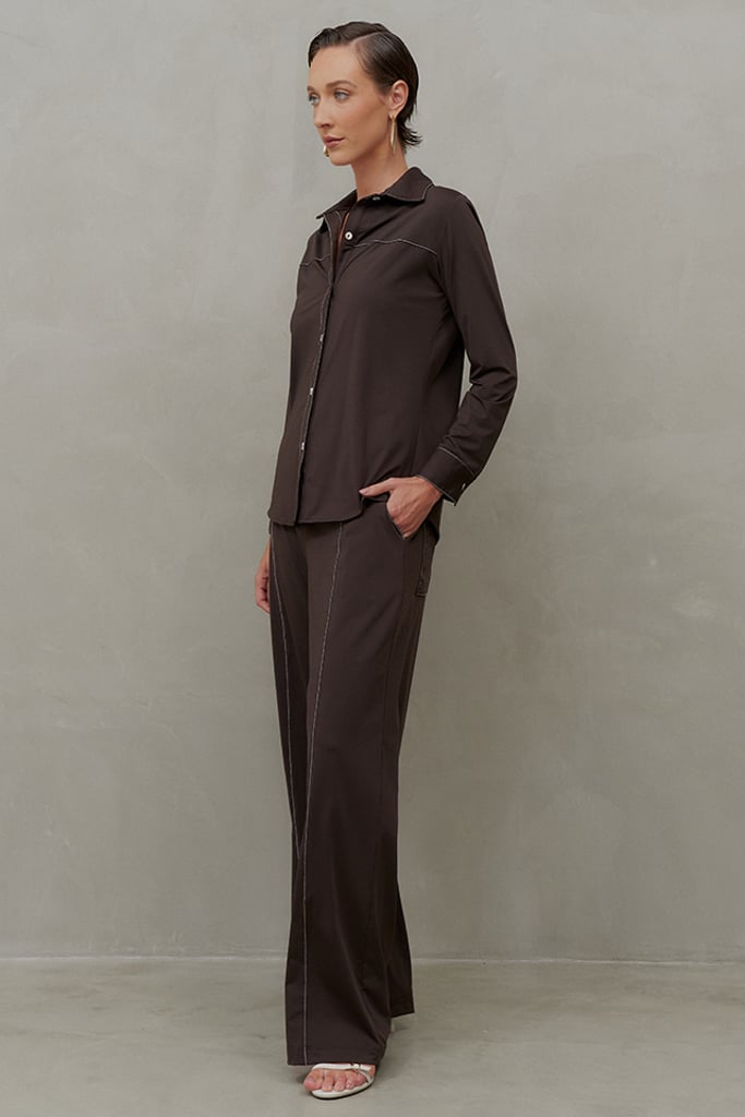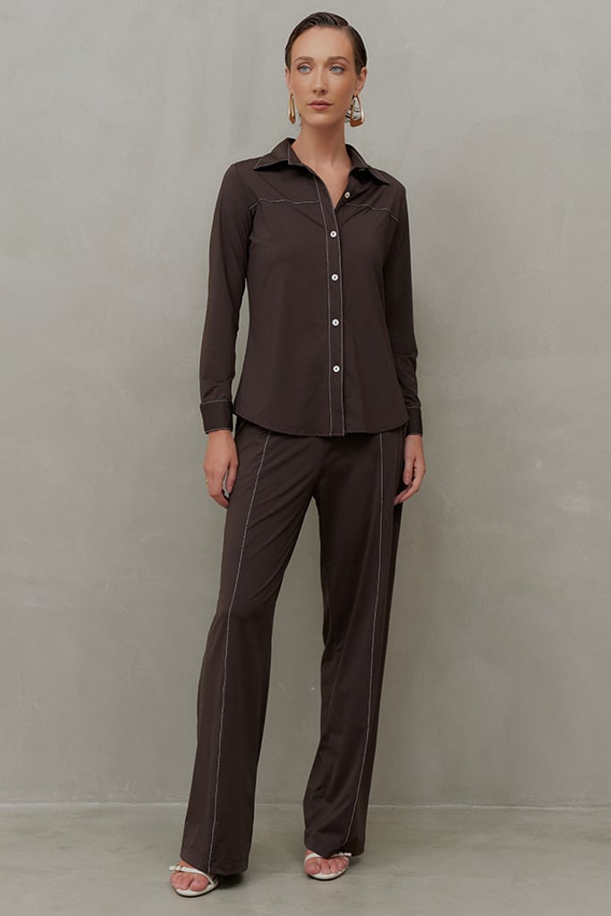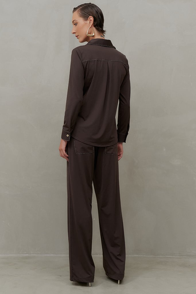 O conjunto em malha Fluity combina sofisticação e conforto em uma proposta moderna e versátil. A camisa possui gola tradicional, vista frontal com fechamento por botões e mangas longas finalizadas com punhos, também fechados por botões. O recorte frontal adiciona um toque de refinamento ao design, enquanto a prega macho nas costas proporciona maior conforto e liberdade de movimento. A calça apresenta modelagem reta e fluida, com nervura frontal que alonga a silhueta, além de bolsos faca e traseiros que conferem funcionalidade ao design minimalista. O toque geladinho e macio da malha Fluity proporciona máximo conforto, enquanto sua leveza e praticidade garantem um visual sempre impecável, já que não amassa. Ideal para diversas ocasiões, esse conjunto pode ser usado com sandálias de salto fino para um look sofisticado ou combinado com tênis para uma abordagem casual chic. Além de elegante e funcional, a malha Fluity é sustentável e tecnológica, garantindo um consumo mais consciente sem abrir mão da qualidade.
