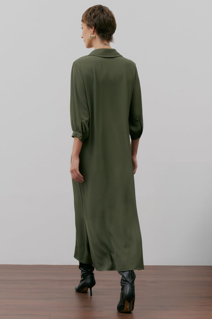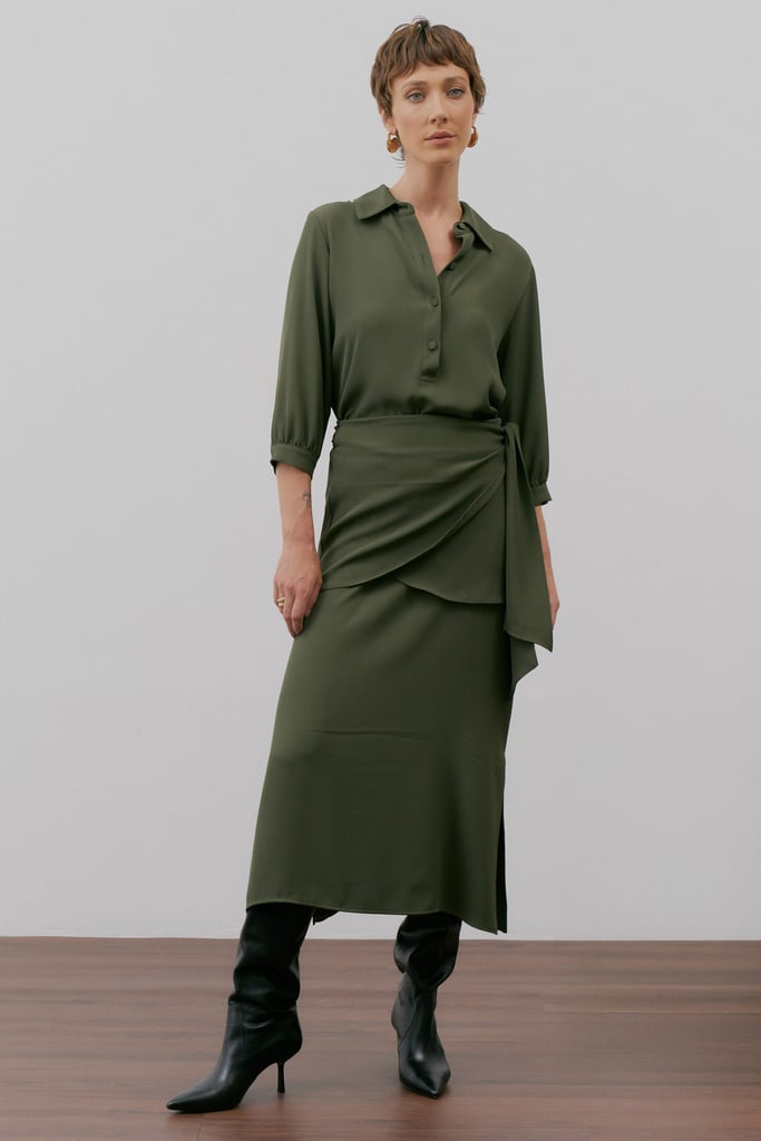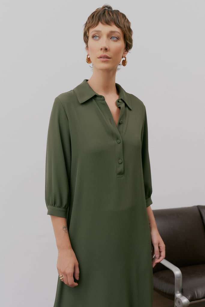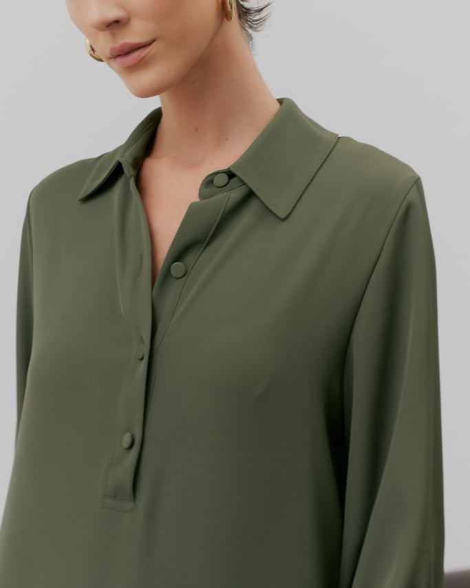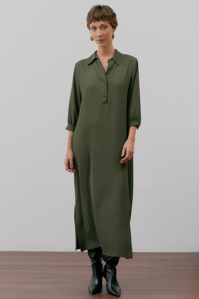 Com design limpo e elegante, este vestido longo em crepe premium equilibra sofisticação e praticidade. A modelagem reta ganha estrutura com gola de camisa e vista interrompida com botões forrados — um acabamento refinado e atemporal. As mangas 3/4 com punho e botão trazem versatilidade, enquanto as fendas laterais conferem leveza ao movimento. O charme da peça está na sobreposição: uma saia tipo pareô, no mesmo tecido e tom, que atualiza o visual e valoriza a silhueta com sutileza.