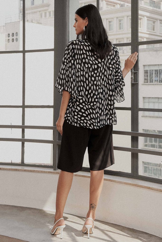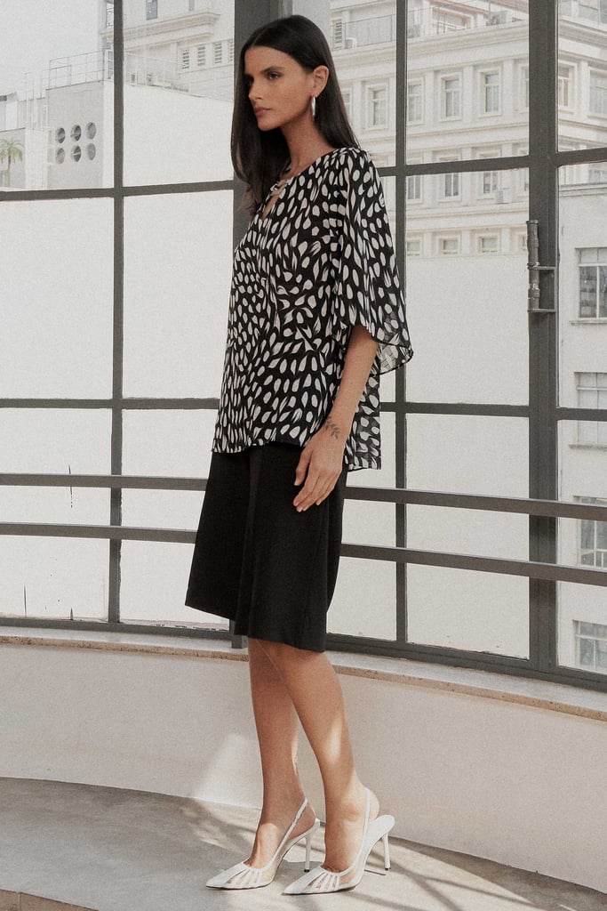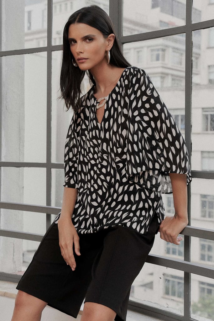 Blusa estampada confeccionada em chiffon maquinetado, leve e delicadamente texturizado. A peça se destaca pelo decote em V com detalhe em fivela de resina, que adiciona um toque sofisticado ao visual. As mangas 3/4 em formato sino garantem fluidez e movimento, criando uma silhueta elegante com caimento suave. Ideal para compor looks versáteis que transitam do trabalho aos encontros sociais com naturalidade.