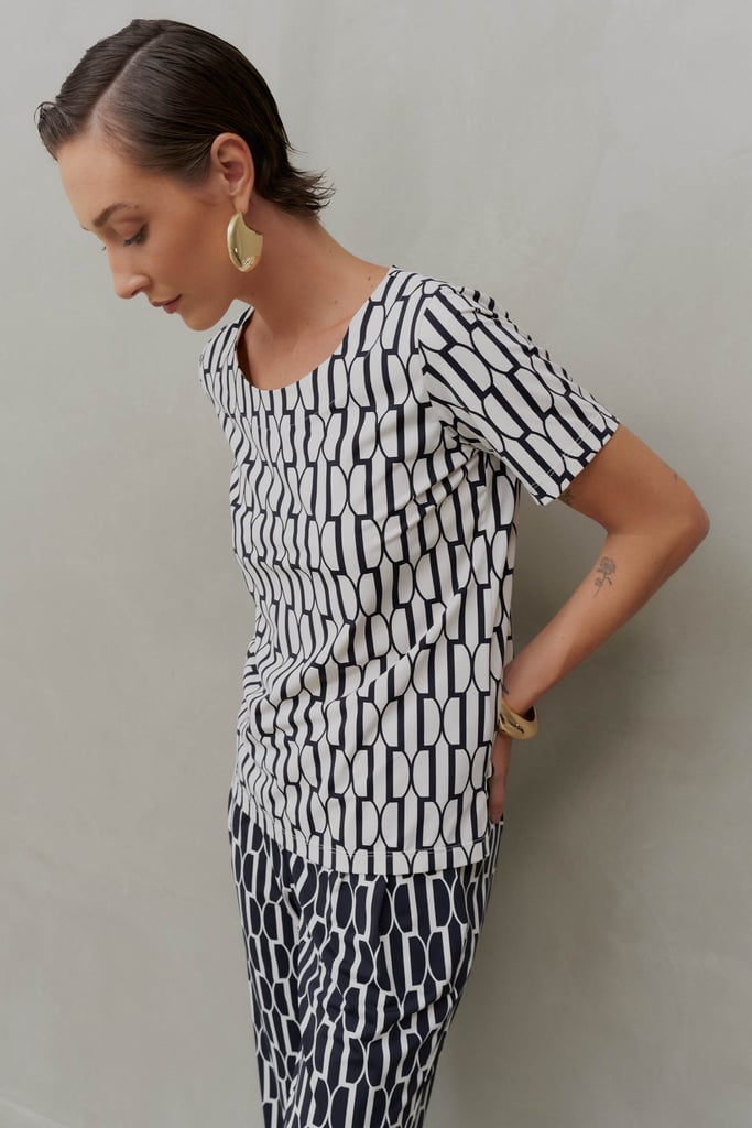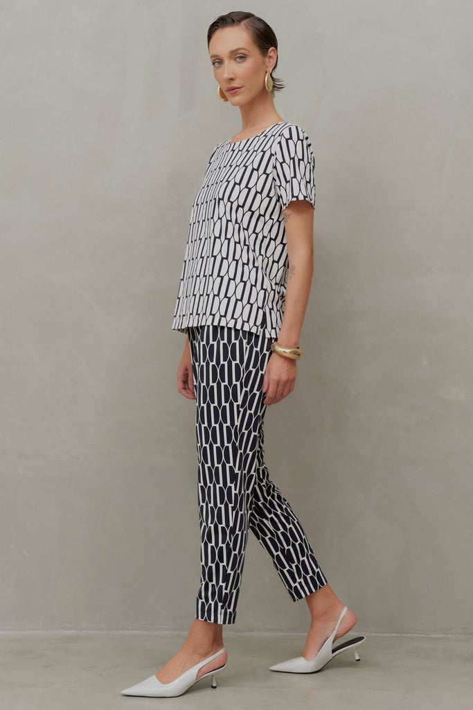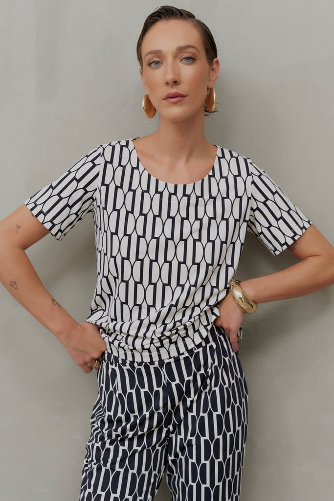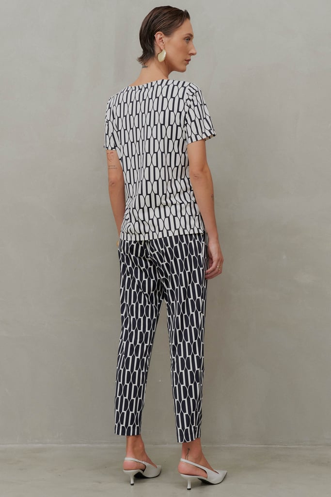 Confeccionado em fluity, tecido leve e geladinho que não amassa, este conjunto traz uma estampa exclusiva que combina modernidade e sofisticação. A blusa possui decote redondo e mangas curtas, oferecendo um visual leve e confortável. A calça de modelagem reta com bolsos laterais tipo faca garante um ajuste prático e elegante. Perfeito para quem busca estilo e praticidade no dia a dia.