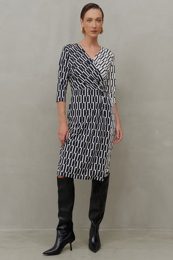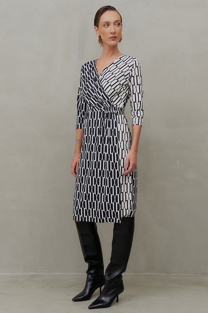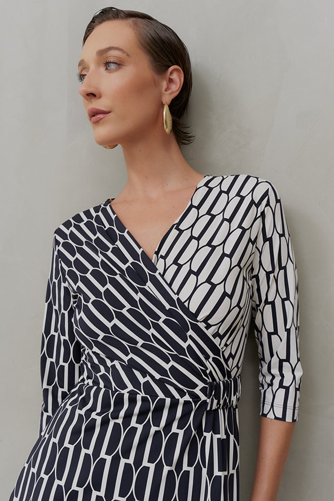 Delicado, moderno e versátil, este vestido em Fluity é ideal para quem busca conforto e sofisticação com um toque de originalidade. O design transpassado valoriza a silhueta de forma elegante, enquanto o elástico na cintura proporciona um ajuste confortável e prático. As mangas 3/4 adicionam um charme atemporal, perfeito para diferentes estações. A estampa exclusiva traz um jogo de positivo e negativo, criando um efeito visual dinâmico que adiciona modernidade e um toque sutilmente divertido à peça. O tecido premium oferece um toque geladinho, elasticidade e um caimento impecável, além da praticidade de não amassar. Uma escolha sofisticada para diversas ocasiões, do casual ao mais refinado.