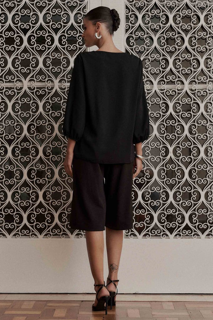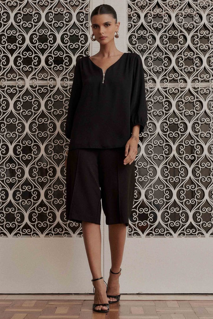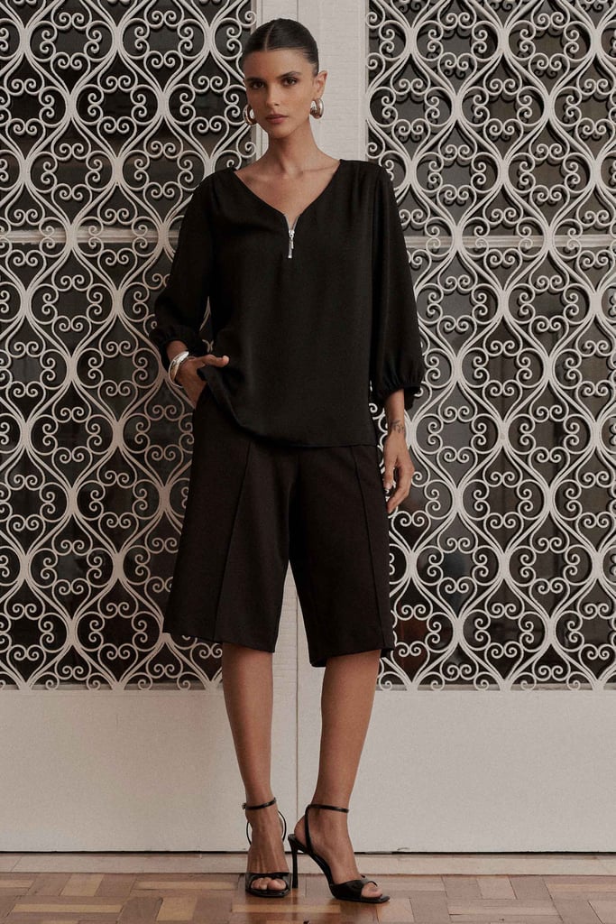 Blusa confeccionada em crepe liso, com caimento leve e elegante. O decote em V é valorizado pelo detalhe de zíper metálico, que adiciona um toque contemporâneo ao visual. As pregas sutis nos ombros conferem delicadeza à peça, enquanto as mangas 3/4 com acabamento em elástico garantem conforto e praticidade. Uma peça curinga, ideal para compor looks versáteis e sofisticados no dia a dia.