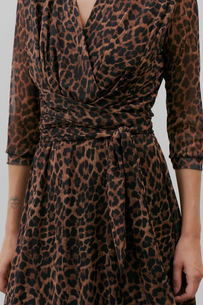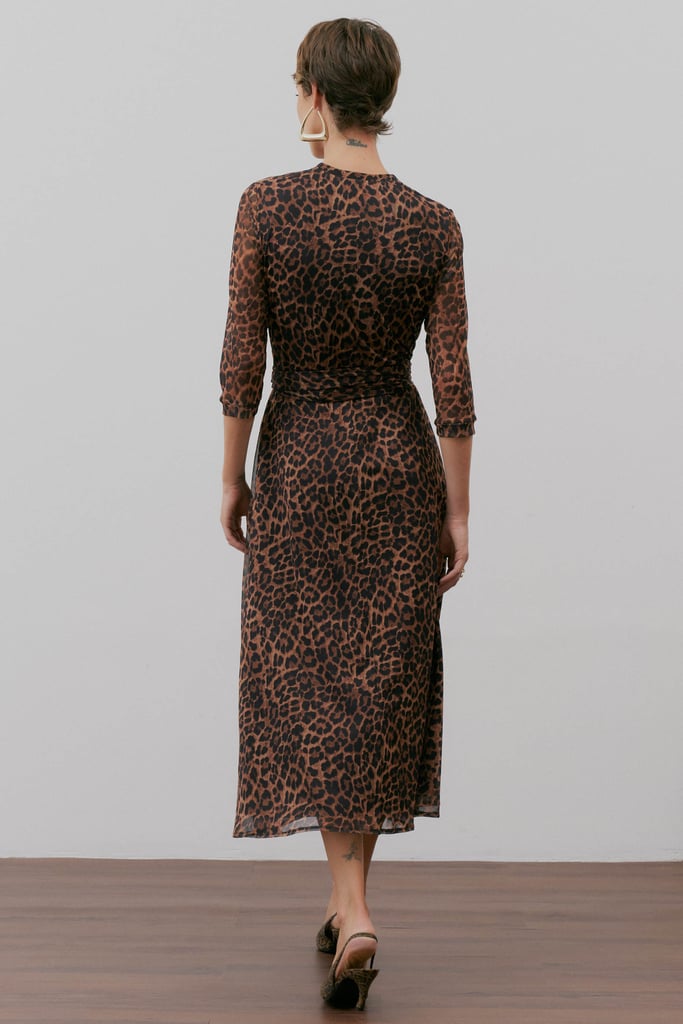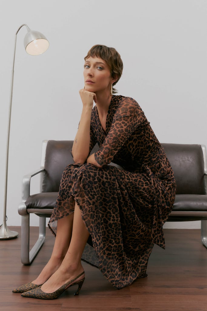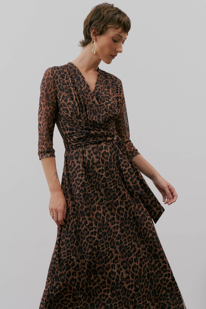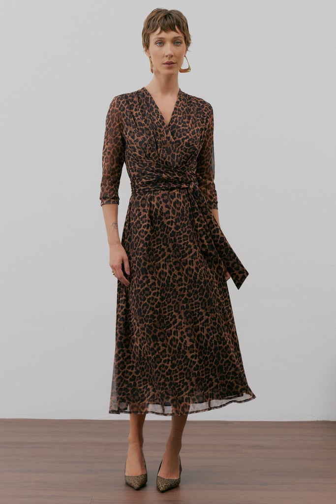 O vestido midi em tule estampado com padronagem de animal print é a expressão perfeita de elegância e charme atemporal. O decote transpassado cria um drapeado delicado na parte frontal, enquanto as tiras alongadas permitem múltiplas voltas e amarrações na cintura, realçando a silhueta de forma sofisticada e ajustável. As mangas 7/8 complementam o visual com um toque de delicadeza, equilibrando a leveza do tule com a elegância do comprimento midi. A peça é forrada, garantindo conforto e caimento impecável, enquanto o tule traz um efeito visual leve e fluido. Com seu design versátil, o vestido transita facilmente entre produções casuais e formais, sempre com um toque refinado e feminino.