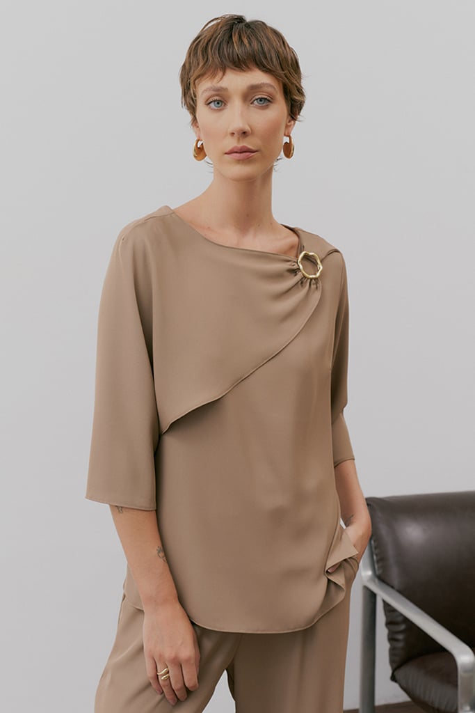Elegância e sofisticação definem este conjunto em crepe premium, ideal para quem busca um look refinado e versátil. A blusa apresenta um decote redondo com pala sobreposta, criando um efeito moderno e fluido, e é finalizada com um detalhe de aviamento dourado orgânico no ombro, conferindo um toque de exclusividade. As mangas 3/4 trazem equilíbrio ao design. Já a calça reta clássica possui pregas frontais, bolsos laterais tipo faca e cós com elástico nas costas, garantindo conforto sem abrir mão da elegância. Uma composição atemporal e sofisticada para diversas ocasiões.