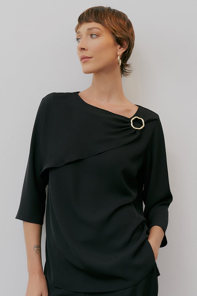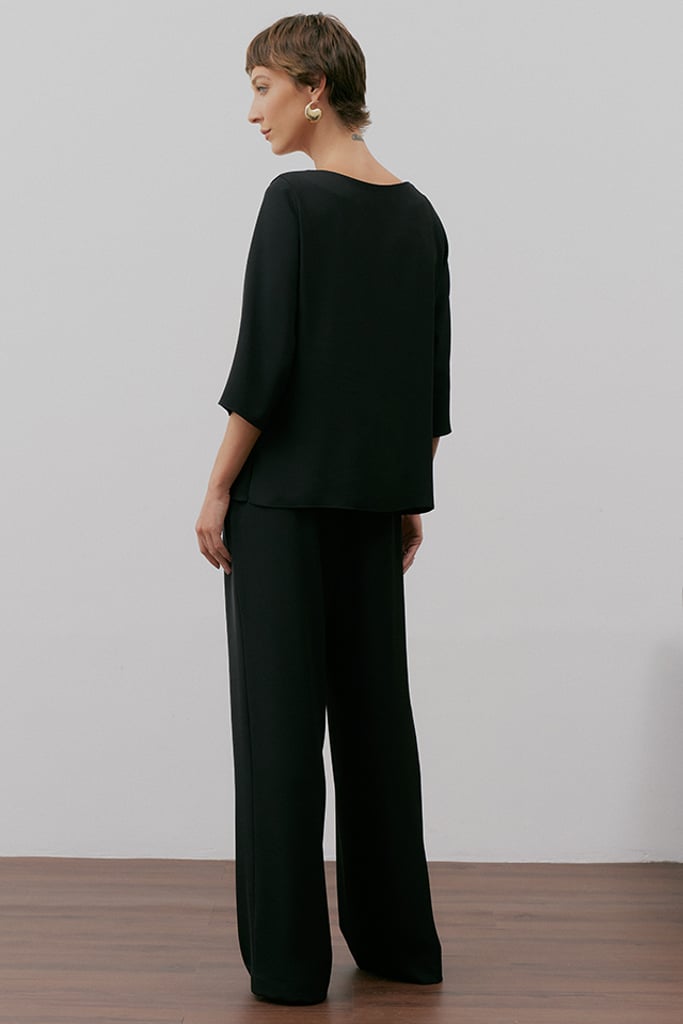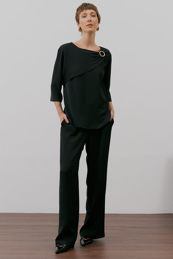 Elegância e sofisticação definem este conjunto em crepe premium, ideal para quem busca um look refinado e versátil. A blusa apresenta um decote redondo com pala sobreposta, criando um efeito moderno e fluido, e é finalizada com um detalhe de aviamento dourado orgânico no ombro, conferindo um toque de exclusividade. As mangas 3/4 trazem equilíbrio ao design. Já a calça reta clássica possui pregas frontais, bolsos laterais tipo faca e cós com elástico nas costas, garantindo conforto sem abrir mão da elegância. Uma composição atemporal e sofisticada para diversas ocasiões.