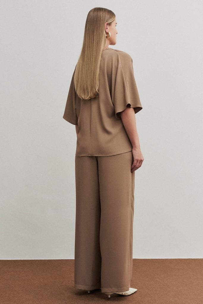 Conjunto confeccionado em crepe de toque macio e caimento impecável. A blusa traz decote transpassado com delicado franzido nos ombros e mangas amplas, que conferem leveza e sofisticação. A calça possui shape reto e elegante, com detalhe de transpasse frontal e amarração lateral que valoriza a silhueta. O cós com elástico nas costas garante conforto ao vestir, sem abrir mão da elegância.