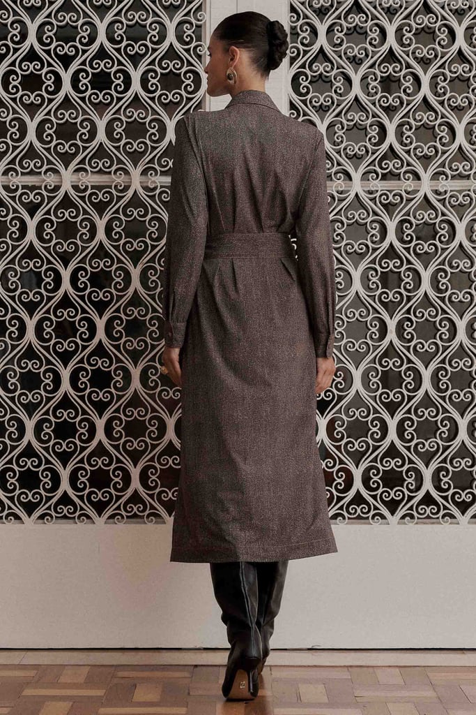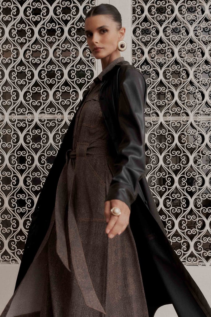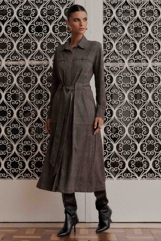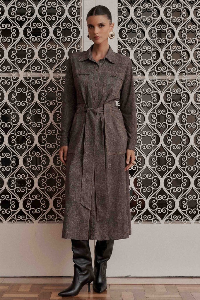 A chemise feminina midi é confeccionada em malha Fluity premium e apresenta uma padronagem exclusiva que remete ao jeans em uma versão leve e sofisticada. Com gola clássica de camisa e fechamento frontal por botões, o modelo traz mangas longas com punhos abotoados e bolsos estratégicos aplicados no busto e na saia, que equilibram funcionalidade e elegância. Acompanha faixa no mesmo tecido para acinturar e valorizar a silhueta de forma refinada. Com acabamento pespontado em toda a peça, esta chemise oferece caimento impecável, conforto e versatilidade. A malha Fluity proporciona toque macio e geladinho, é prática para o dia a dia e carrega atributos de sustentabilidade e tecnologia. Ideal para compor looks urbanos sofisticados, seja usada sozinha ou em sobreposição com casacos e botas para a temporada de frio.