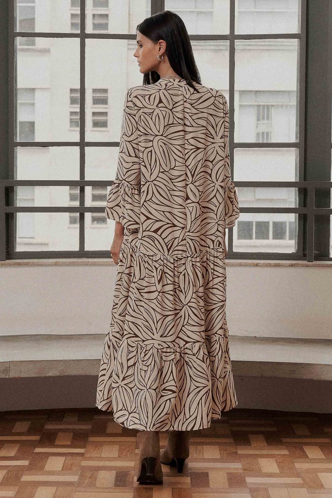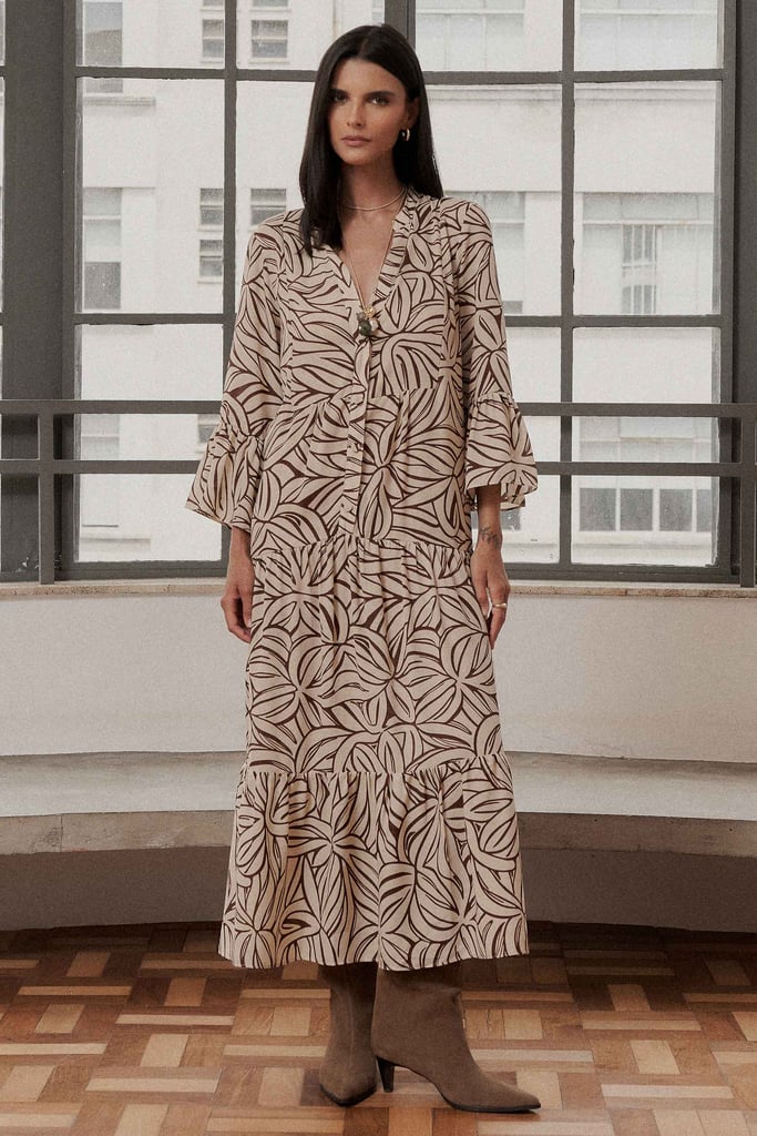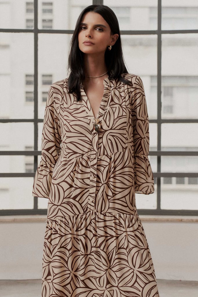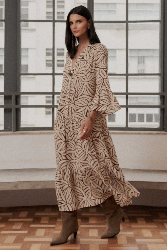 O vestido midi é confeccionado em tecido de crepe leve com estampa exclusiva de folhagens, trazendo um toque natural e contemporâneo à produção. Com gola padre e fechamento frontal por botões, o modelo combina sofisticação e leveza. A modelagem solta proporciona conforto absoluto, enquanto as mangas 3/4 com detalhe de babado adicionam movimento e feminilidade. A barra com babado aplicado reforça o efeito fluido da peça, criando um visual elegante e descontraído. Ideal para compor looks casuais com personalidade ou para ocasiões especiais em que o estilo descomplicado se destaca. O crepe garante um caimento impecável, valorizando a estampa e o conforto durante o uso.
