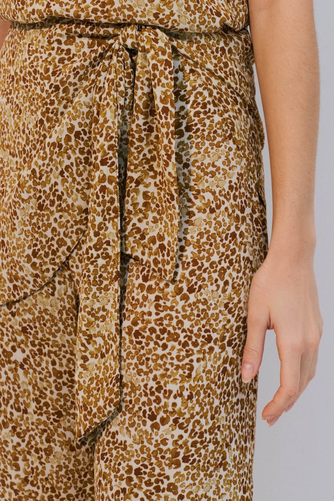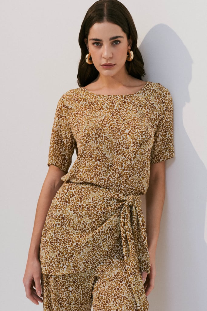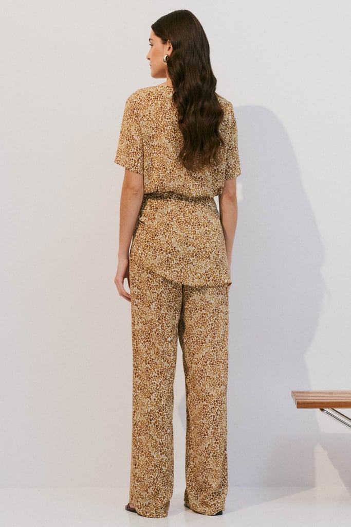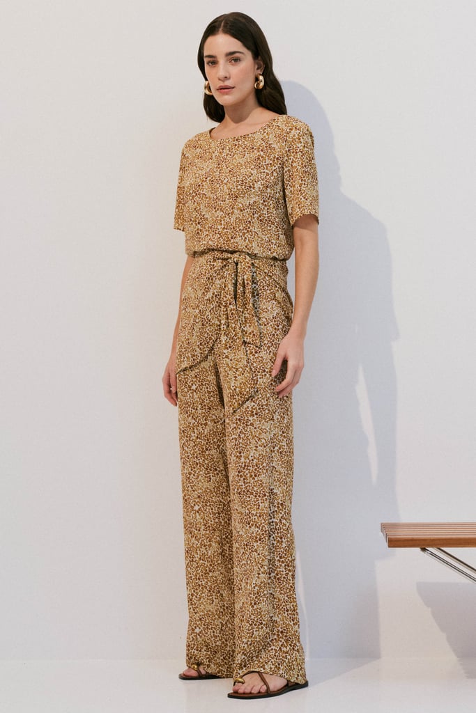 Conjunto confeccionado em chiffon estampado. A blusa tem decote redondo e mangas curtas. A calça apresenta cintura alta com elástico nas costas, garantindo melhor ajuste ao corpo. Destaque para o detalhe de sobreposição tipo pareô, no mesmo tecido, com amarração frontal que adiciona charme à peça. Fechamento por zíper e botão.