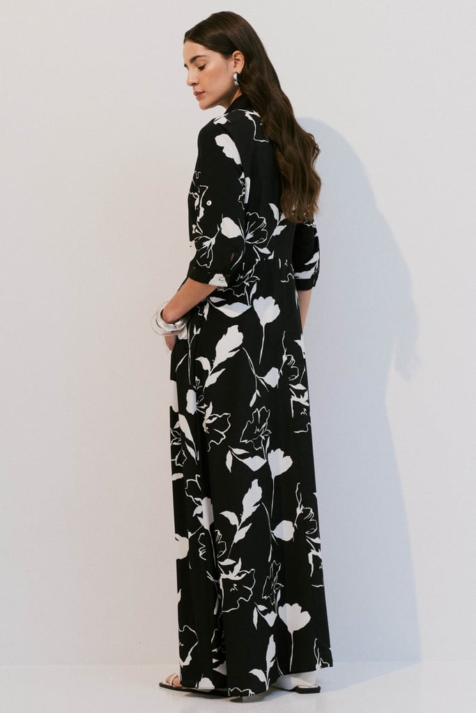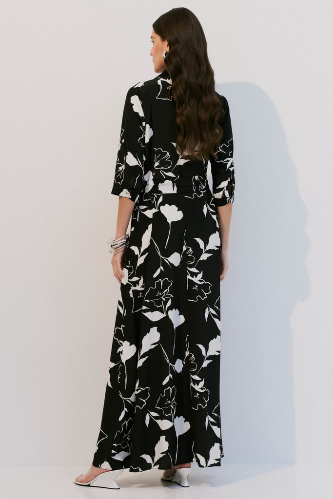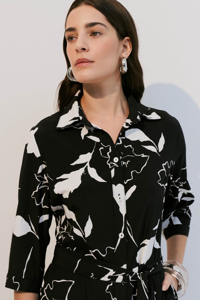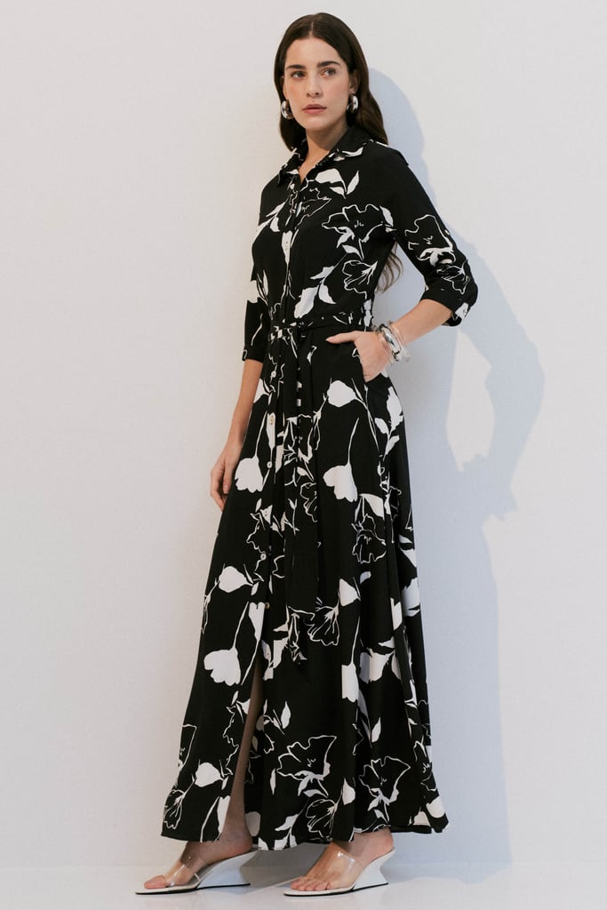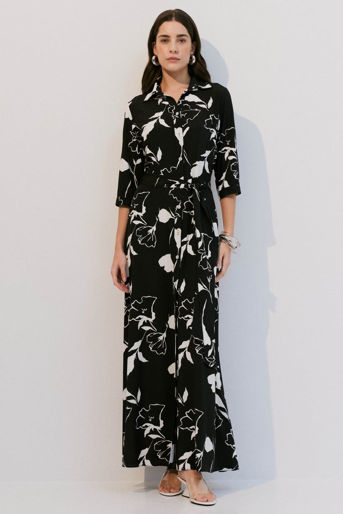 Vestido tipo chemise confeccionado em crepe leve com estampa floral. Possui gola de camisa, vista frontal com botões e bolsos laterais funcionais. As mangas 3/4 têm punho fechado por botão e detalhe de martingale. Acompanha faixa no mesmo tecido para amarração, permitindo ajustar a silhueta com praticidade e elegância.