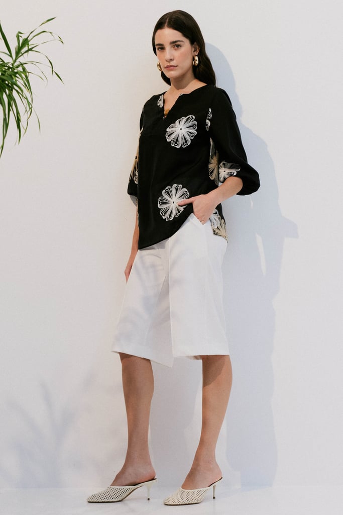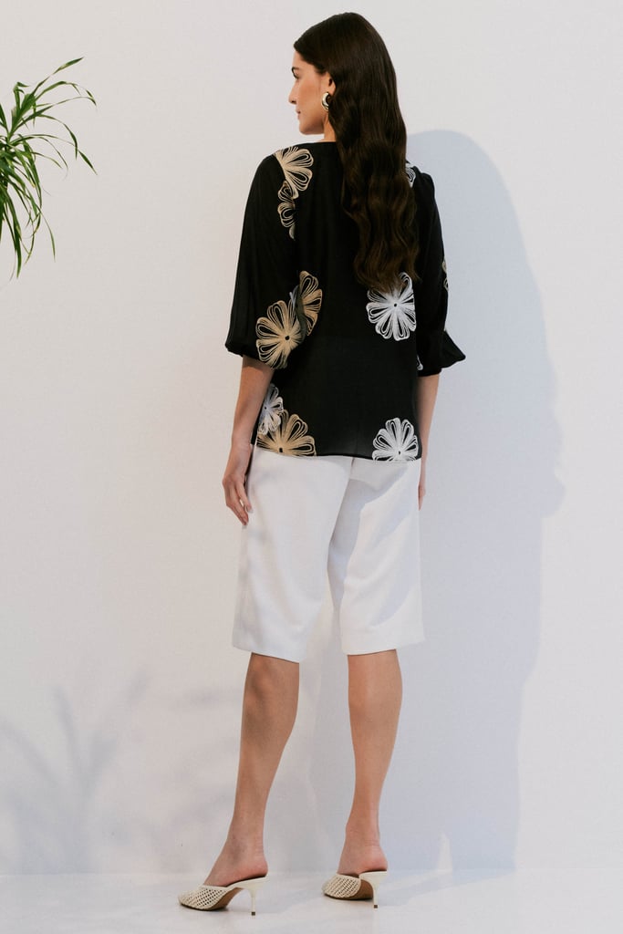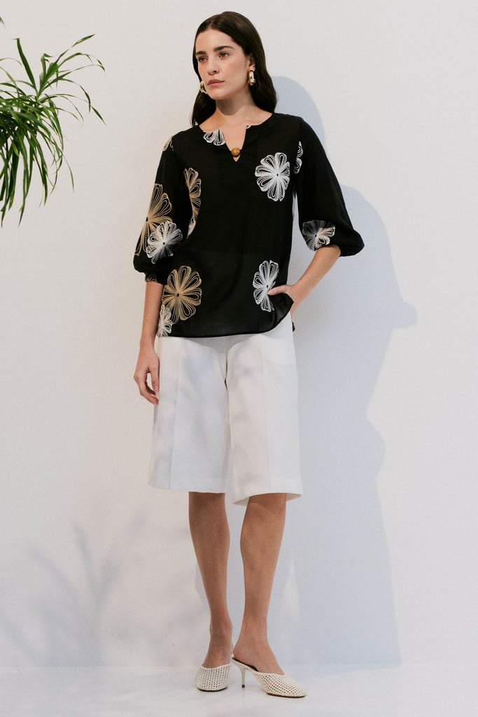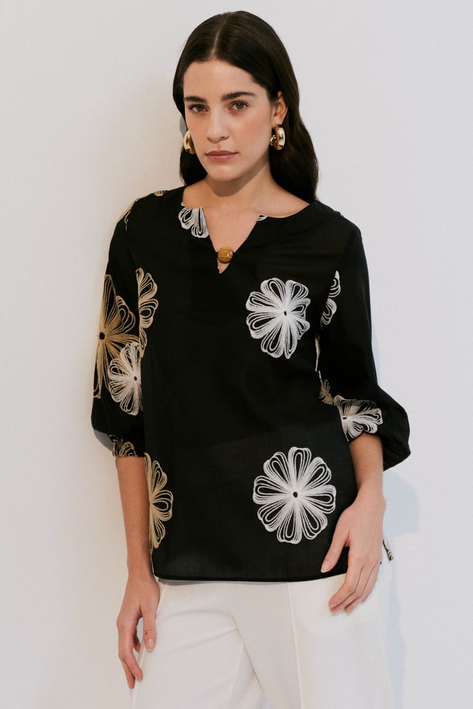 Confeccionada em voile leve com bordado floral, a blusa possui decote redondo com abertura e detalhe de aviamento em madeira, que acrescenta charme ao acabamento. As mangas 3/4 têm leve volume e terminação com elástico sutil, proporcionando conforto e um toque feminino à peça.