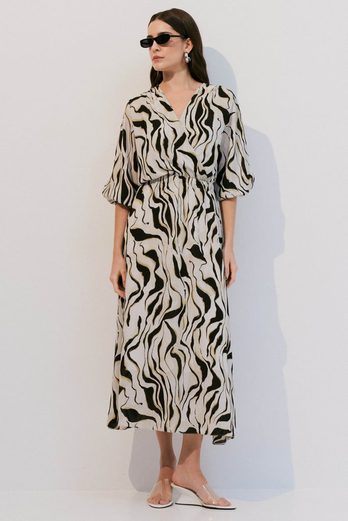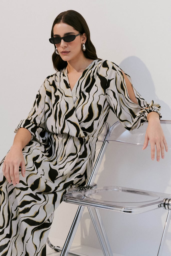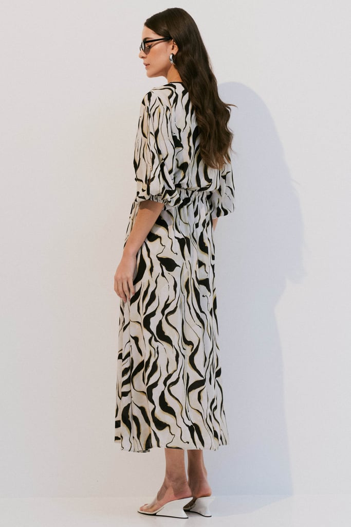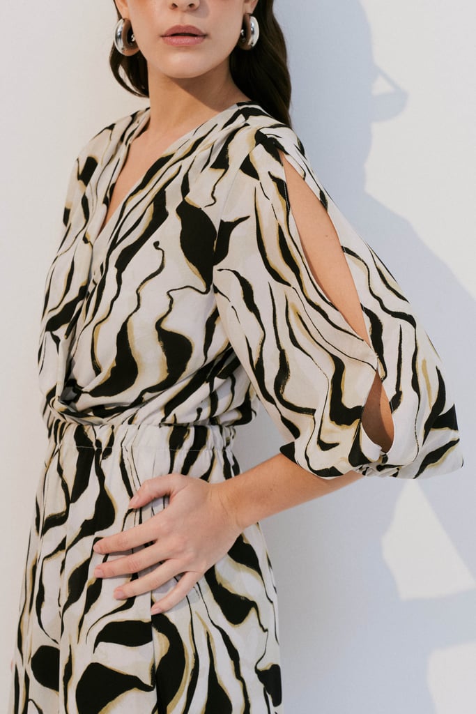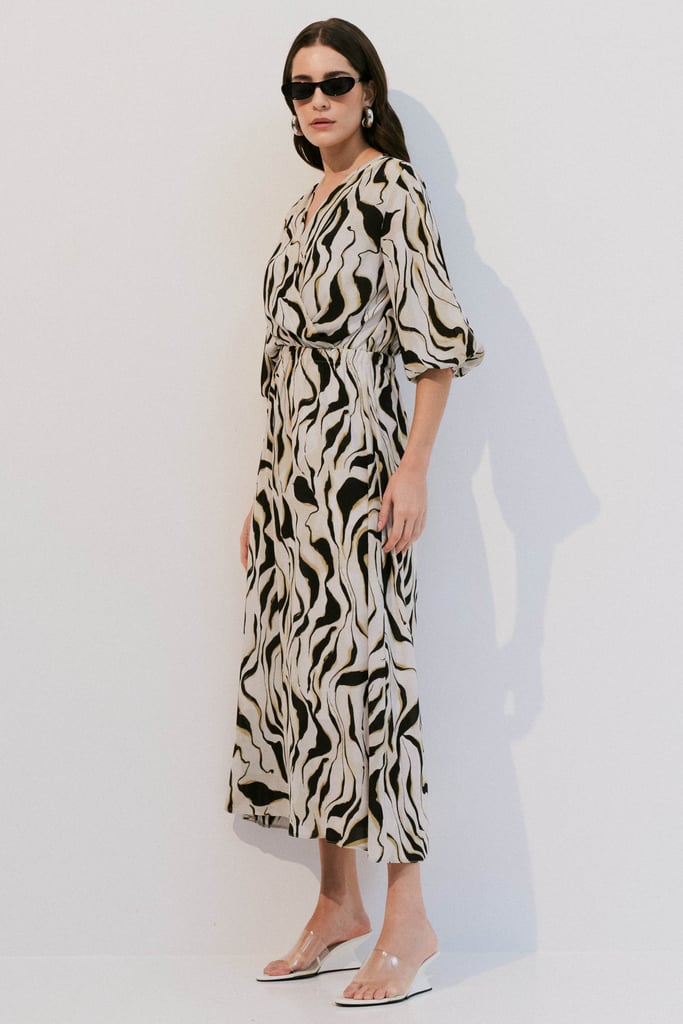 Confeccionado em crepe leve com estampa orgânica, o vestido possui decote transpassado e elástico na cintura, garantindo conforto e caimento ajustado ao corpo. As mangas 7/8 apresentam abertura delicada e terminação com elástico, criando um efeito moderno e feminino. Comprimento midi. Acompanha forro de anágua para maior conforto e segurança ao vestir.
