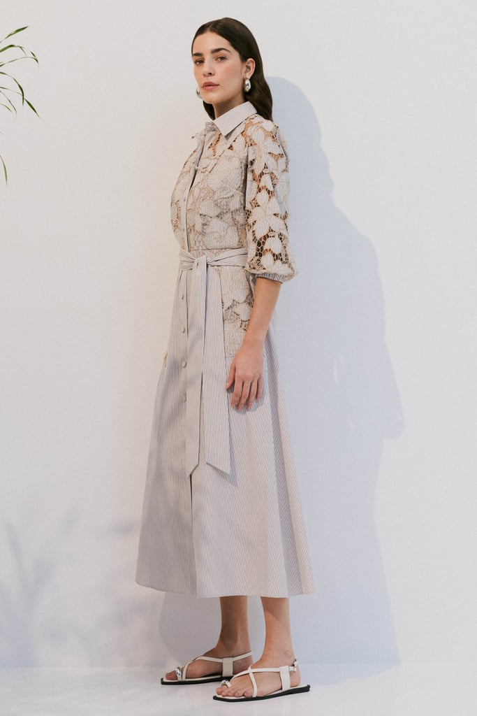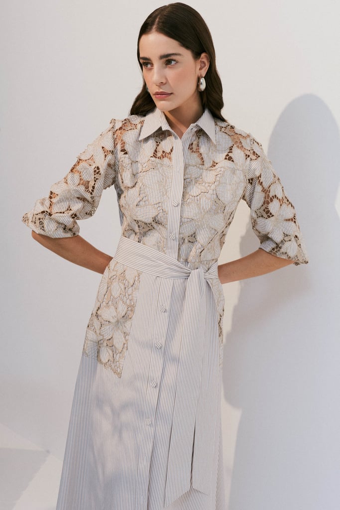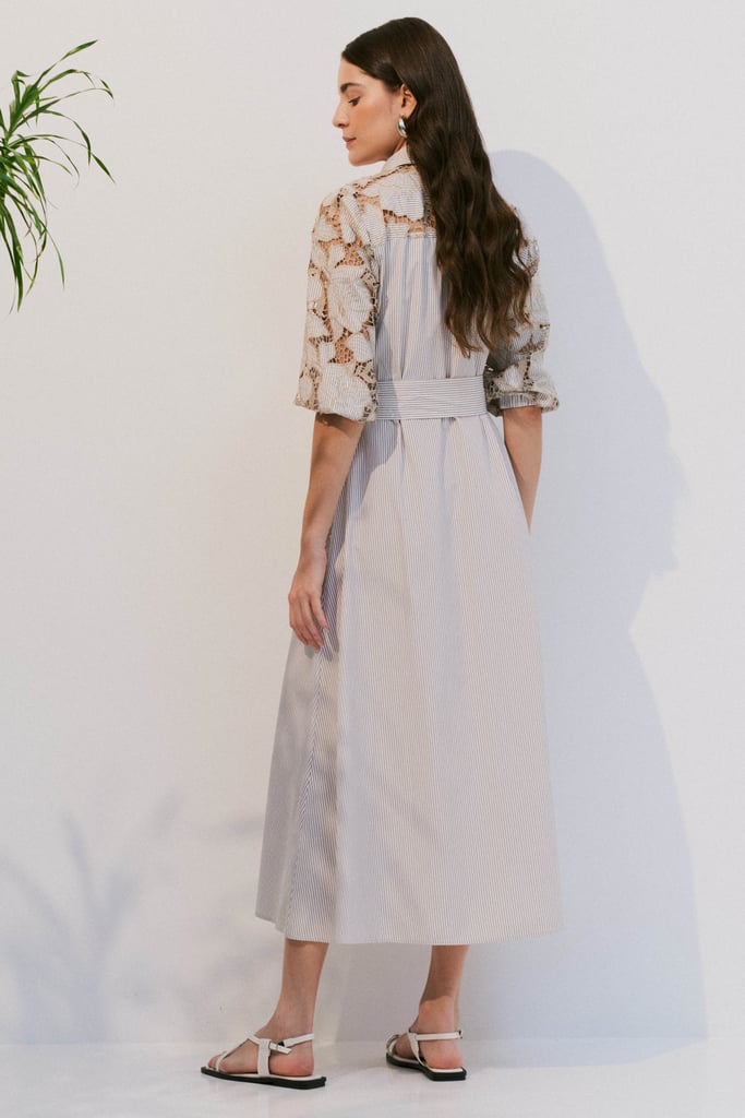 Confeccionada em tricoline listrada com aplicação de bordado floral, a peça une o clássico da modelagem chemise ao charme dos detalhes artesanais. Possui gola de camisa, fechamento frontal por botões forrados e bolsos sobrepostos. As mangas 3/4 têm terminação com elástico, e a faixa do mesmo tecido permite ajuste na cintura, valorizando a silhueta. Comprimento midi.