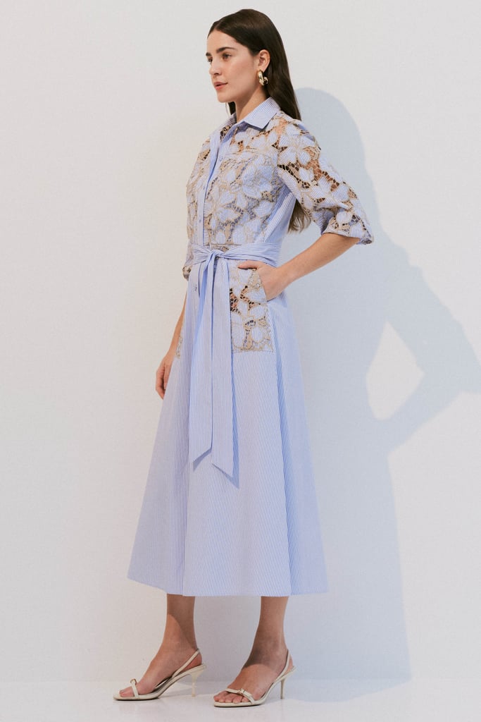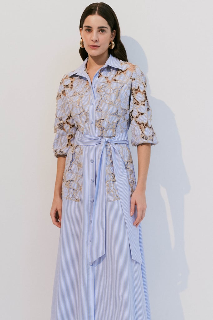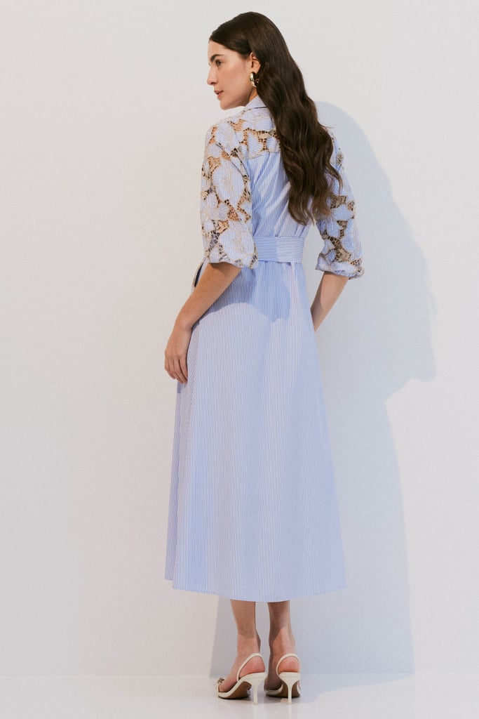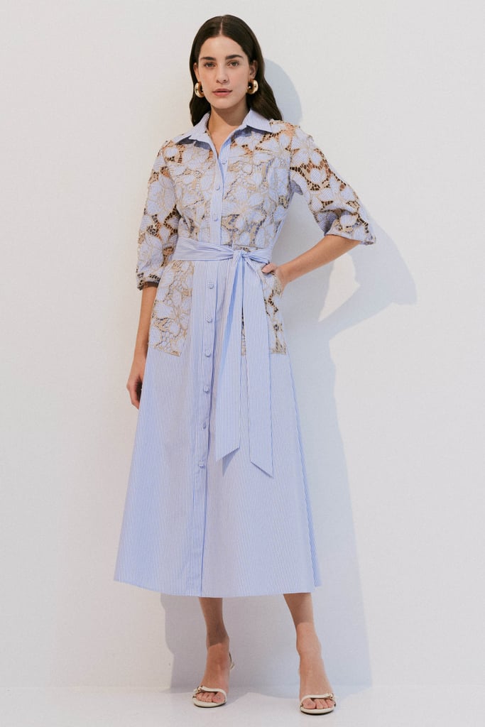 Confeccionada em tricoline listrada com aplicação de bordado floral, a peça une o clássico da modelagem chemise ao charme dos detalhes artesanais. Possui gola de camisa, fechamento frontal por botões forrados e bolsos sobrepostos. As mangas 3/4 têm terminação com elástico, e a faixa do mesmo tecido permite ajuste na cintura, valorizando a silhueta. Comprimento midi.
