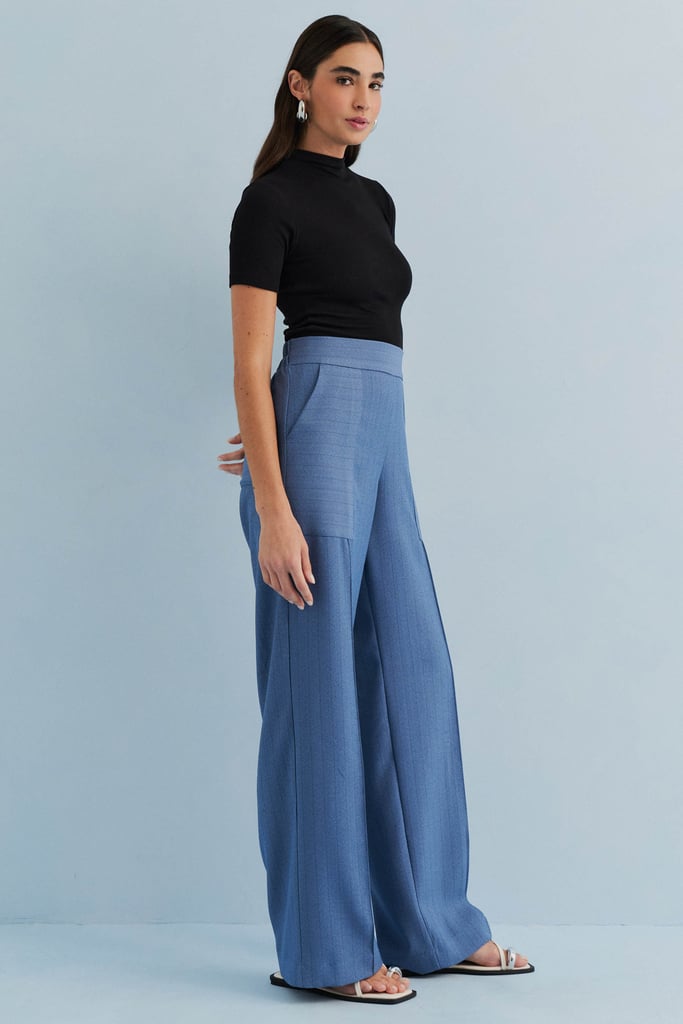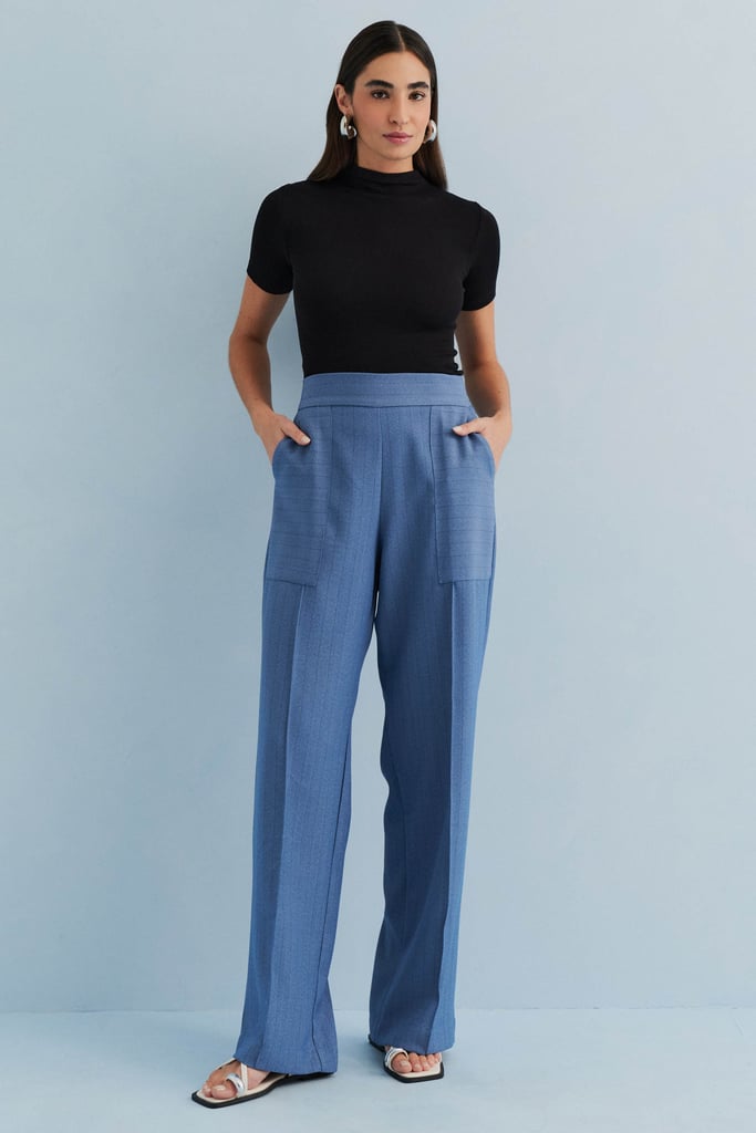 Calça confeccionada em crepe de alfaiataria com padronagem risca de giz, que une atemporalidade e um sutil jogo de linhas verticais e horizontais, conferindo sofisticação e originalidade à peça. Possui modelagem reta, bolsos frontais sobrepostos, nervura frontal e bolsos traseiros. O cós com elástico nas costas proporciona conforto sem abrir mão da elegância.