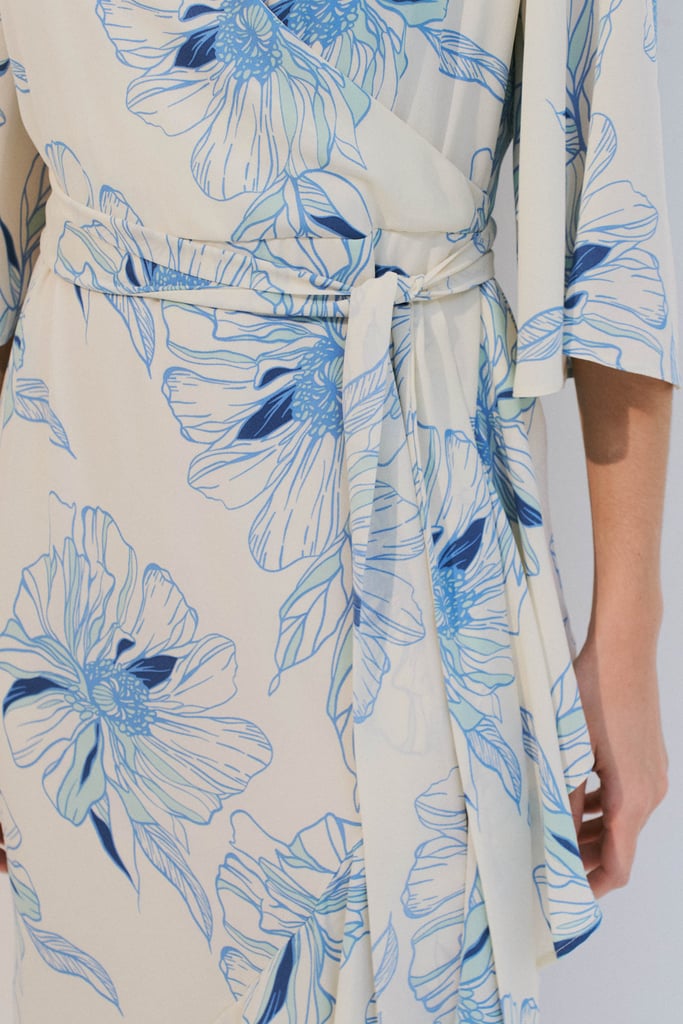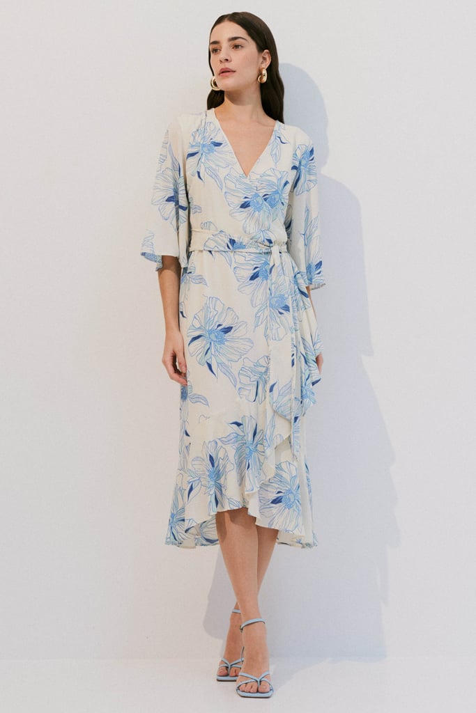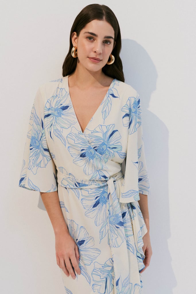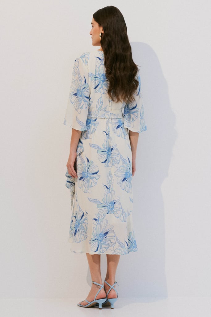 Confeccionado em crepe leve com estampa floral, o vestido possui decote transpassado e mangas 3/4 tipo sino, que trazem movimento e elegância à peça. O detalhe de babado na saia acrescenta fluidez ao caimento, enquanto a faixa fixada na lateral permite ajuste com charme e praticidade. Uma escolha feminina e atemporal para diversas ocasiões.