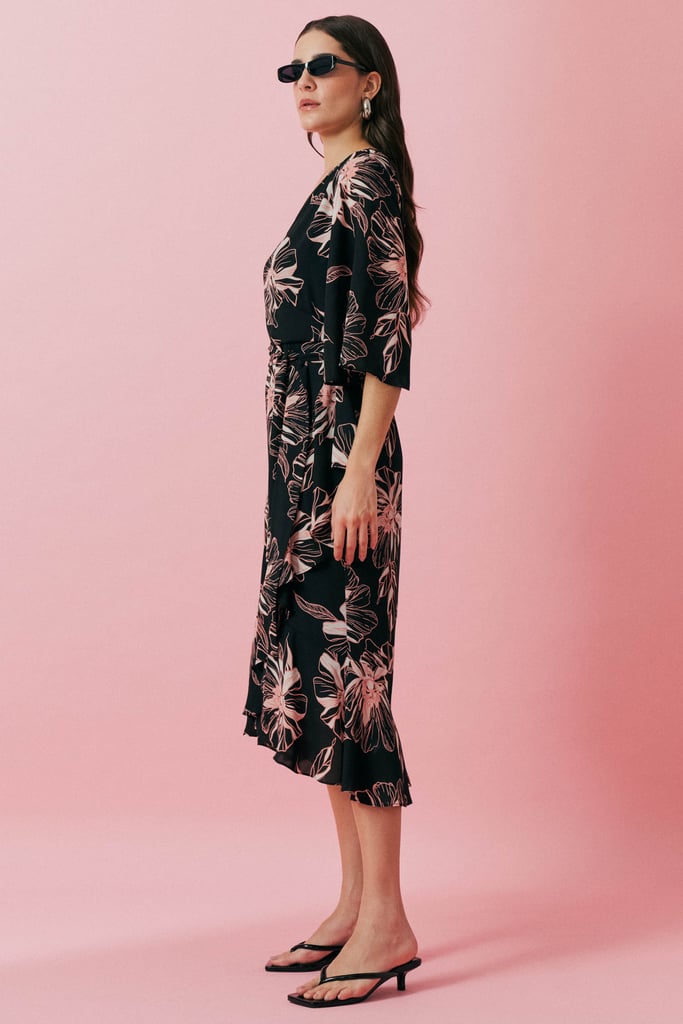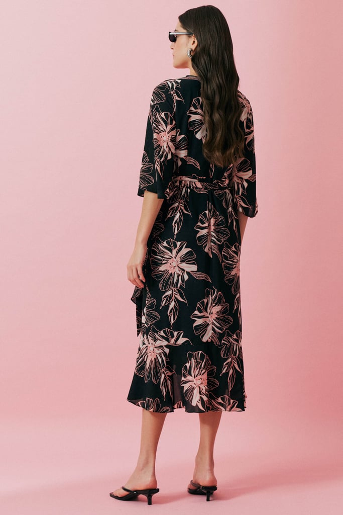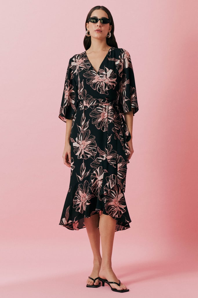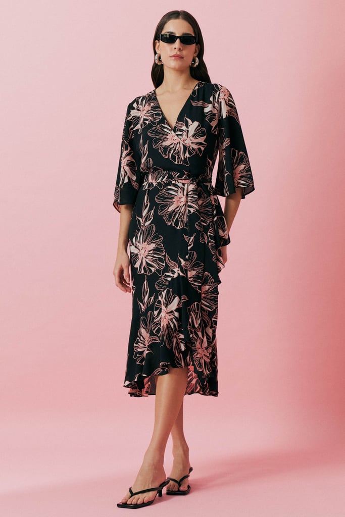 Confeccionado em crepe leve com estampa floral, o vestido possui decote transpassado e mangas 3/4 tipo sino, que trazem movimento e elegância à peça. O detalhe de babado na saia acrescenta fluidez ao caimento, enquanto a faixa fixada na lateral permite ajuste com charme e praticidade. Uma escolha feminina e atemporal para diversas ocasiões.
