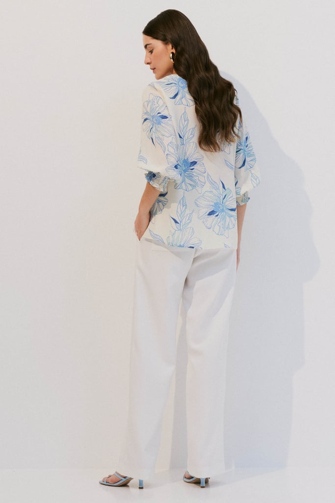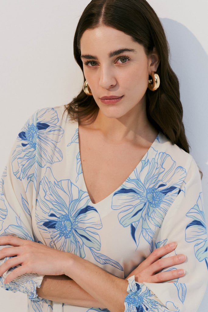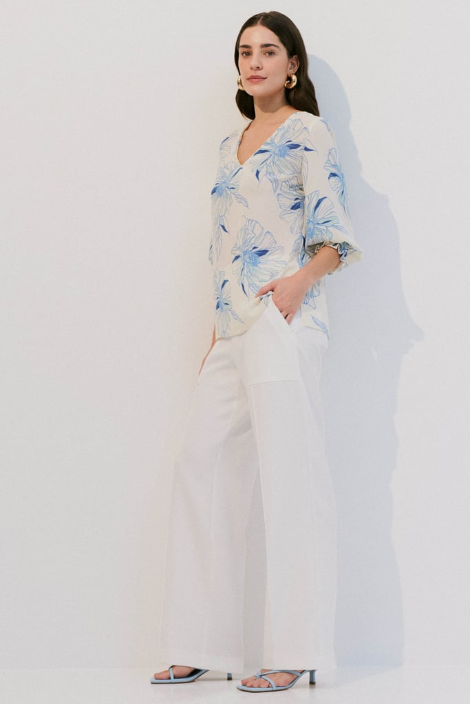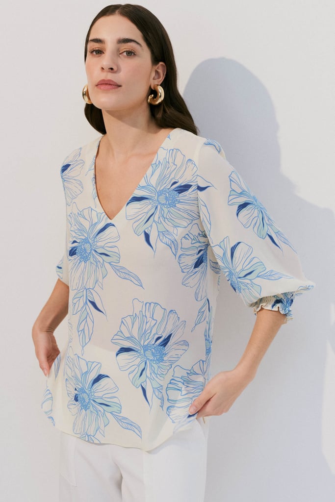 Confeccionada em crepe leve com estampa floral, a blusa possui decote V e mangas 3/4 com acabamento em lastex, que proporciona leve volume e conforto. O caimento solto valoriza diferentes silhuetas, tornando a peça uma escolha versátil para looks casuais com elegância.