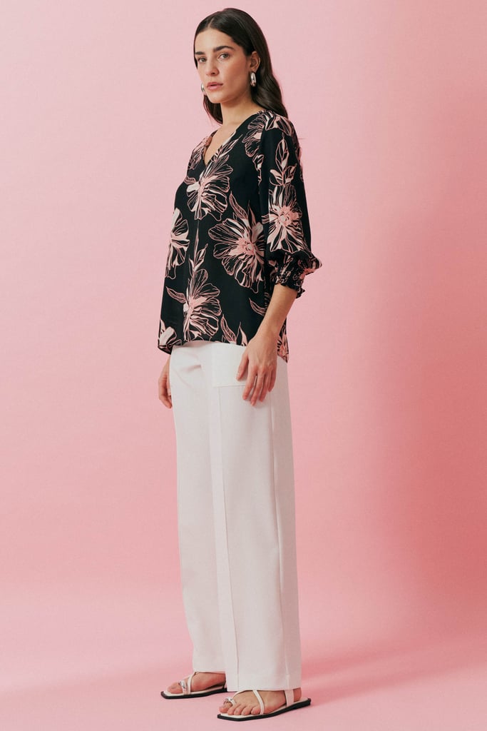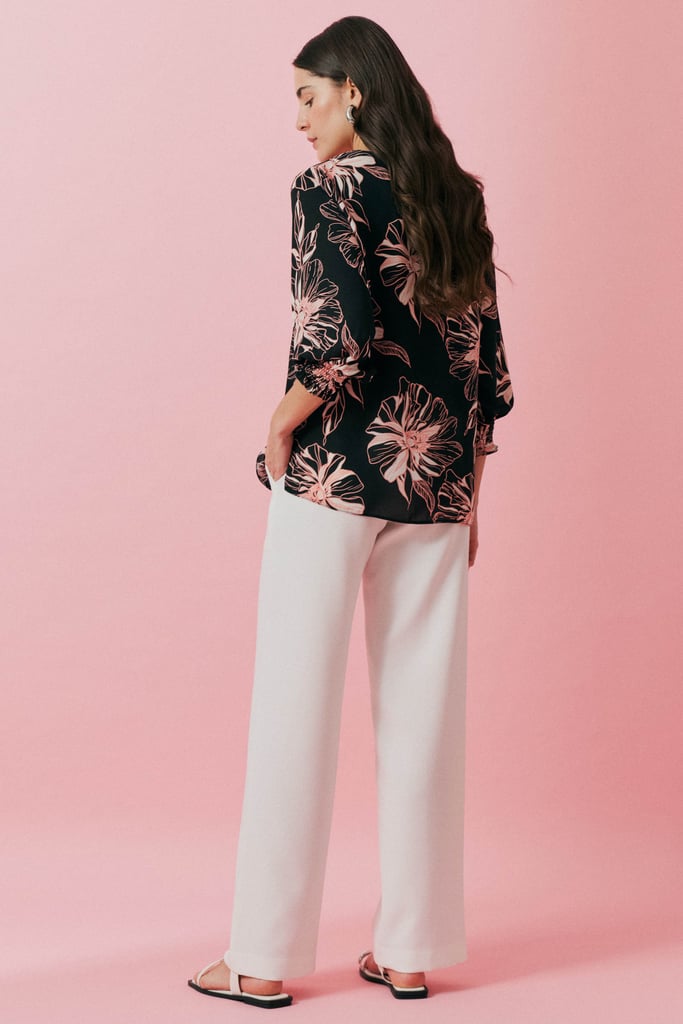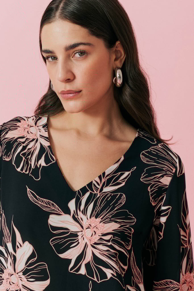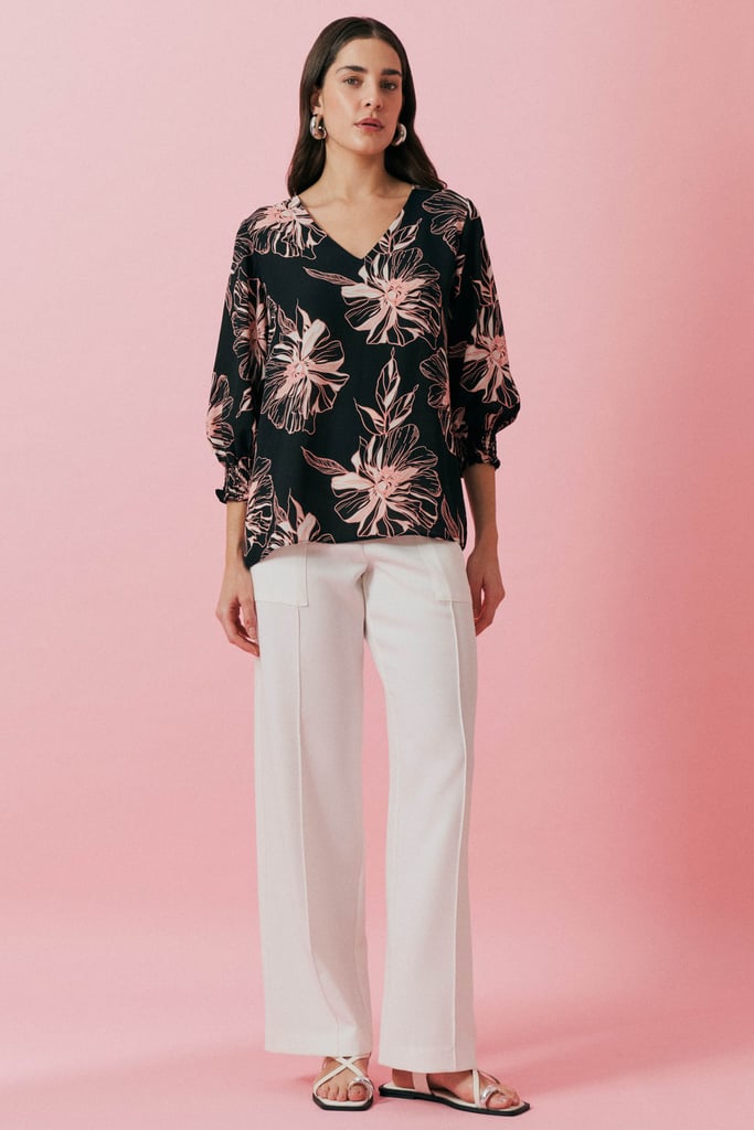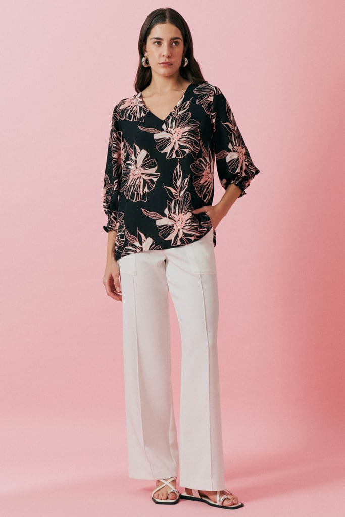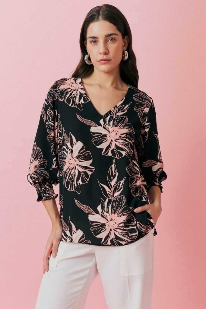 Confeccionada em crepe leve com estampa floral, a blusa possui decote V e mangas 3/4 com acabamento em lastex, que proporciona leve volume e conforto. O caimento solto valoriza diferentes silhuetas, tornando a peça uma escolha versátil para looks casuais com elegância.