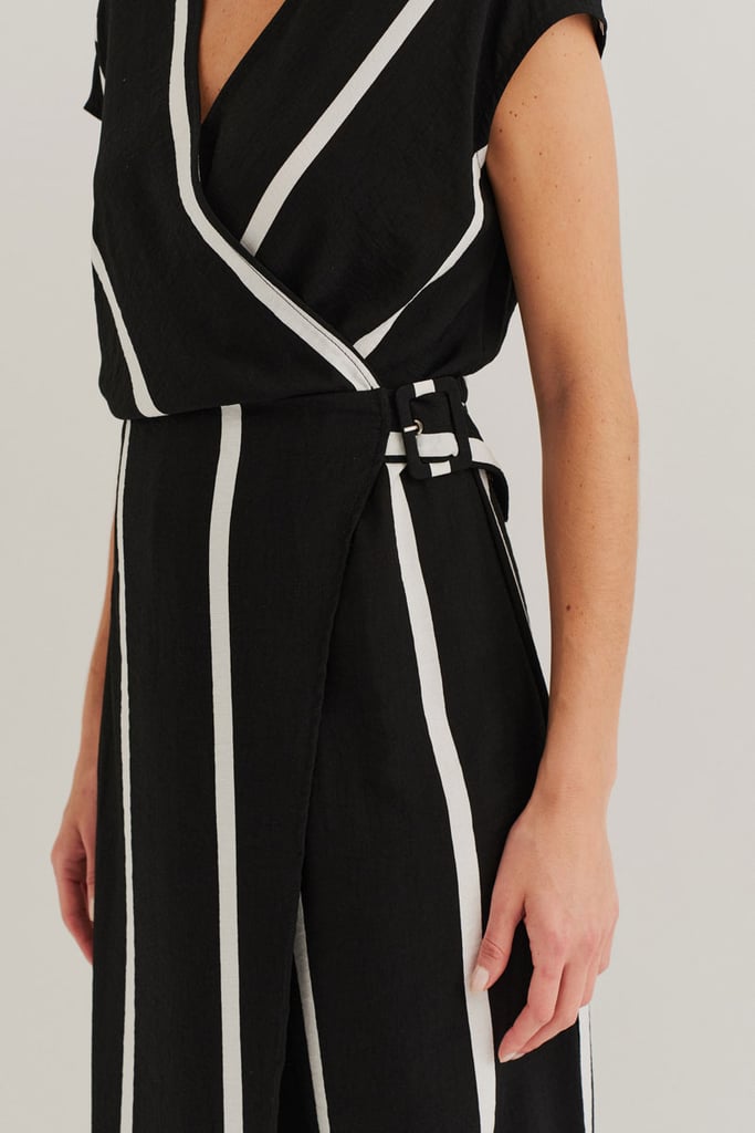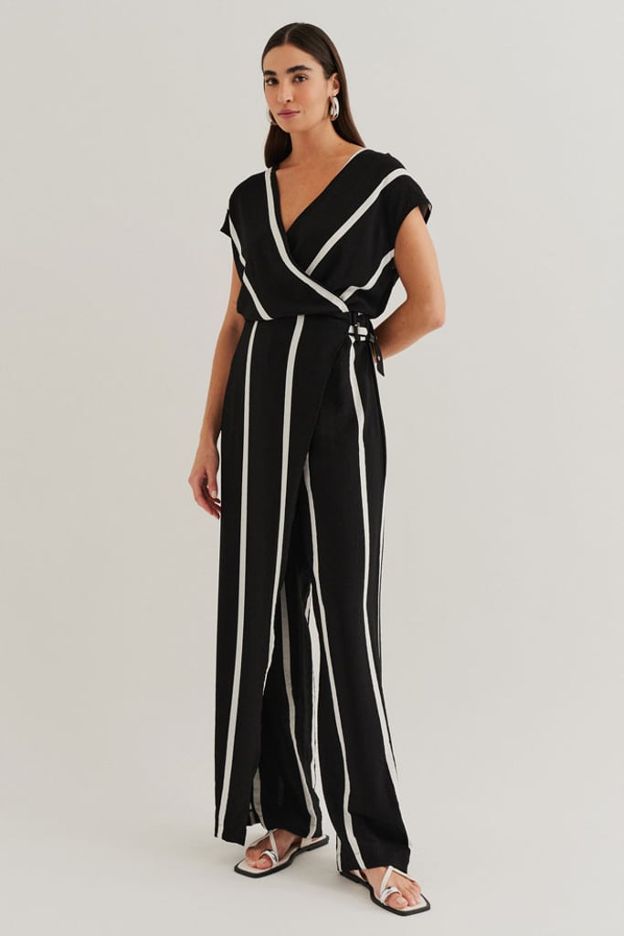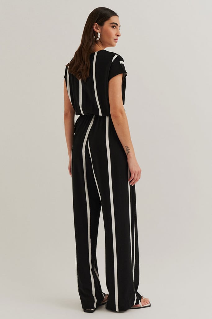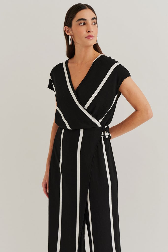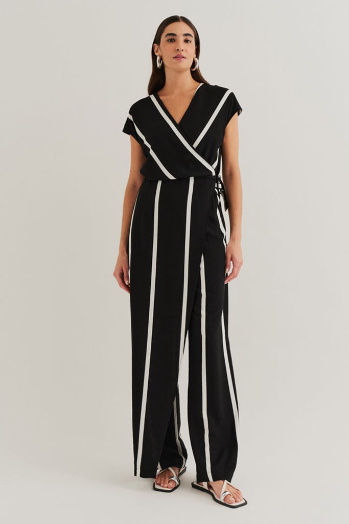 Macacão confeccionado em crepe estampado com padronagem listrada. Possui decote transpassado, calça modelagem reta com transpasse fixado por fivela de regulagem e elástico interno na cintura para maior conforto.