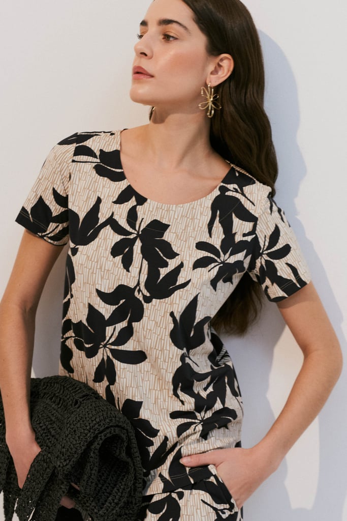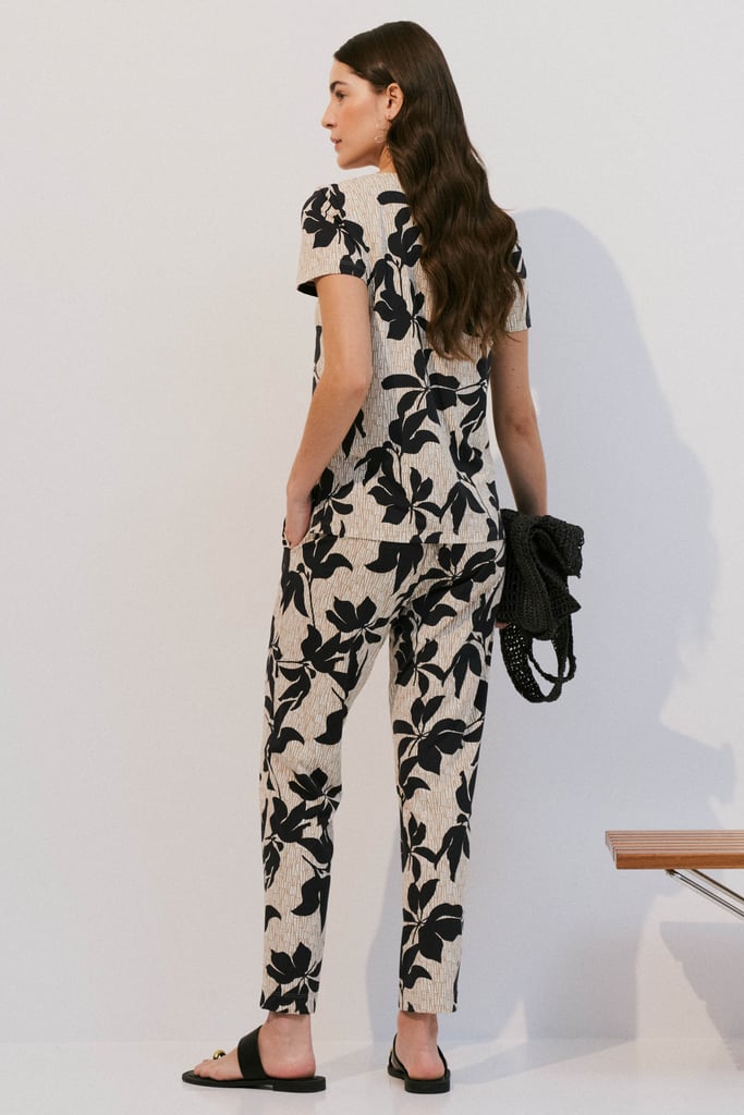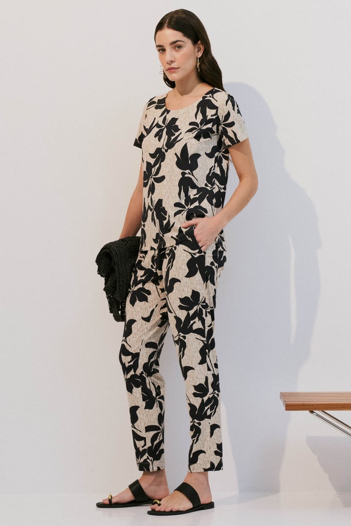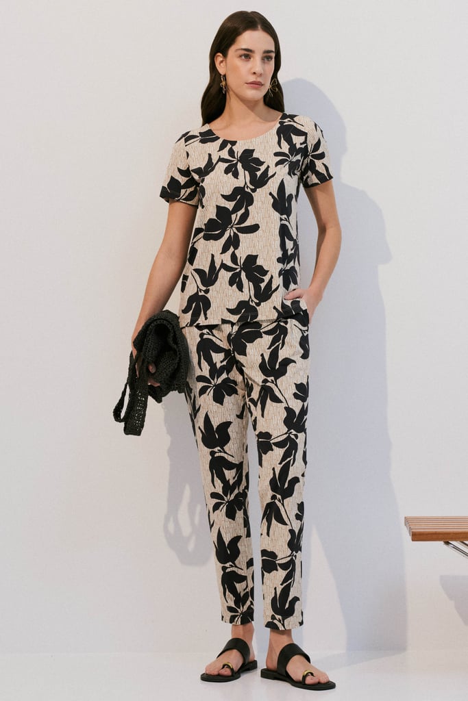 Conjunto confeccionado em malha Fluity com estamparia exclusiva. A blusa tem decote redondo e mangas curtas, com caimento leve e moderno. A calça apresenta modelagem clássica reta com pregas frontais, bolsos laterais e cós com elástico nas costas, garantindo conforto sem abrir mão da elegância. A malha Fluity é um tecido premium, com toque geladinho e macio, que não amassa, seca rápido e oferece alta durabilidade. Além disso, é sustentável e tecnologicamente avançado.