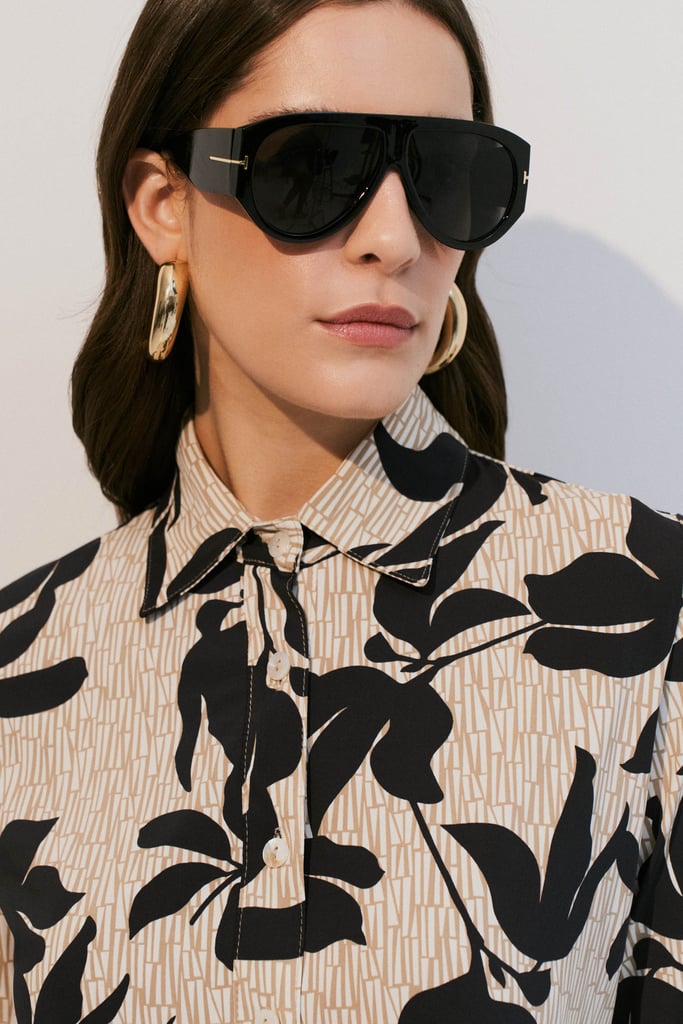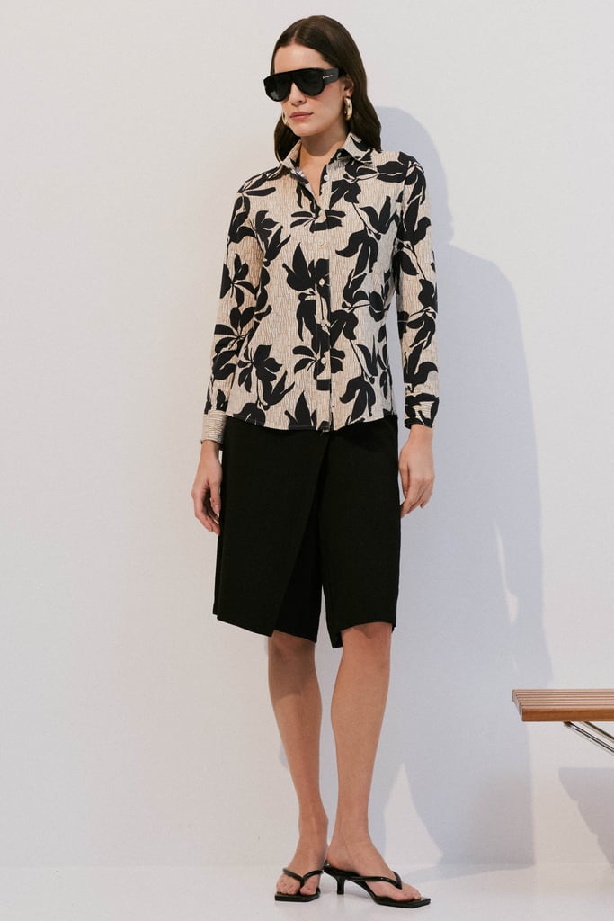 Camisa confeccionada em malha Fluity com estamparia exclusiva. Possui gola de camisa, fechamento frontal por botões e mangas longas com punho. O caimento é leve e elegante, ideal para composições que aliam conforto e sofisticação. A malha Fluity é um tecido premium, com toque geladinho e macio, que não amassa, seca rápido e oferece alta durabilidade. Além disso, é sustentável e tecnologicamente avançado.